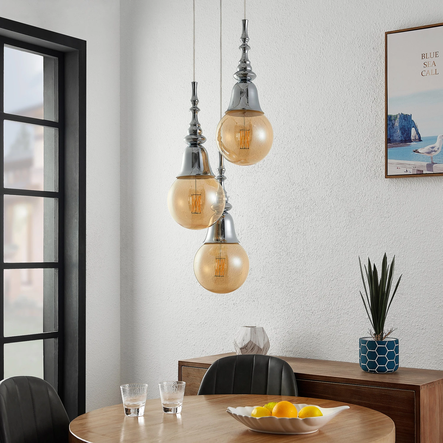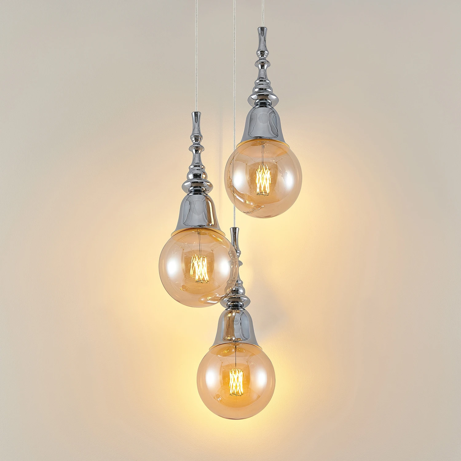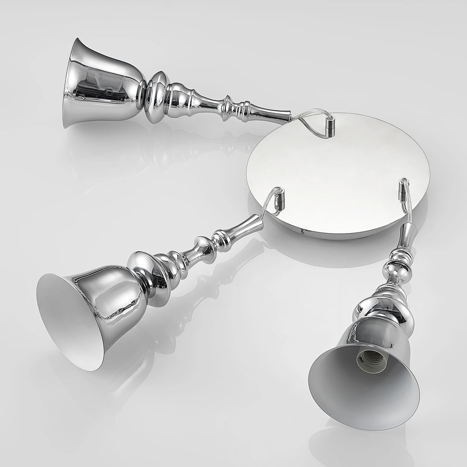 Chrom trifft auf barocke Formen: die schirmfreie Pendellampe Gesja in dreiflammiger Variante
