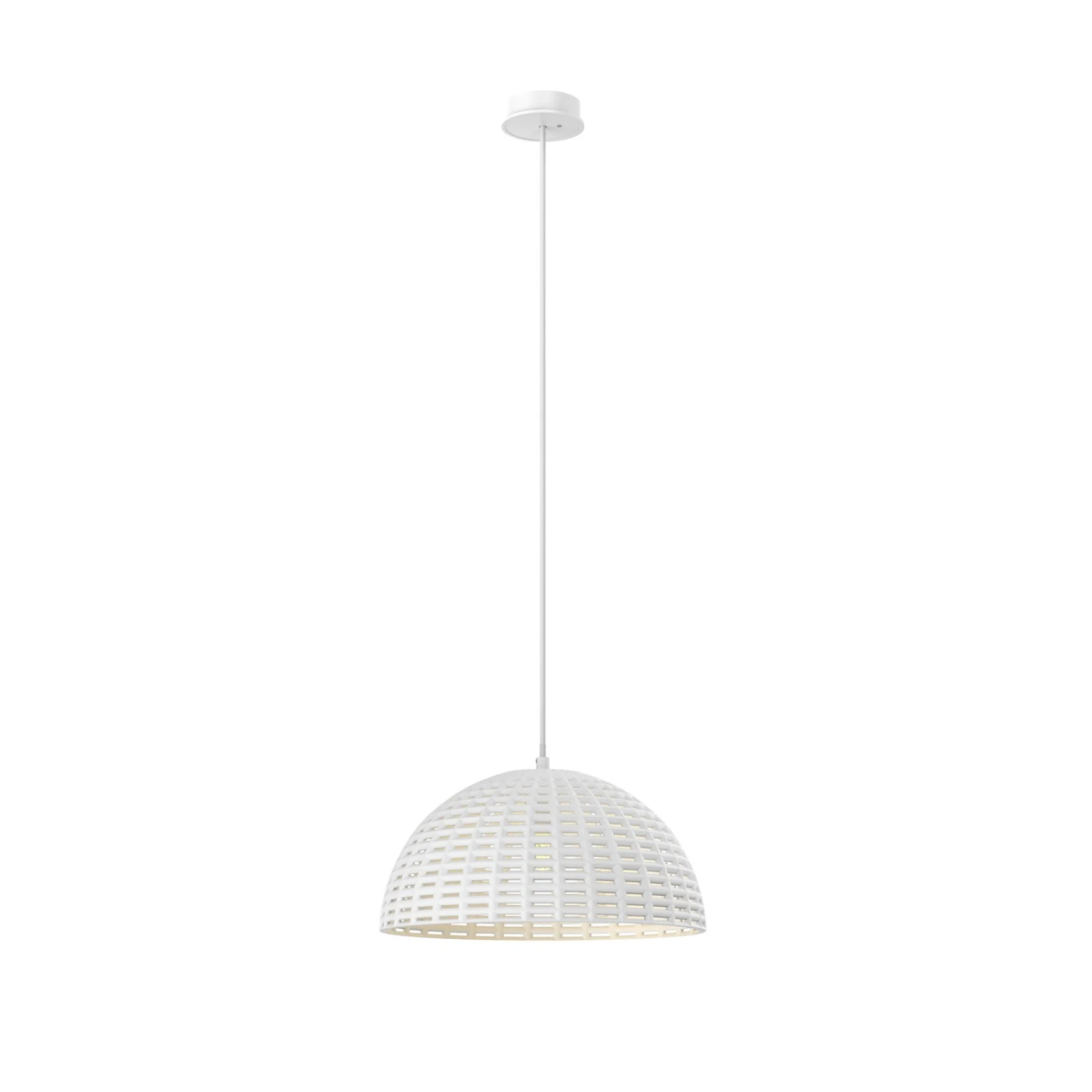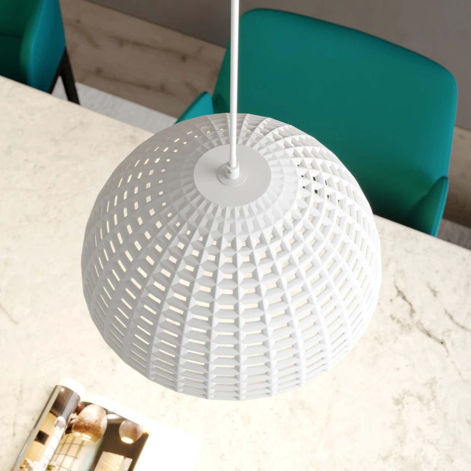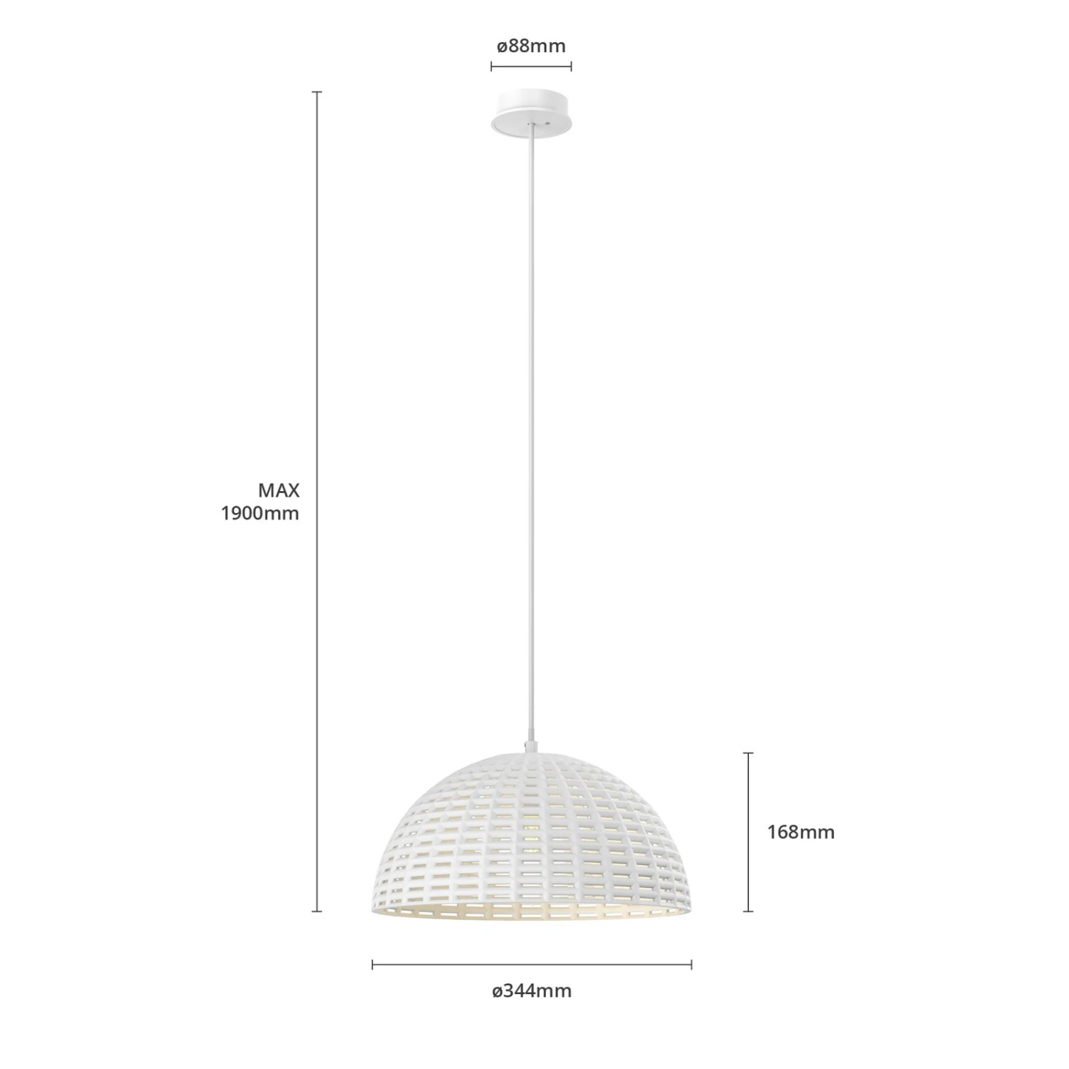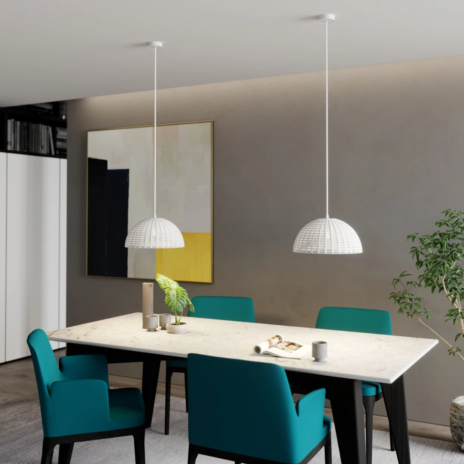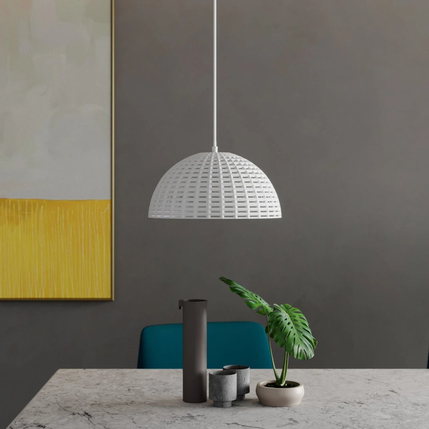 Aus weißem Gips gefertigt ist der schlichte und dennoch beeindruckende Lampenschirm der Pendelleuchte Herdis. Er ist durchbrochen mit einem regelmäßigen Muster, welches bei Einschalten des Lichts effektvoll Licht und Schatten in die Umgebung abgibt. Neben der direkten Beleuchtung der darunter liegenden Fläche, wie zum Beispiel einem Esstisch, sorgt dieser Effekt für eine stimmungsvolle Atmosphäre. Die Leuchte Herdis ist daher sehr gut einsetzbar in modernen Wohnräumen. Mit ihrer schlichten Eleganz fügt sie sich dabei nahezu überall mühelos ein.