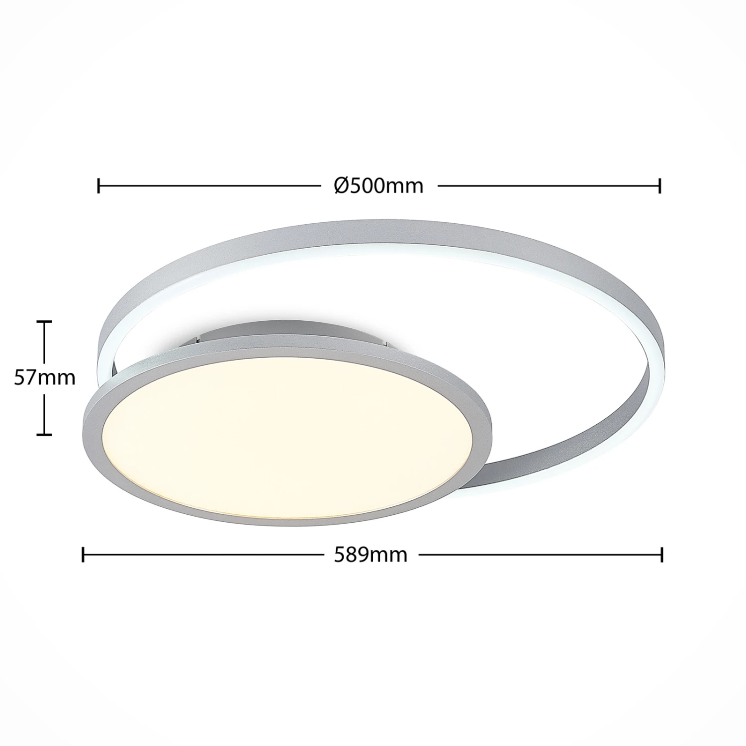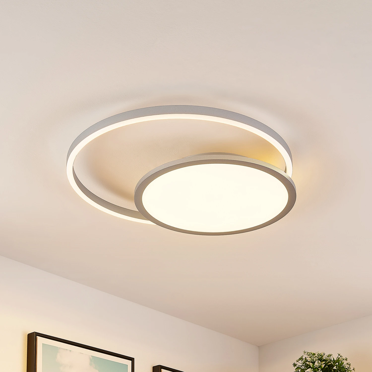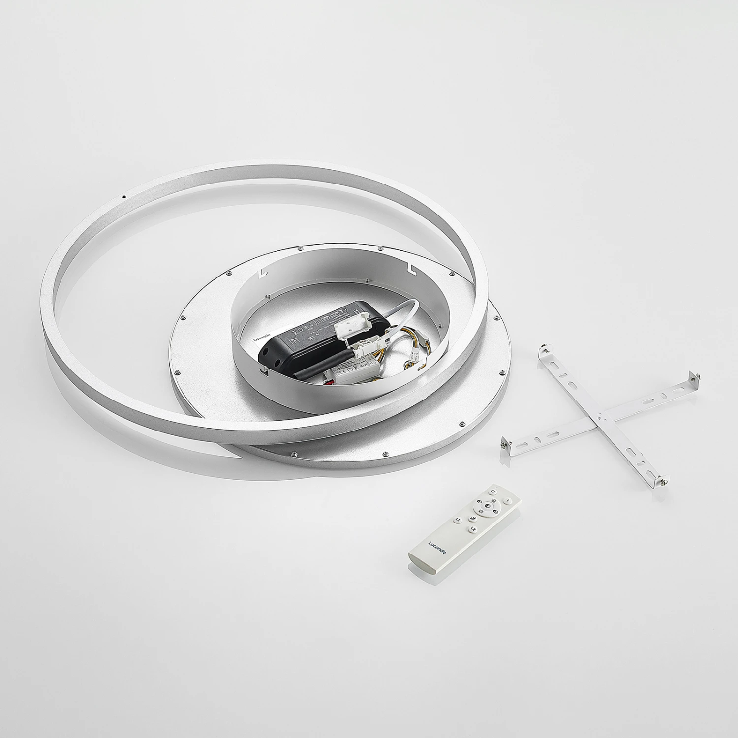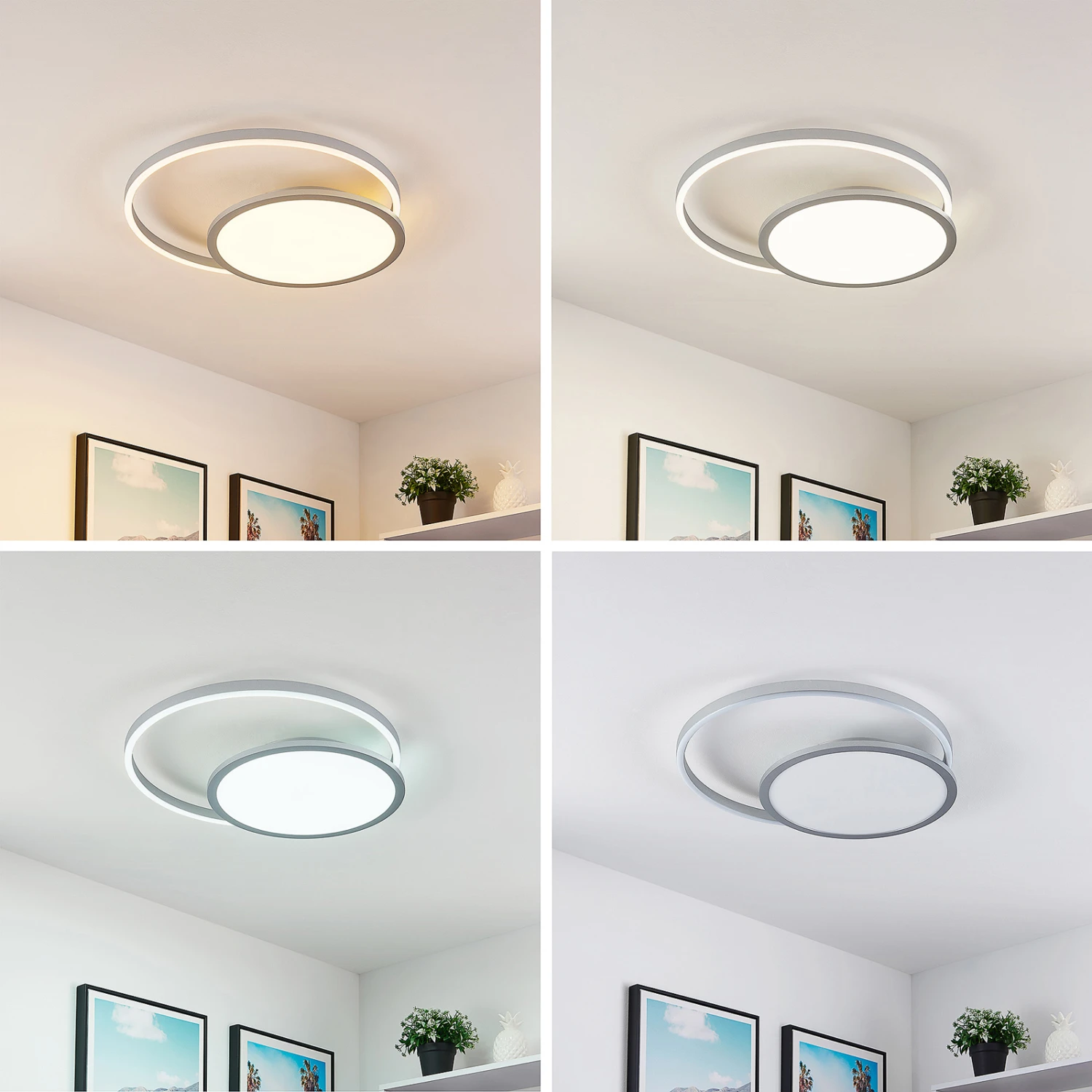 Die LED-Deckenlampe Irmi ist stilvoll und zweckmäßig zugleich. Sie besteht aus einem Ring, in dessen Mitte ein rundes Element sitzt, in dem festverbaute LEDs angebracht sind. Ihr Leuchtenkörper besteht aus Aluminium und Eisen, welches durch seine silberne Farbe einen eleganten Charakter besitzt. Die Leuchte lässt sich mit Hilfe einer Fernbedienung hinsichtlich ihrer Helligkeit stufenlos dimmen (10 % – 100 %), darüber hinaus lässt sich auf diesem Wege ebenso die Lichtfarbe steuern (2.700 K, 4.000 K und 6.500 K). Überdies verfügt sie über eine Memory-Funktion, durch die vorher gewählte Einstellungen gespeichert und wieder abgerufen werden können. Auch spät am Abend spendet sie durch ihren Nachtlicht-Modus das perfekte Licht und dies macht die LED-Deckenleuchte Irmi zum perfekten Lichtspender, wenn es um die Beleuchtung von Innenräumen geht. Das moderne Design passt hervorragend in ein Schlafzimmer oder ein Wohnzimmer und integriert sich mühelos in verschiedenste Einrichtungsstile.