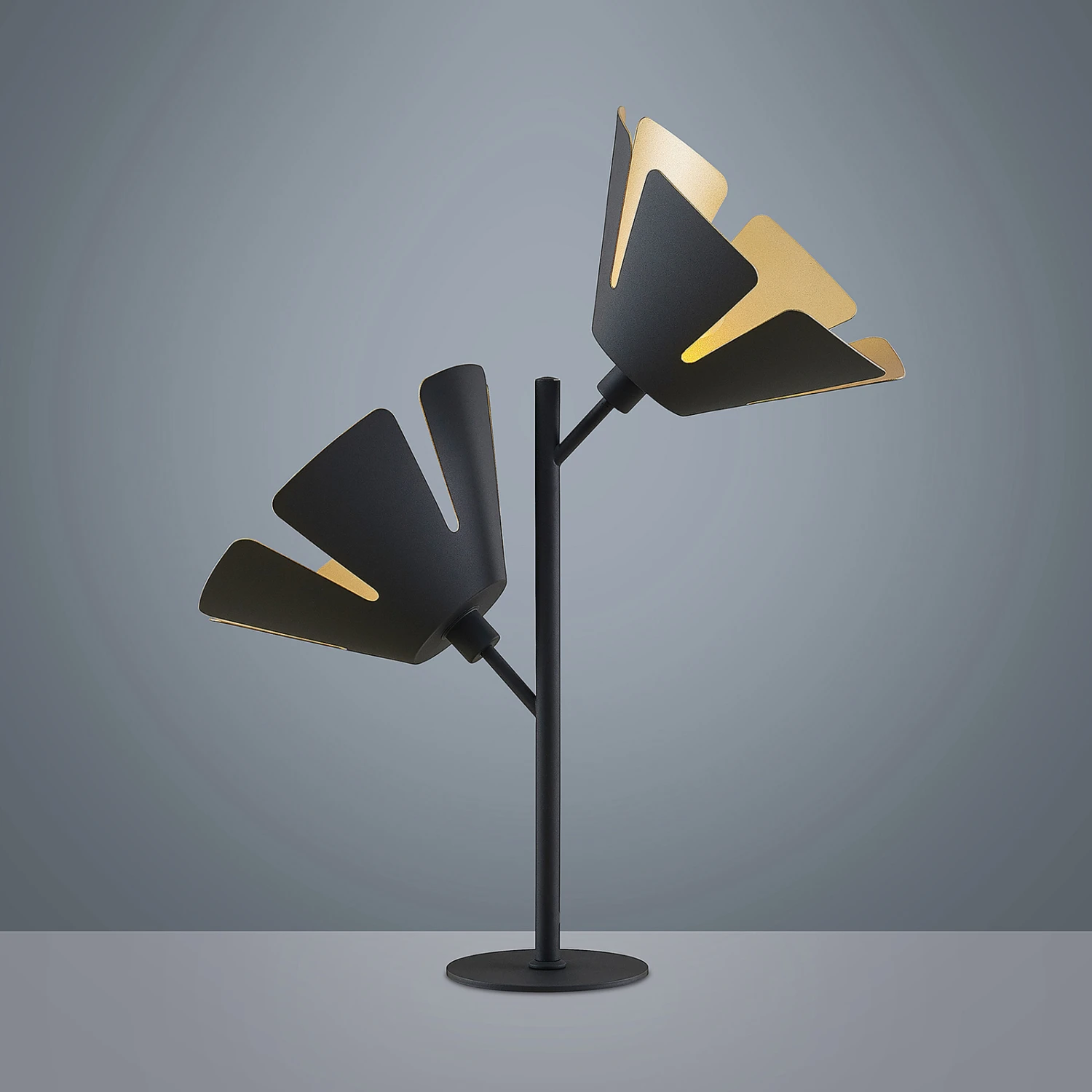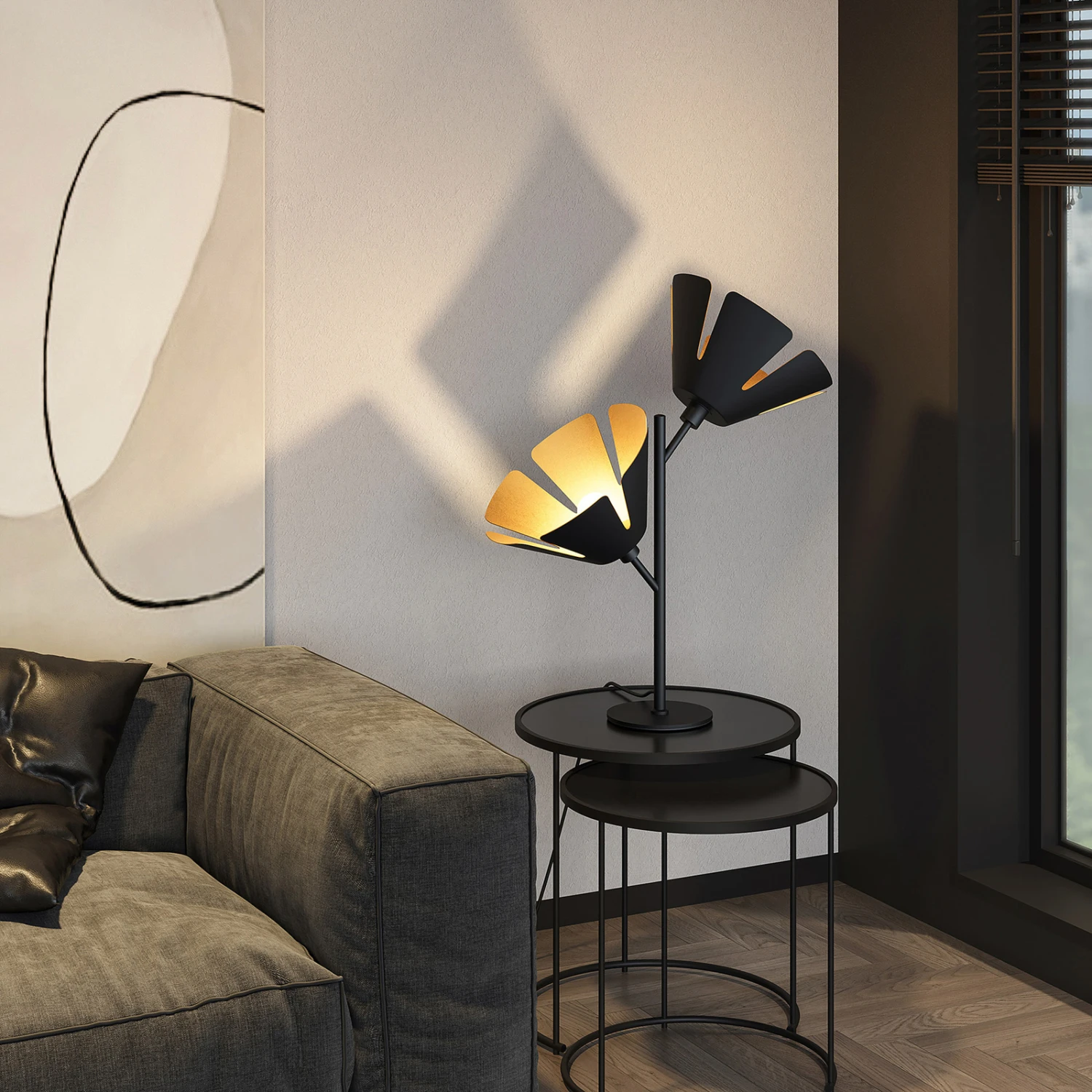 Diese Tischleuchte besitzt ein exklusives Design und hat zwei aufgefächerte Lampenschirme, die nach oben weisen und auf unterschiedlicher Höhe sitzen. Wie Fuß und Gestänge sind sie außen in einem matten Schwarz gehalten, die Innenseite der Schirme ist jedoch in einem sanften Goldton gehalten, der einen schönen Kontrast hervorruft, vor allem aber mit einer unvergleichlich warmen und gemütlichen Lichtwirkung überzeugt. Die beiden Schirme können mit den seitlichen Einkerbungen auch als sehr moderne Interpretation einer floralen Gestaltungsweise wahrgenommen werden und ähneln somit Blüten ein bisschen. Sehr schön für moderne Räume und für ein besonderes Maß an Gemütlichkeit mit einer schönen Akzentbeleuchtung!