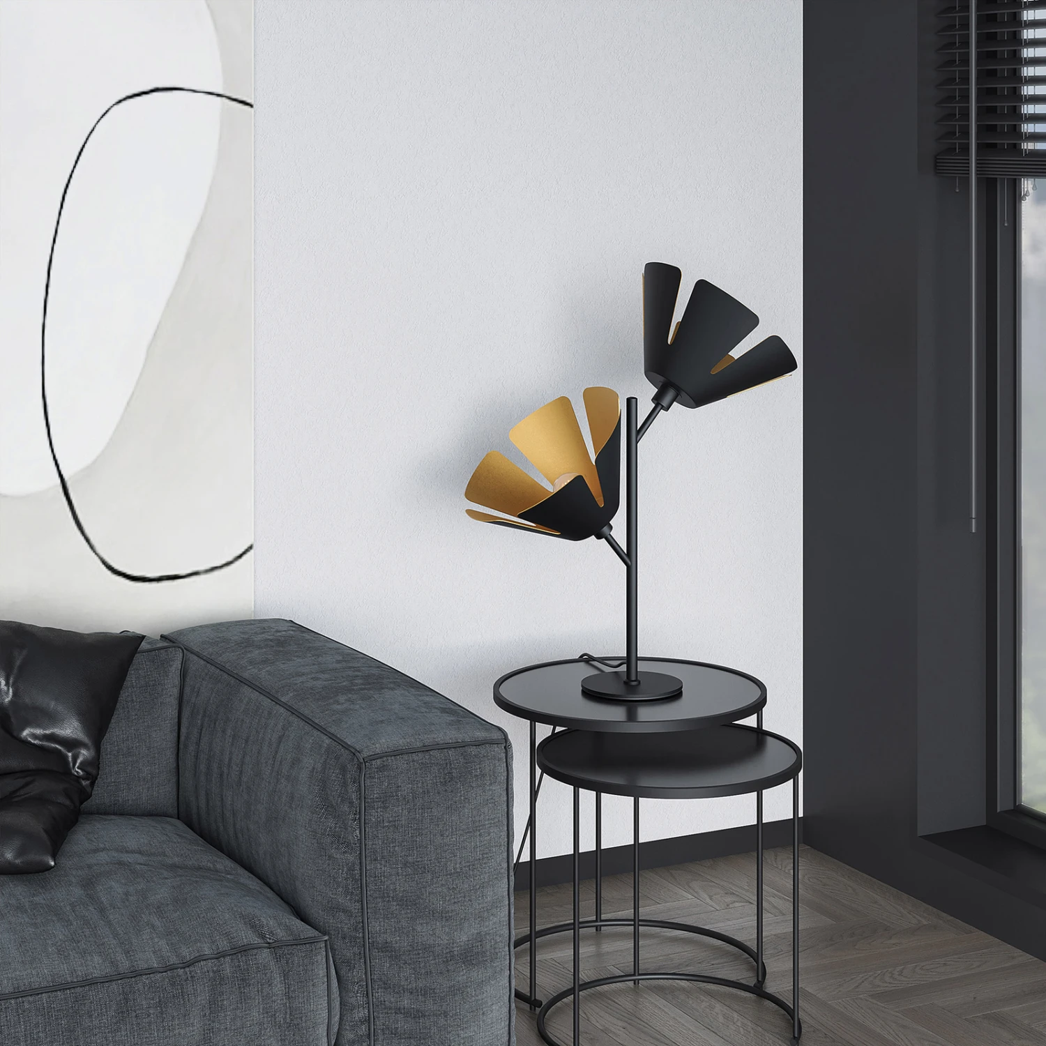Dreiflammige Design-Tischlampe Jemmily mit schwarz-goldenen Schirmen