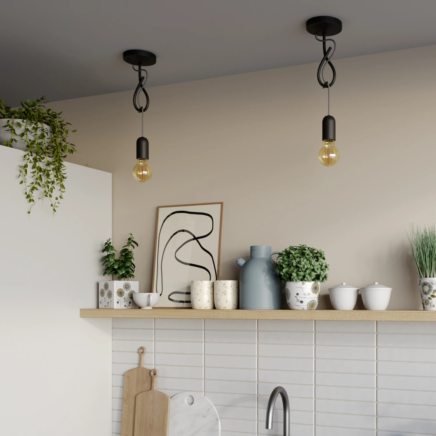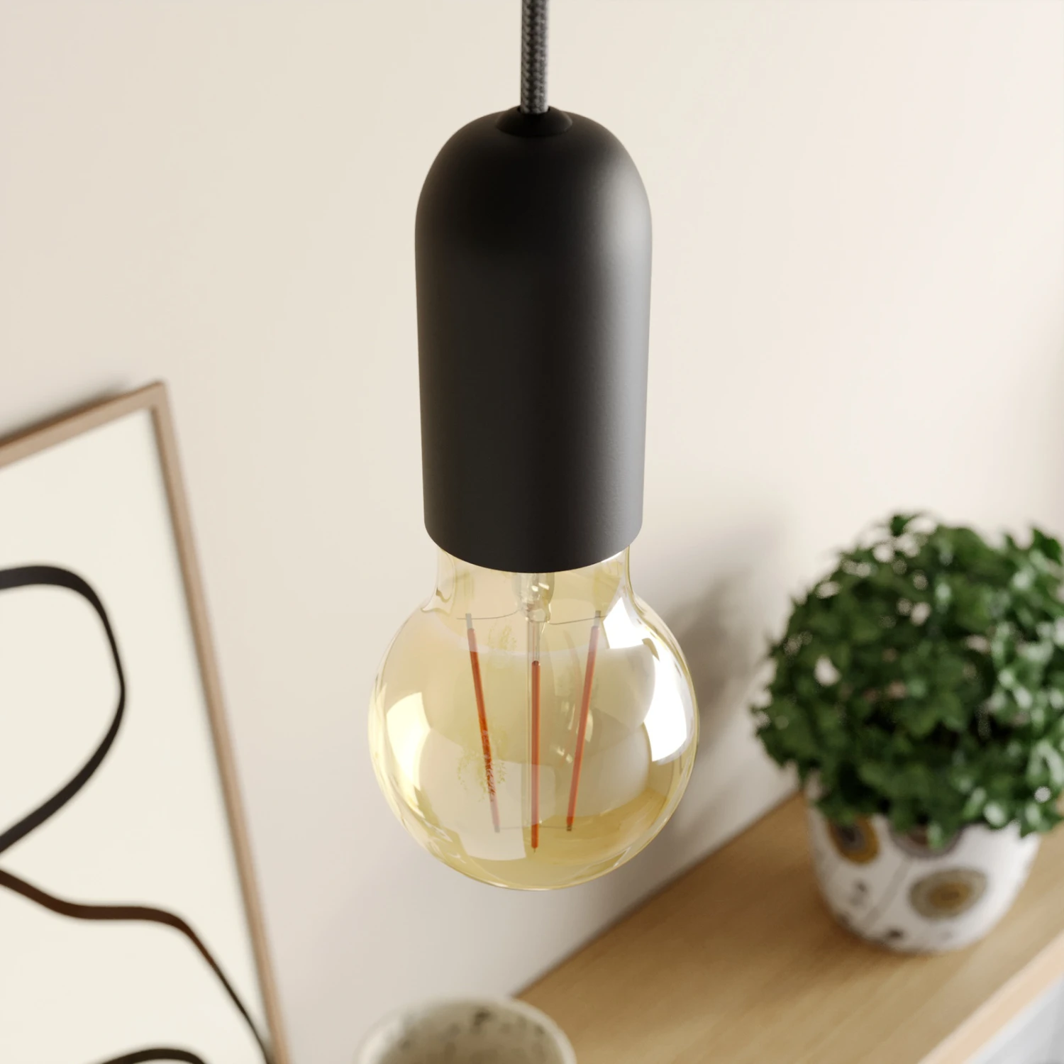 Jorna ist ein minimalistisches Beleuchtungselement, das durch ikonisches Design zum Eyecatcher wird. Seine Blickfangqualitäten erhält es vor allem durch die einzigartige, materialgerechte Gestaltungsweise, die kennzeichnend für diese Pendelleuchte ist. Die Deckenhalterung und die schmale Schlinge, die das Kabel hält, bestehen aus schwarzem Metall, während das Textilkabel selbst in einem helleren Grau gehalten ist. Unten geht die Zuleitung über in die Fassung, die für eine E27-Lampe gemacht ist, die sich frei wählen lässt. Dabei sollte jedoch auf eine passende Optik geachtet werden, wie sie Filamentlampen mit effizienter LED-Technik bieten. Mit einer Globelampe mit größeren Abmaßen (G95) rückt das Leuchtmittel zudem optisch noch mehr in den Vordergrund und komplettiert das minimalistische Gesamtdesign auf sehr passende Weise.