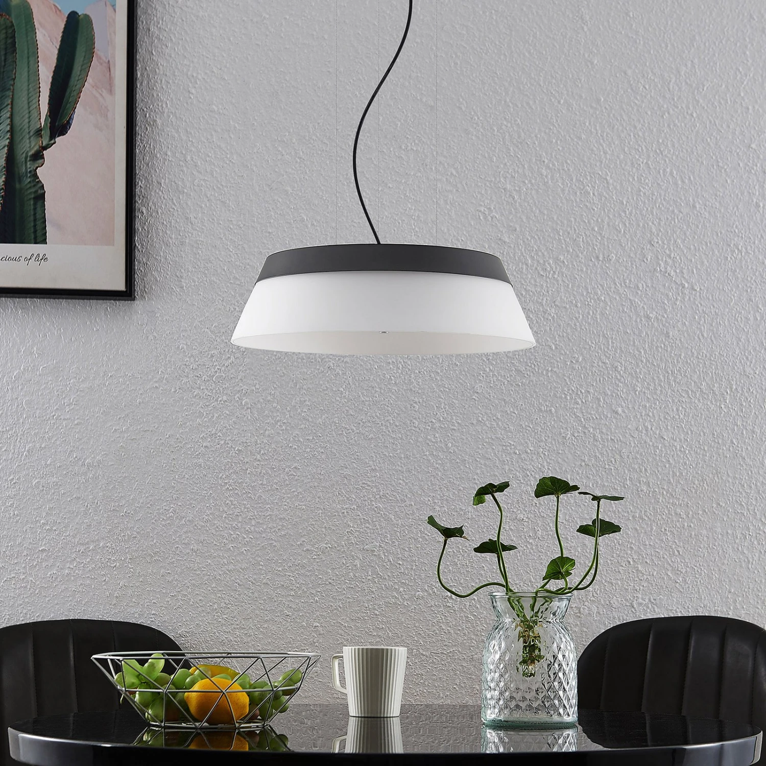 Die LED-Hängeleuchte Jusanna punktet mit ihrem simplen Design, das sehr attraktiv an der Decke wirkt. Der Leuchtenschirm aus opalweißem Glas ist nach unten geöffnet und minimiert die Blendgefahr. Jusanna bietet außerdem leuchtstarke LEDs, die zugleich stromsparend sind. Optimal kommt diese schöne Hängeleuchte in modernen Umgebungen zur Geltung und kreiert mit ihrem angenehm warmweißen Lichtschein ein wohnliches Ambiente über dem Esszimmertisch oder auch über einer Theke.
