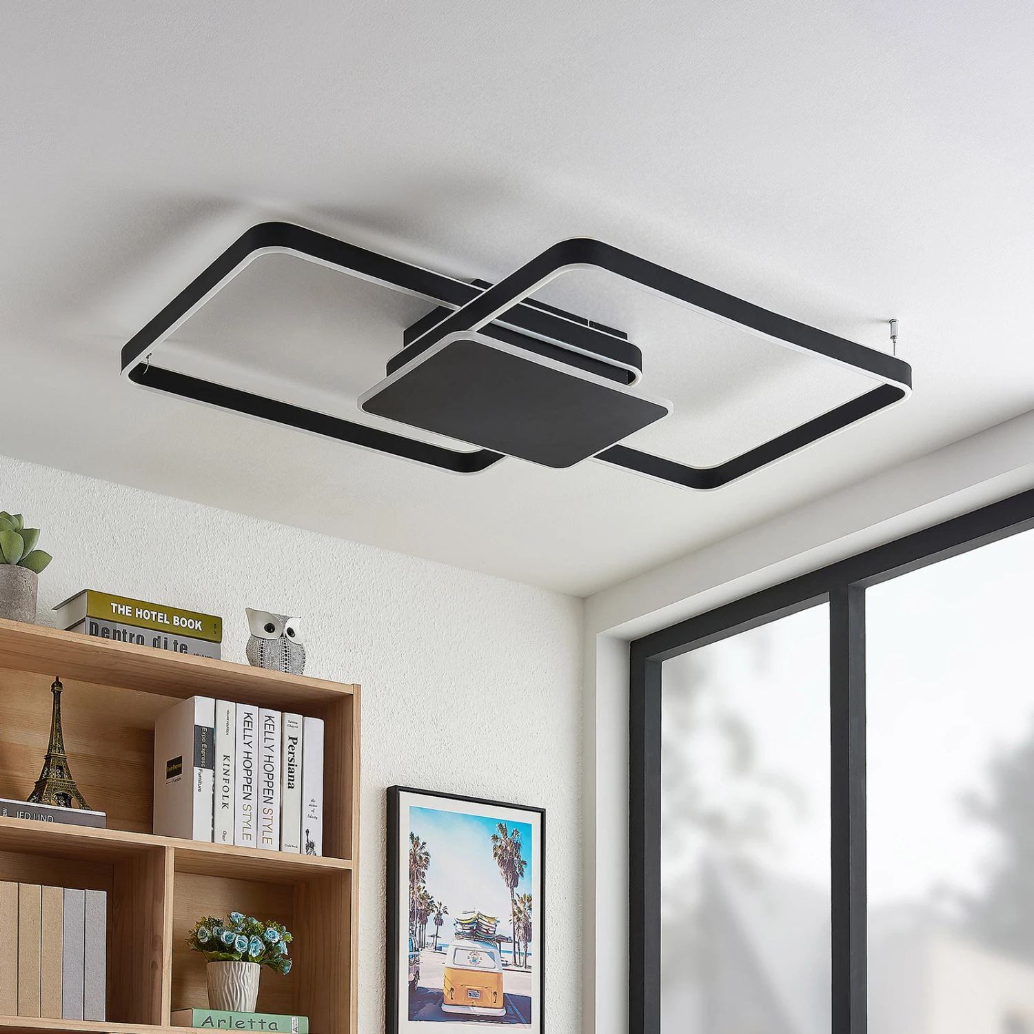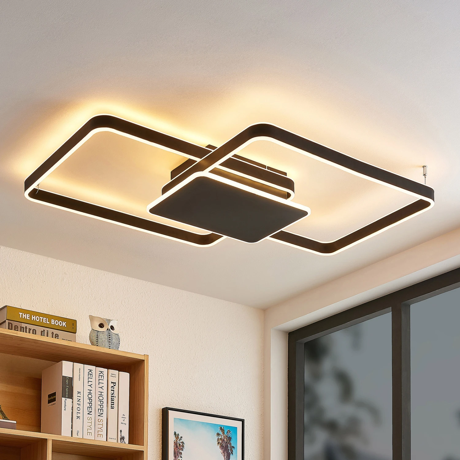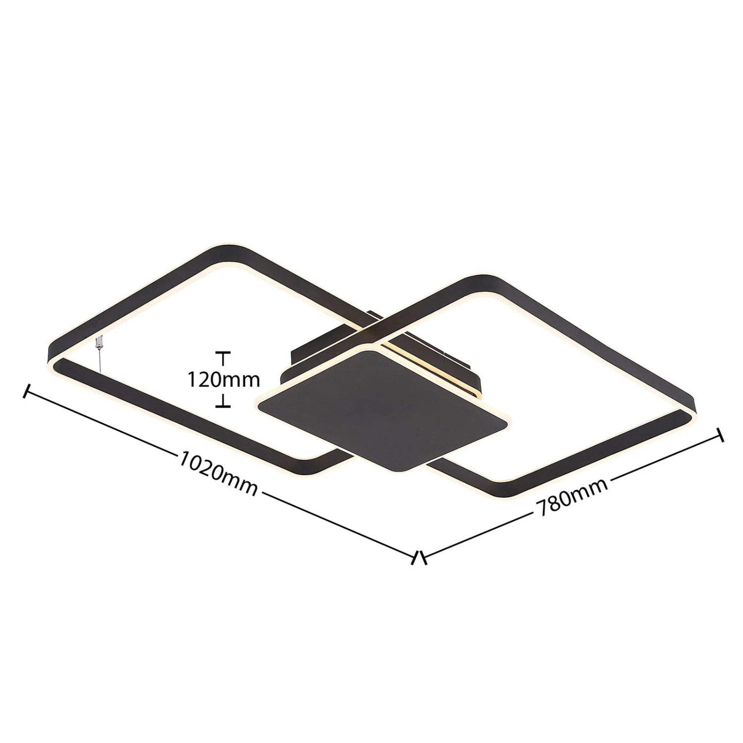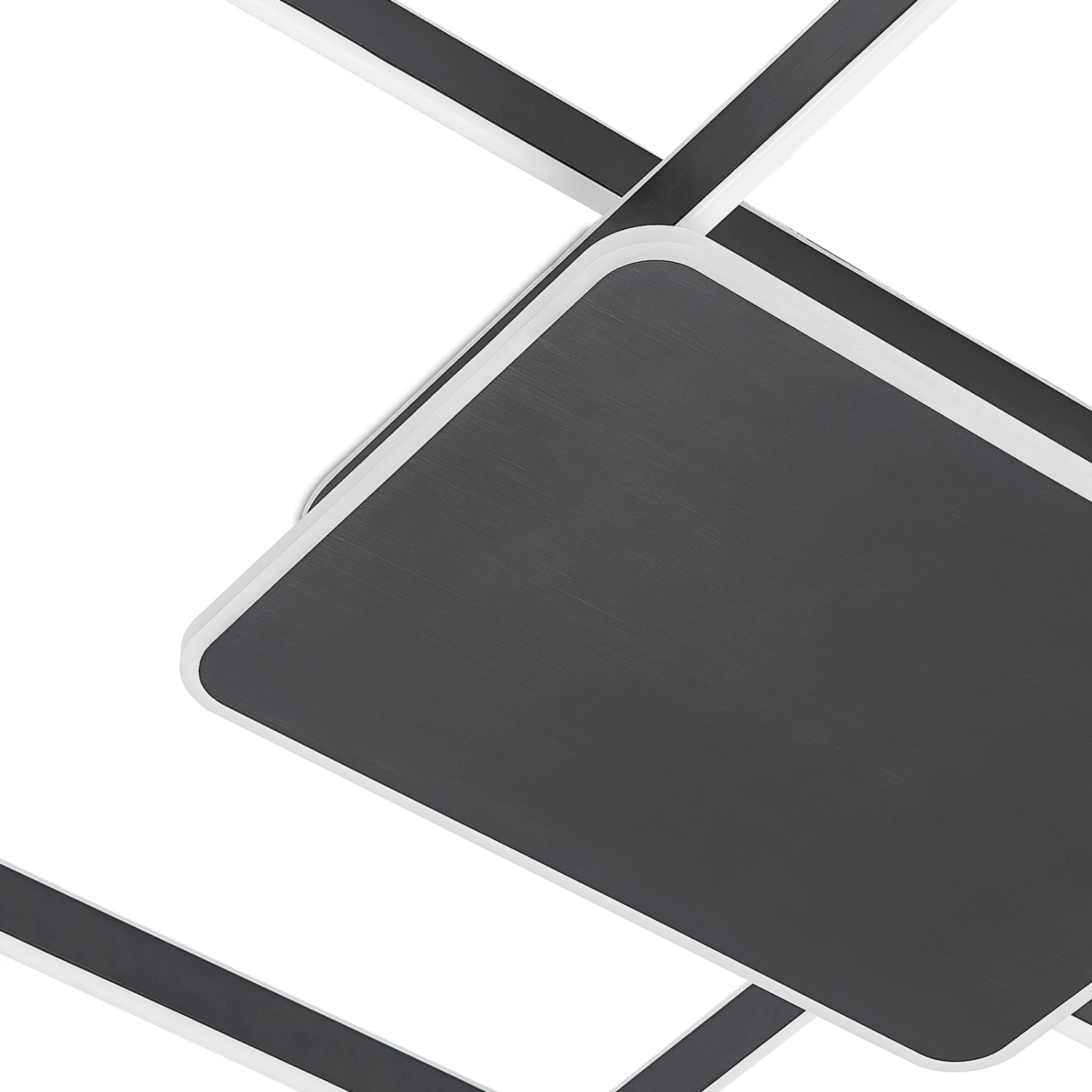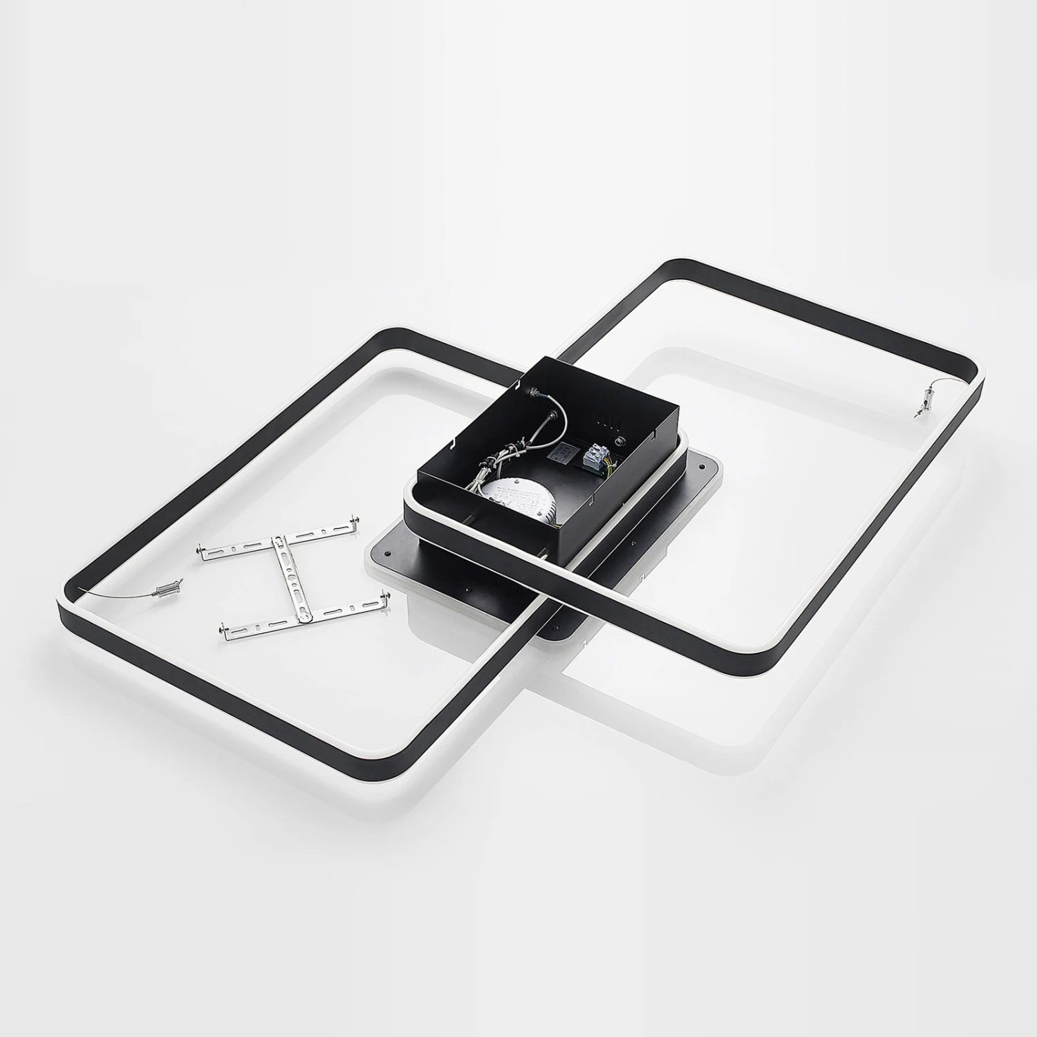 Die schwarze Deckenlampe Kadira ist eine schöne Ergänzung in modern gestalteten Räumlichkeiten. Rechteckige Rahmen besetzt mit LEDs bilden zusammen die stilvolle Lichtquelle. Der gängige Wandschalter ermöglicht es, die Leuchte wie gewohnt ein- und auszuschalten. Durch die 3-Stufen-Dimmtechnik mit integrierter Off-Funktion lässt sie sich zudem durch mehrmaliges Betätigen des Schalters in drei unterschiedliche Stufen ihrer Helligkeit dimmen: 100 %, 40 % und 15 %.