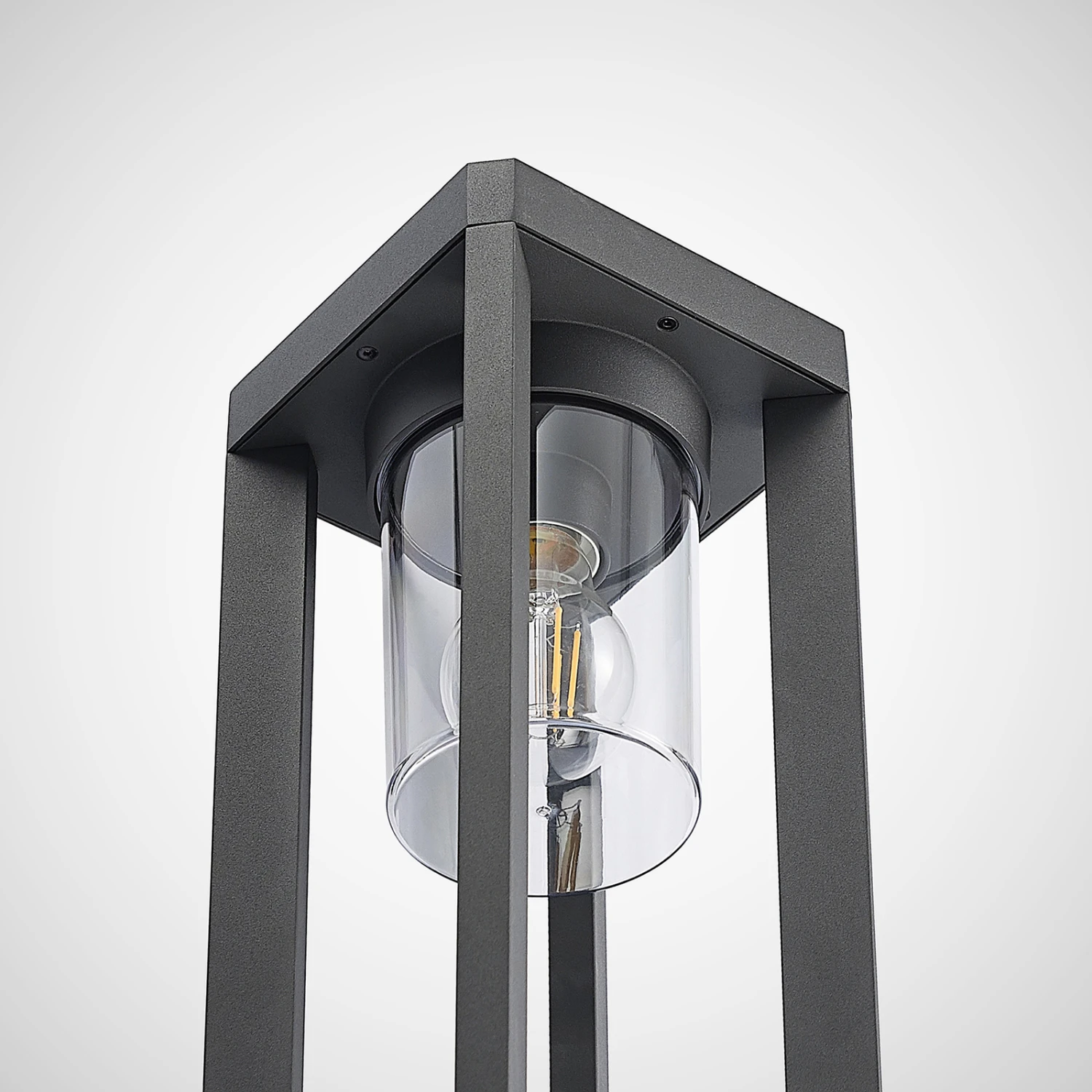 Die dunkelgraue Außenwandleuchte Kalisa besticht mit ihren gradlinigen Formen und einem zeitgenössischen Design. Ihr Gehäuse wurde aus Aluminium hergestellt und besitzt eine offene Käfigform. Die Brennstelle wird von einer Schirmabdeckung aus Kunststoff ummantelt.