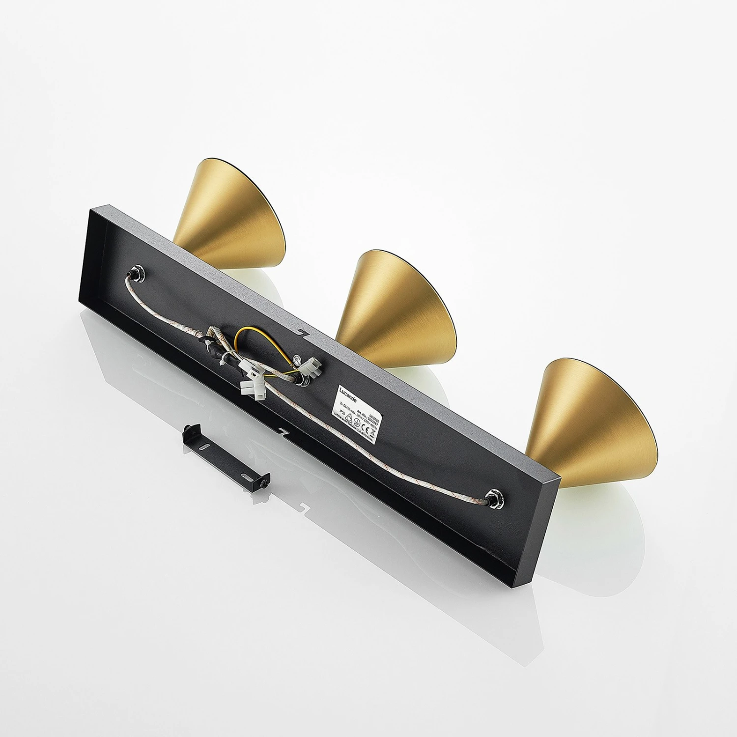 Optisch kombiniert Kartio klare geometrische Formen, denn während das Gestell gradlinig in Form eines Rechtecks gestaltet wurde, bieten die Leuchtenschirme mehr Dynamik mit ihrer schönen Kegelform. Dabei treffen das klassische Schwarz und das edle Messing harmonisch aufeinander und unterstreichen den stilvollen Charakter der Leuchte.