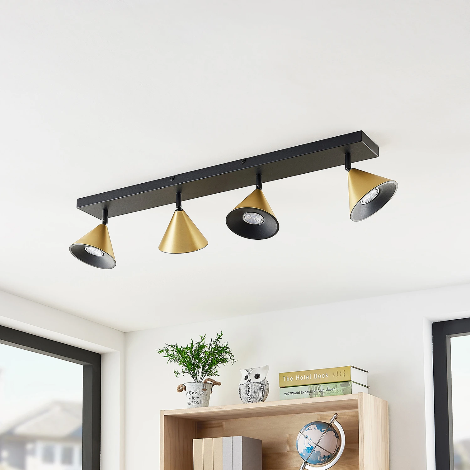 Die Deckenleuchte Kartio begeistert mit ihren vier Leuchtenschirmen, die sofort positiv ins Auge fallen. Befestigt an einer Montageplatte in Rechteckform, bilden die Schirme einen stilvollen Gegensatz mit ihrer konischen Bauform. Die Farbgebung fällt kontrastvoll, jedoch sehr harmonisch aus. Das mattschwarze Finish der Platte ergänzt die edle Messing-Oberfläche der Leuchtenschirme und verleiht der Leuchte einen definierten Charakter.