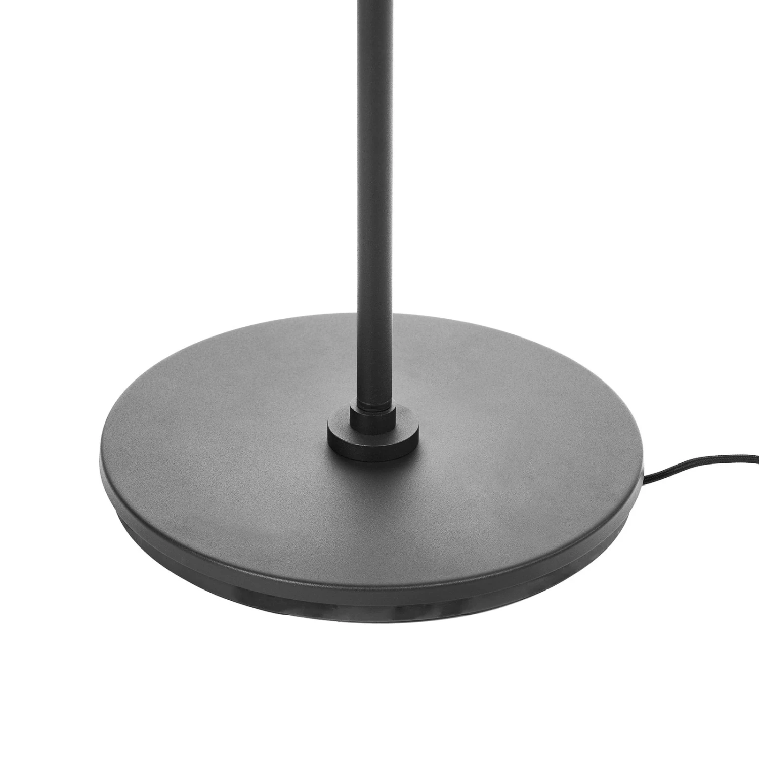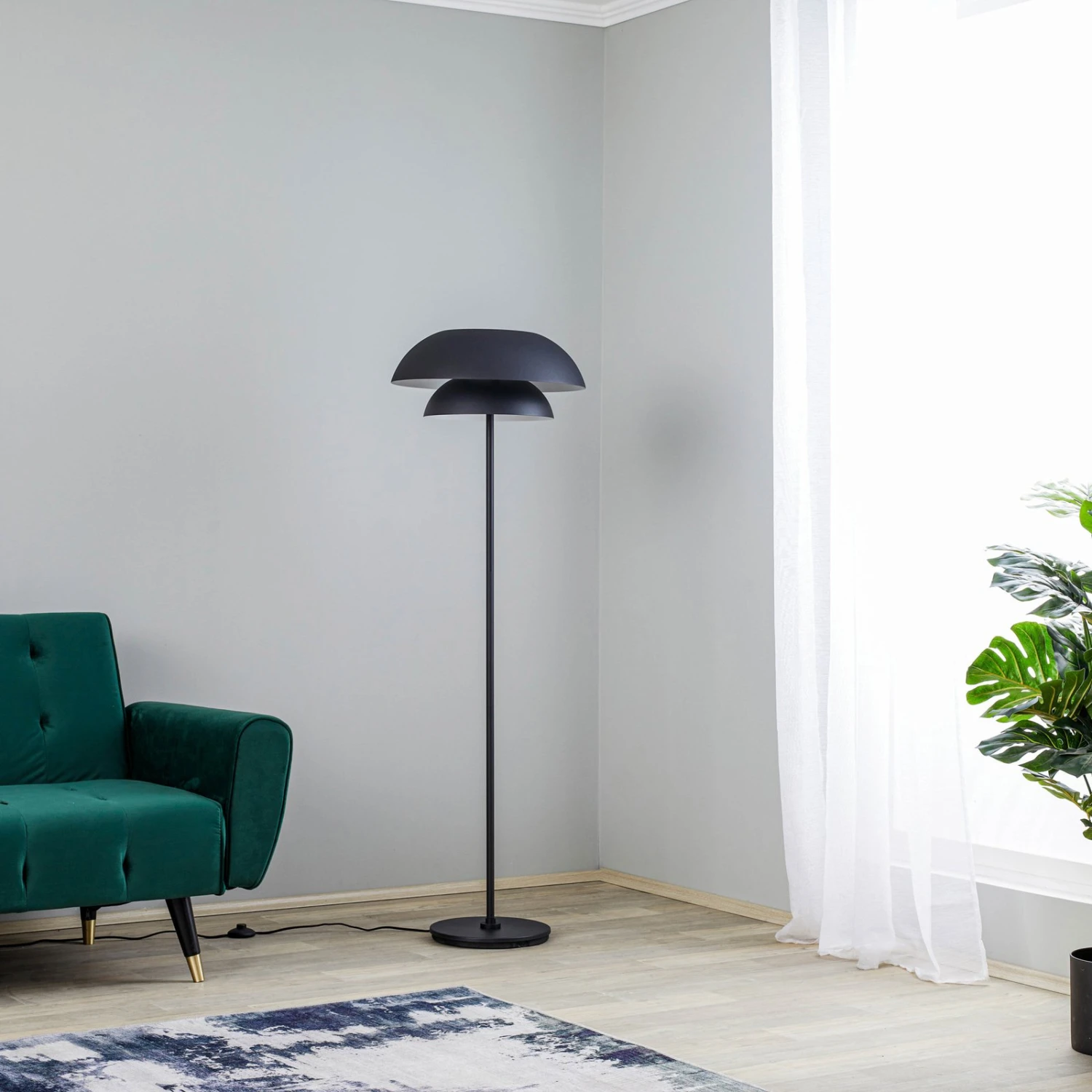 Diese Stehlampe präsentiert sich in einem zeitgemäßen Design und kommt sehr gut in modernen Umgebungen zur Geltung. Sie wurde aus Eisen hergestellt und mit einem sandschwarzen Oberflächenfinish überzogen. Im Vordergrund ihres Looks steht der doppelte Leuchtenschirm mit seiner nach unten abgerundeten Form. Das Licht wird dank des Schirms blendfrei abgestrahlt, sodass sich diese Leuchte für unterschiedliche Zwecke eignet. Sie kann sowohl im eigenen Wohnzimmer als auch im gewerblichen Bereich eine gute Figur machen und wirkt selbst im ausgeschalteten Zustand wie ein stilvolles Wohnaccessoire.