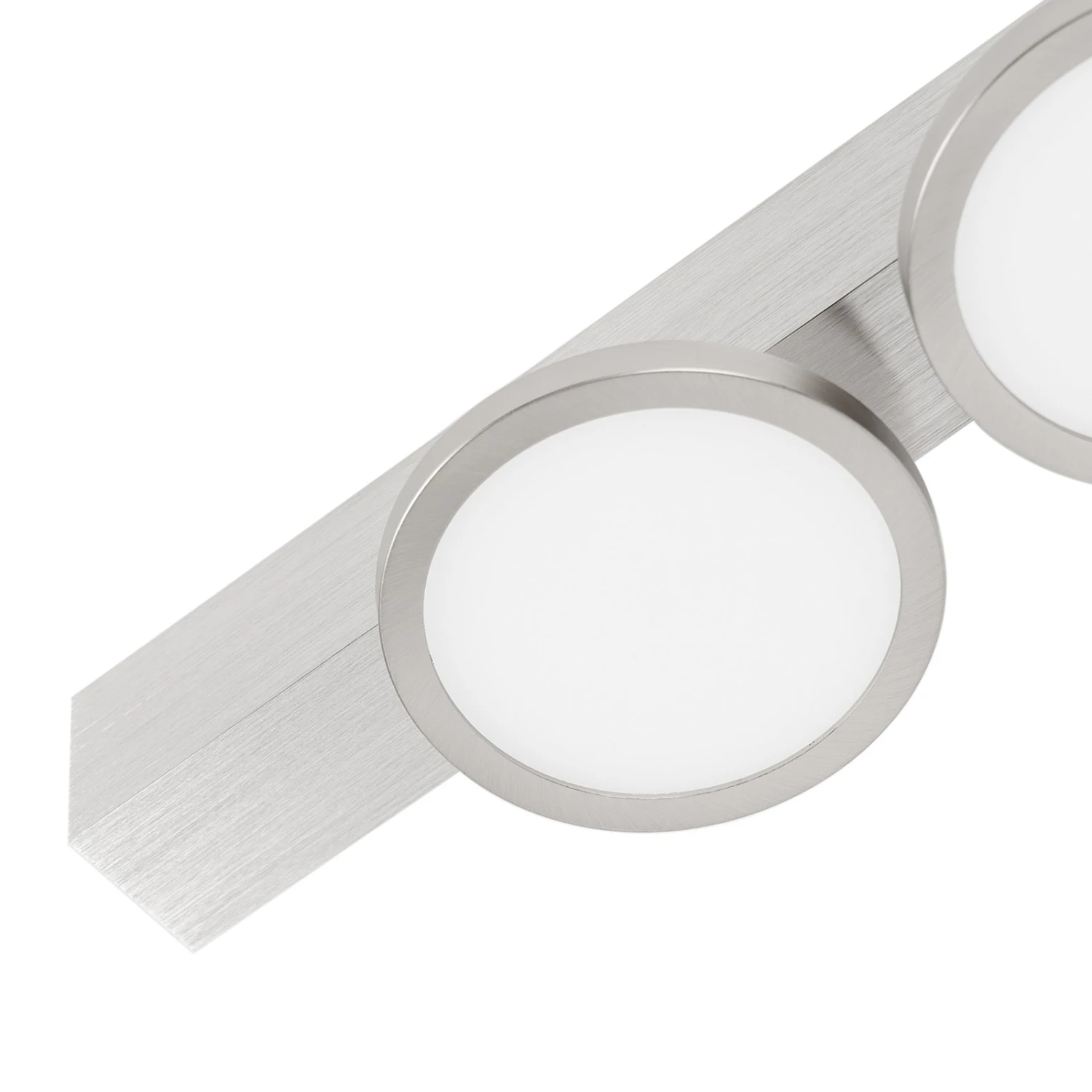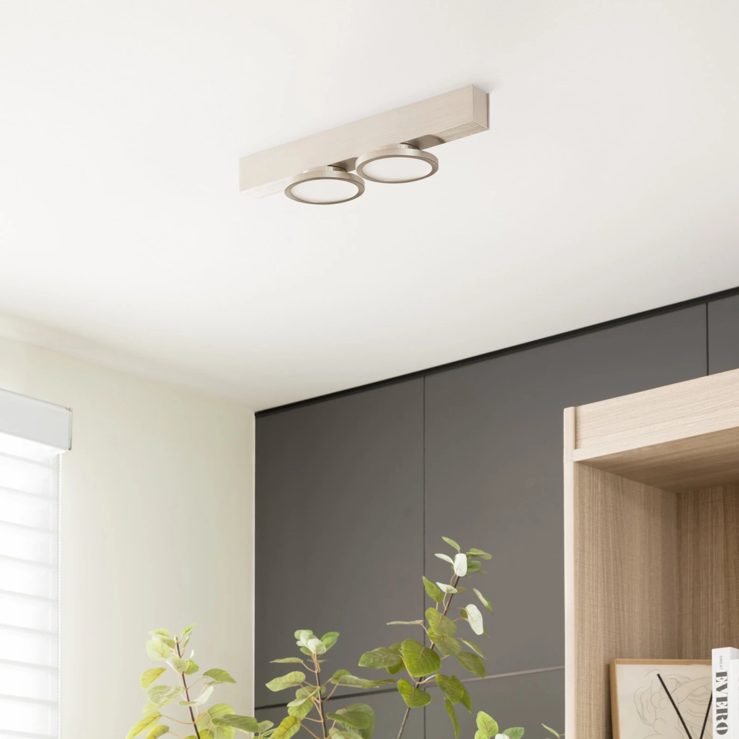 Designorientierte LED-Deckenlampe Kellino mit gebürsteter Oberfläche in Nickel, zweiflammigDie formschöne Deckenlampe Kellino schafft angenehme Lichtverhältnisse und eine wohnliche Stimmung in Ihren vier Wänden. Die Deckenlampe leuchtet in wohnlichem warmweißem Licht, ist für die Aufnahme von Leuchtmitteln mit einem GU10-Sockel konzipiert und kann auch optisch durch ihr modernes Design, das einem Konzept von Ingo Thiele entspringt, punkten. Sie ist mit zwei austauschbaren Lichtquellen, die wohnliches Licht liefern, bestückt. Überzeugen Sie sich von der hohen Qualität und der gut durchdachten Gestaltung der Marke Lucande. Das Modell Kellino ist eine Bereicherung für jeden Ihrer Räume. Auch ausgeschaltet erfüllt die Lampe in der Farbe Nickel einen dekorativen Zweck.