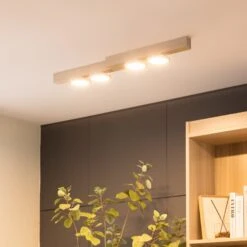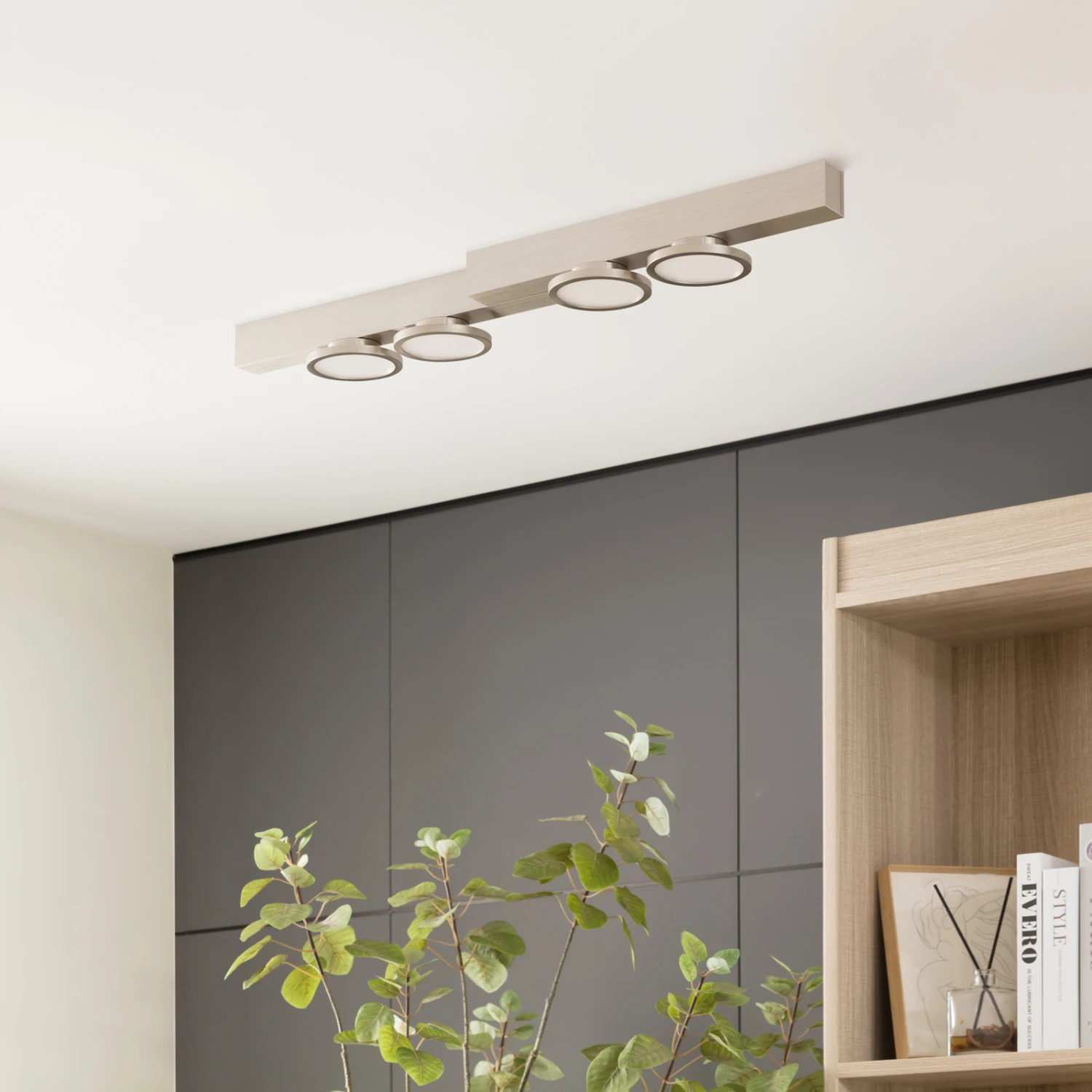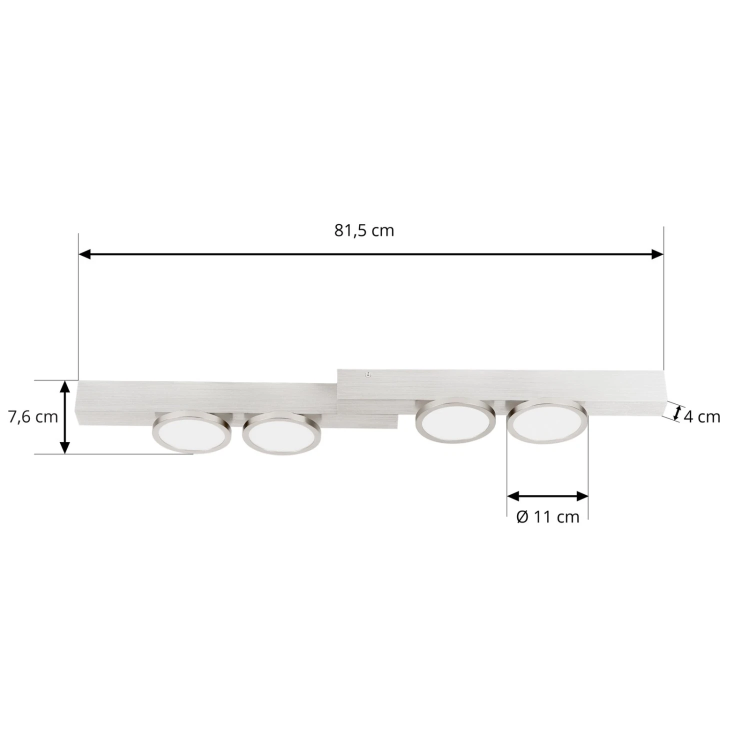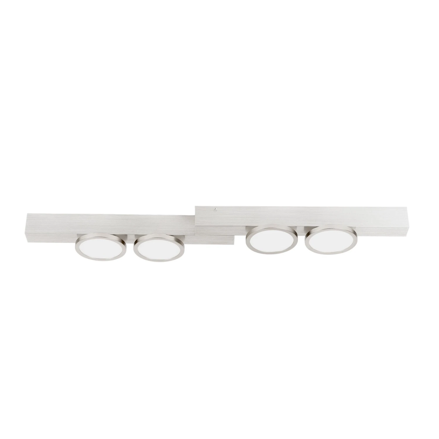 Designorientierte LED-Deckenleuchte Kellino aus Aluminium in gebürstetem Nickel, vierflammigDie formschöne Deckenlampe Kellino schafft Gemütlichkeit und exzellente Lichtverhältnisse in Ihren vier Wänden. Die Deckenleuchte leuchtet in atmosphärischem warmweißem Licht. Sie bietet Ihnen mit vier im Handumdrehen austauschbaren Leuchtmitteln optimales Licht und gelungenes Design. Sie entscheiden sich mit dieser Deckenlampe für hervorragende Lucande-Markenqualität. Die Deckenleuchte in der Farbe Nickel ist die optimale Wahl für unterschiedlichste Räume in Ihren vier Wänden. Sie besitzt eine GU10-Fassung, macht in ihrem modernen Design von Ingo Thiele eine hervorragende Figur und sorgt nicht nur für ein schönes Lichtspiel, sondern erfüllt auch einen dekorativen Zweck.