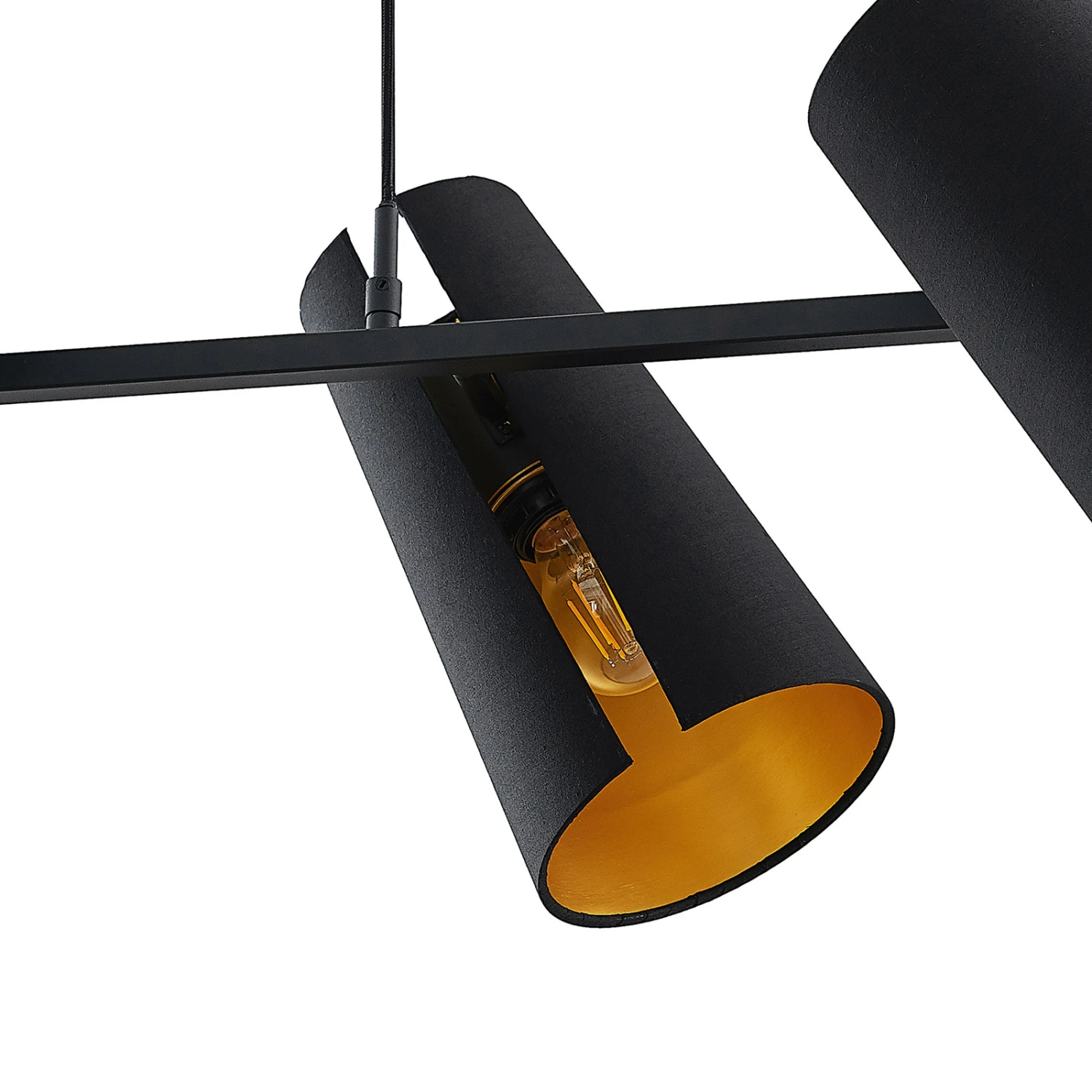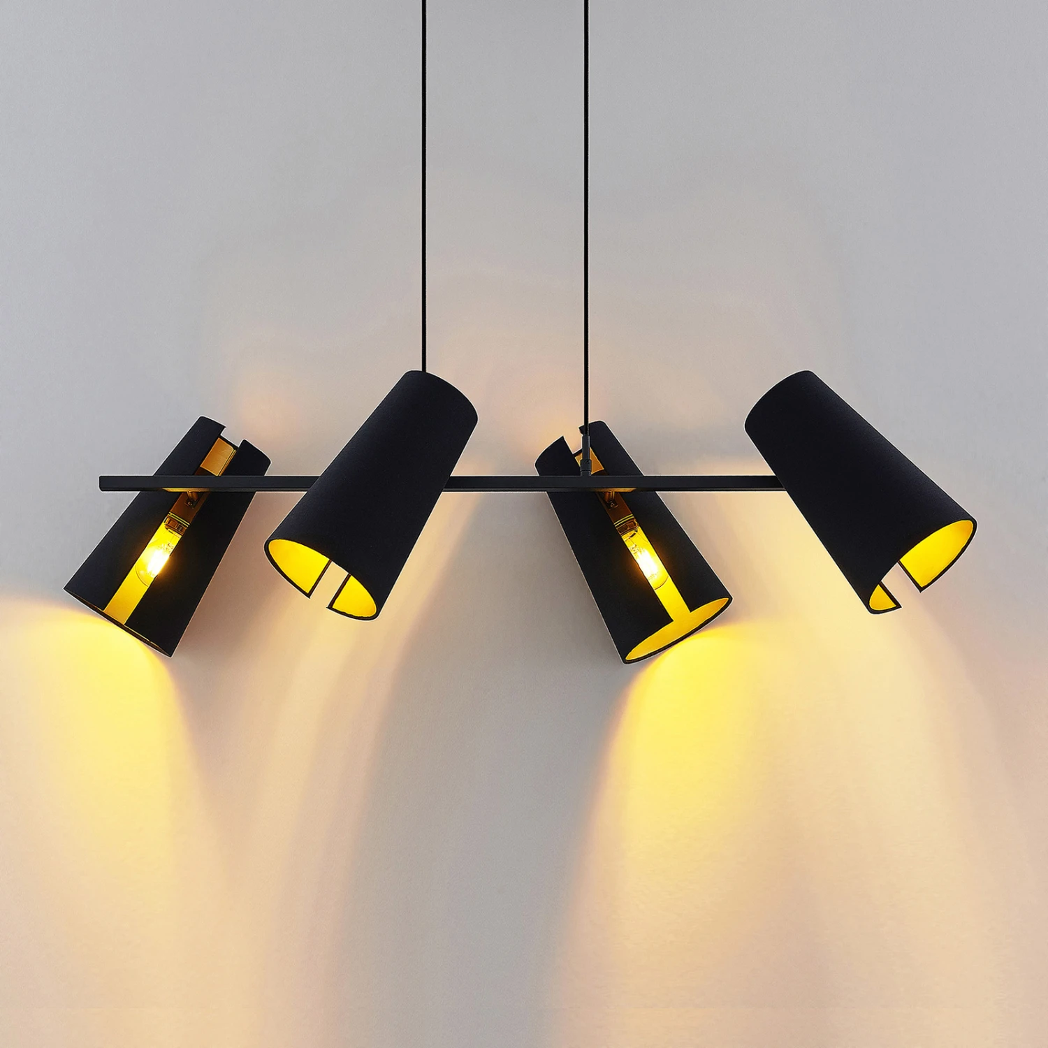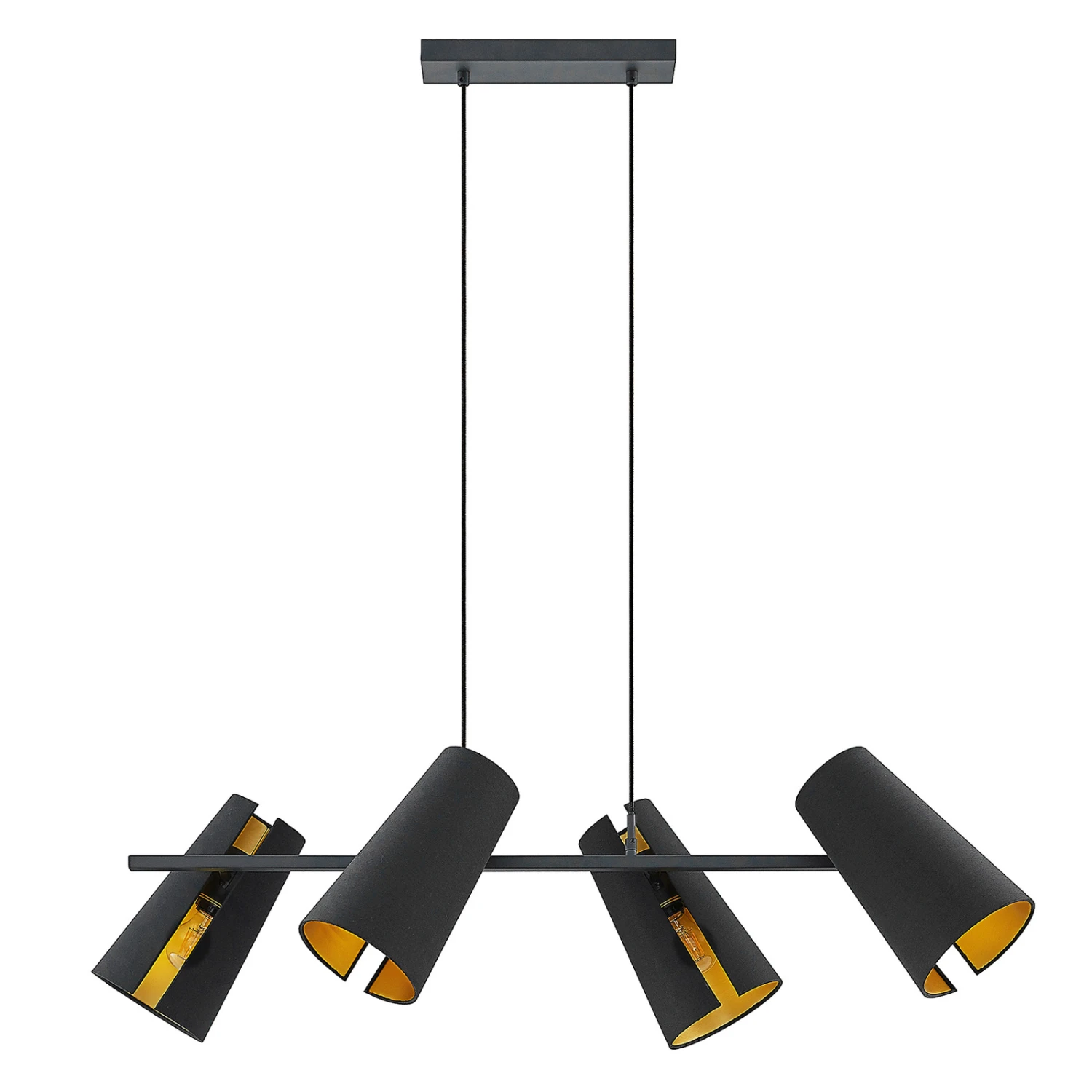 Die Hängeleuchte Kemoni kommt in ihrer vierflammigen Ausführung daher und lässt sich dank ihrem ausgeklügelten Design sowohl im Privatgebrauch als auch im gewerblichen Bereich wunderbar einsetzen. Die schmalen Leuchtenschirme lassen sich in unterschiedlichen Positionen einstellen, um die Lichtabstrahlung genauestens regulieren zu können. Außen sind die Textilschirme in einem klassischen Schwarz gehalten, während das Innere in einem attraktiven Goldton gestaltet wurde. Dies bringt warme Lichtakzente in den Raum und sorgt für mehr Gemütlichkeit.