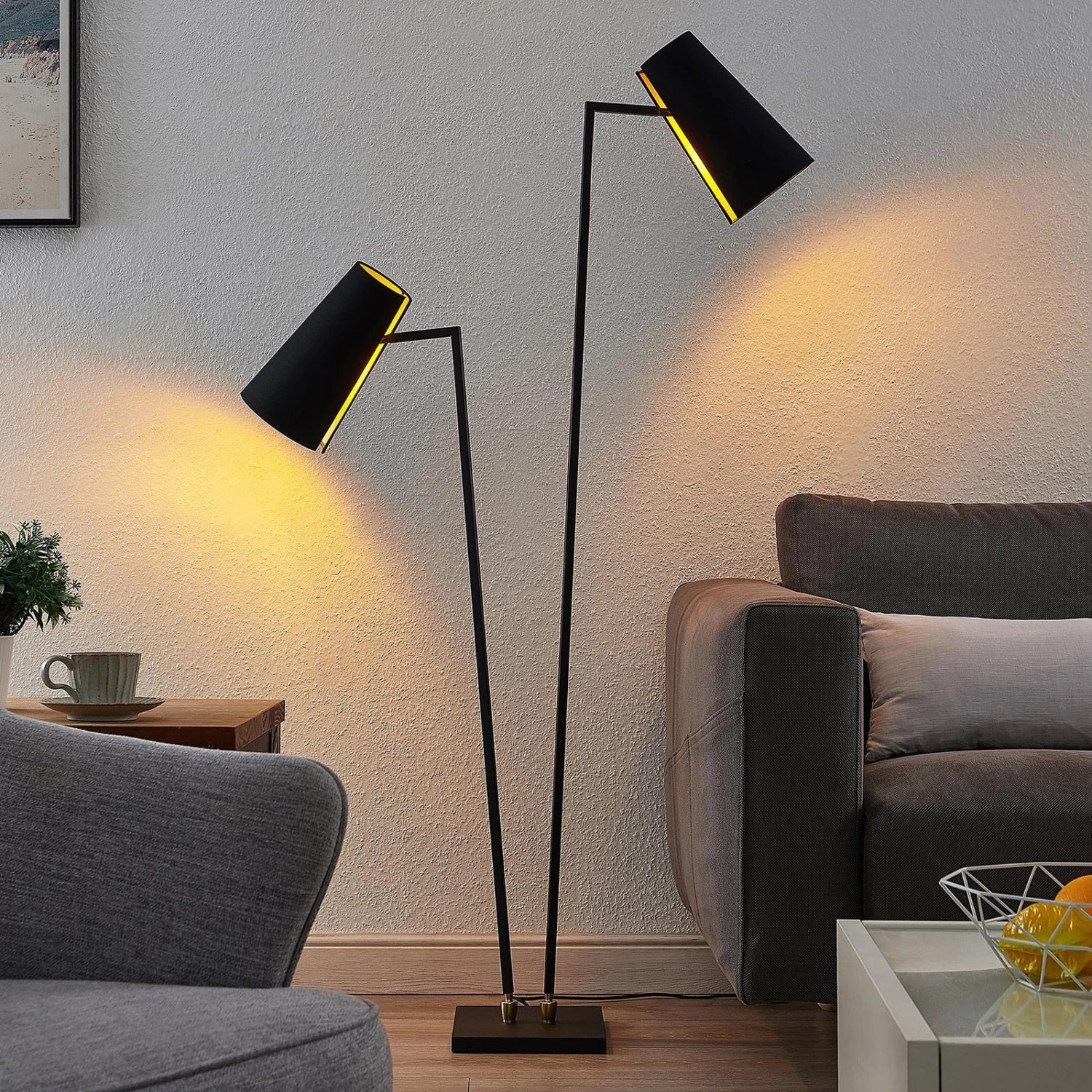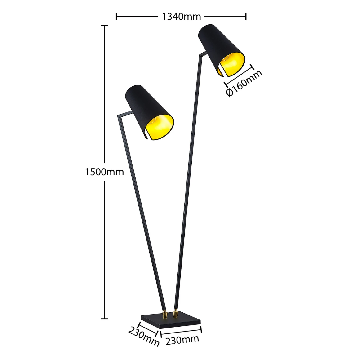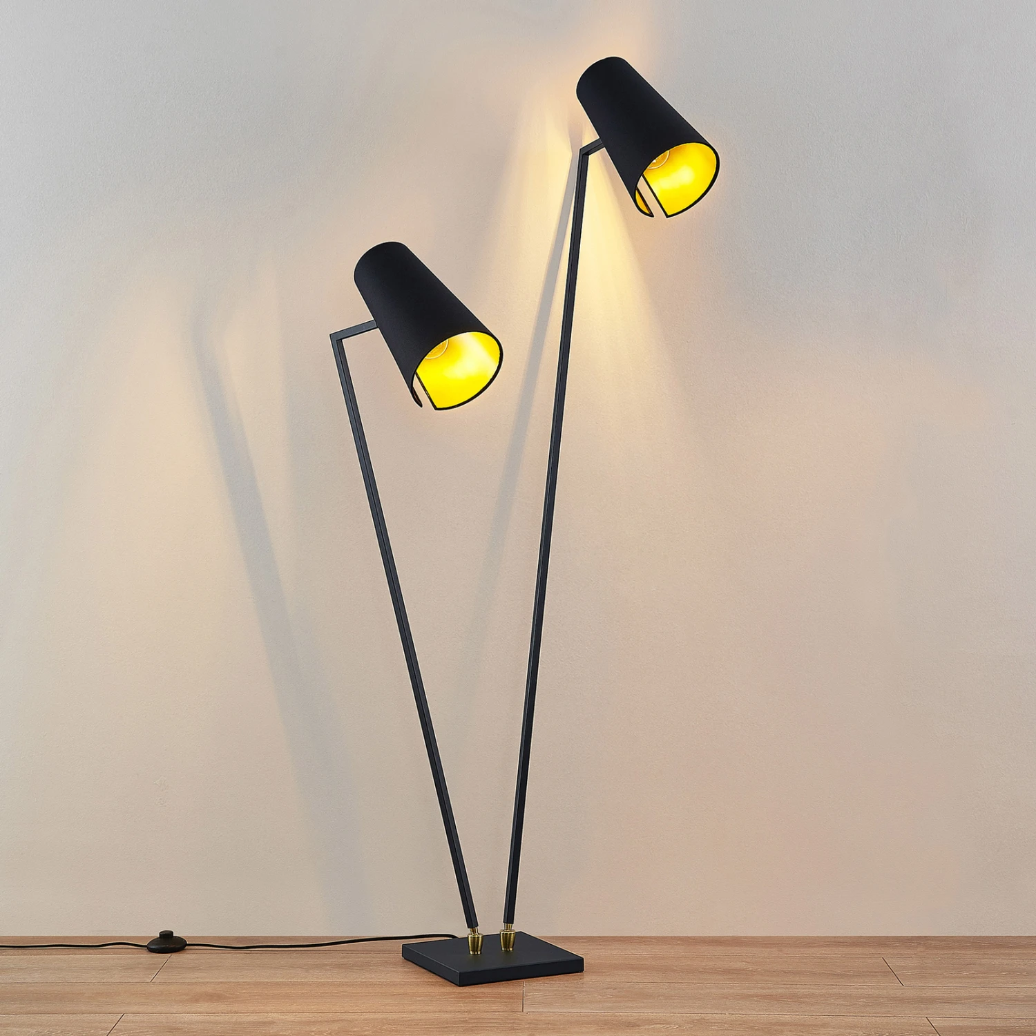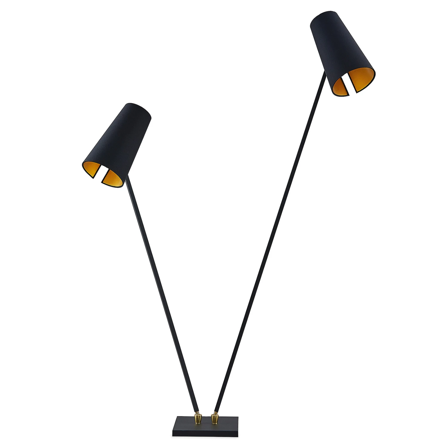 Die Stehleuchte Kemoni zeichnet sich durch ihr besonderes Design aus. Das schlanke, eiserne Gestell dieser Leuchte besteht aus einem stabilen, quadratischen Fuß und zwei filigranen Streben, an denen zwei Leuchtenschirme befestigt sind. Die Schirme wurden außen in einem klassisch schwarzen Ton gehalten und innen mit einem eleganten Gold verziert. Dies verleiht der Leuchte einen ganz besonderen Charakter und sorgt für warme Lichtakzente im Raum. Auch im ausgeschalteten Zustand macht Kemoni eine gute Figut und kann sowohl in den eigenen vier Wänden als auch in Bereich der Hotellerie zum Einsatz kommen.
