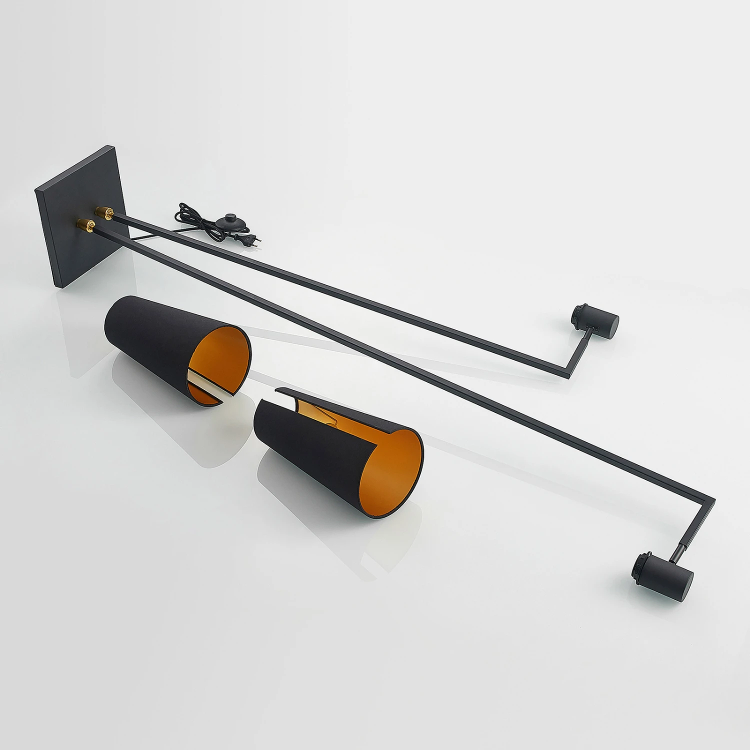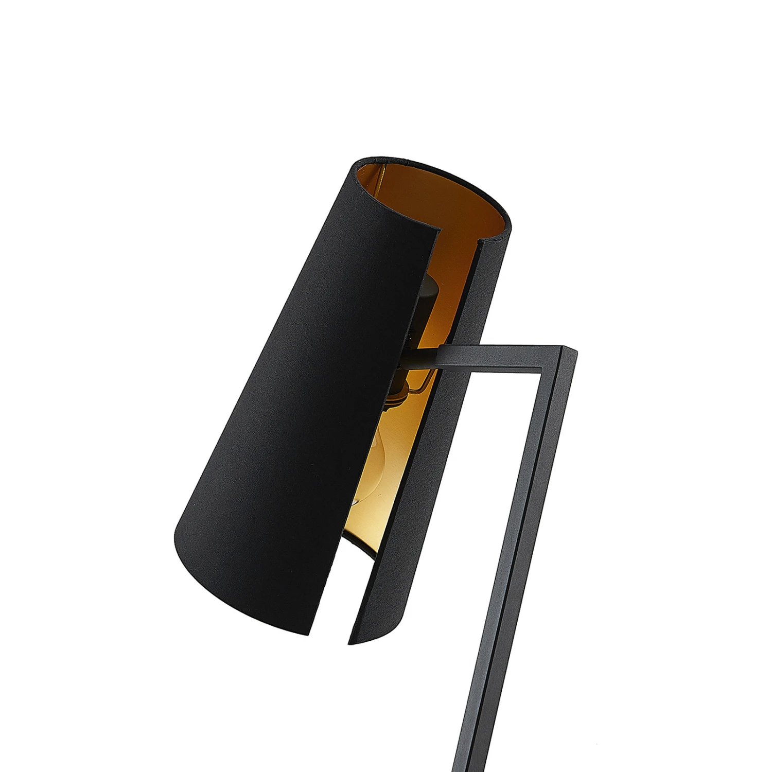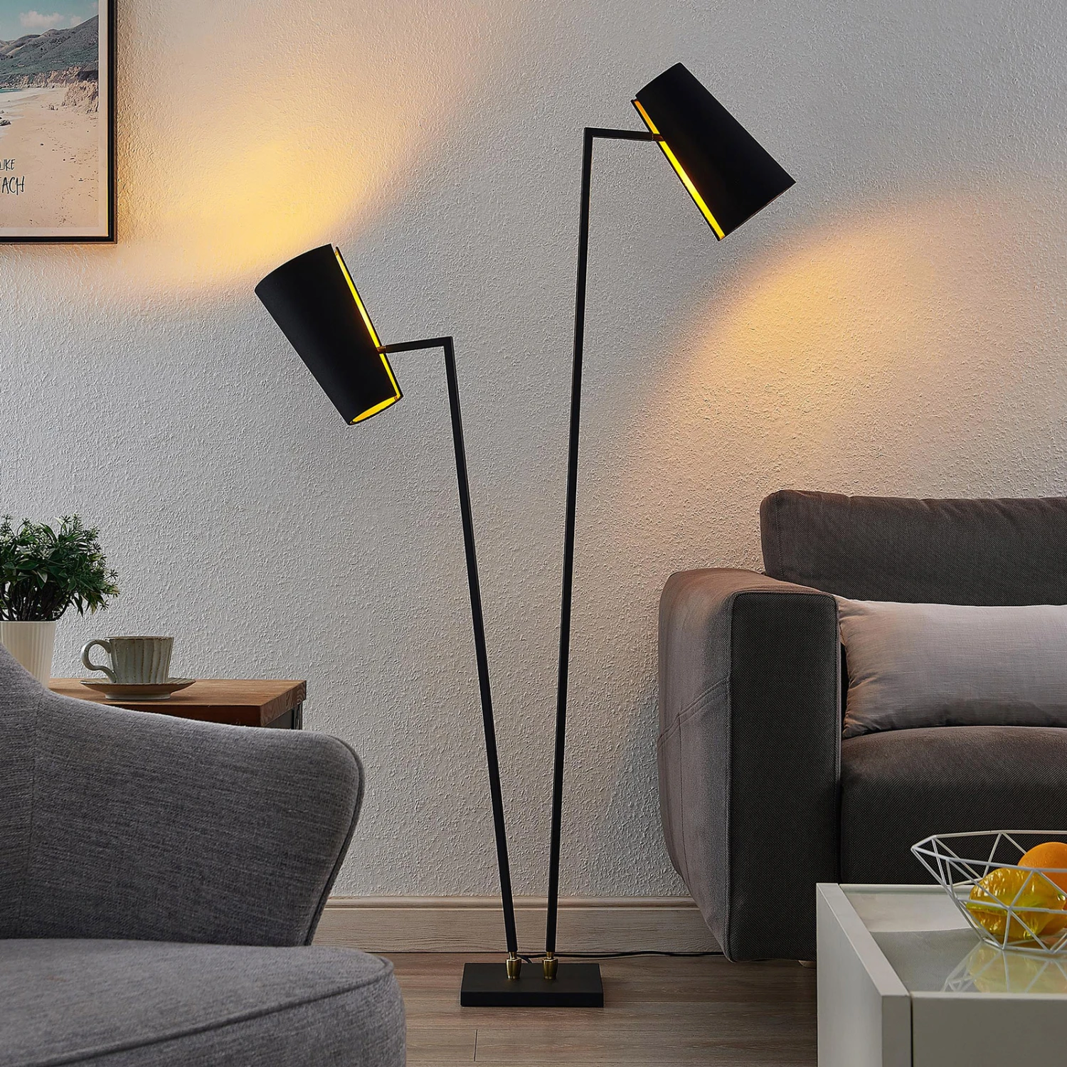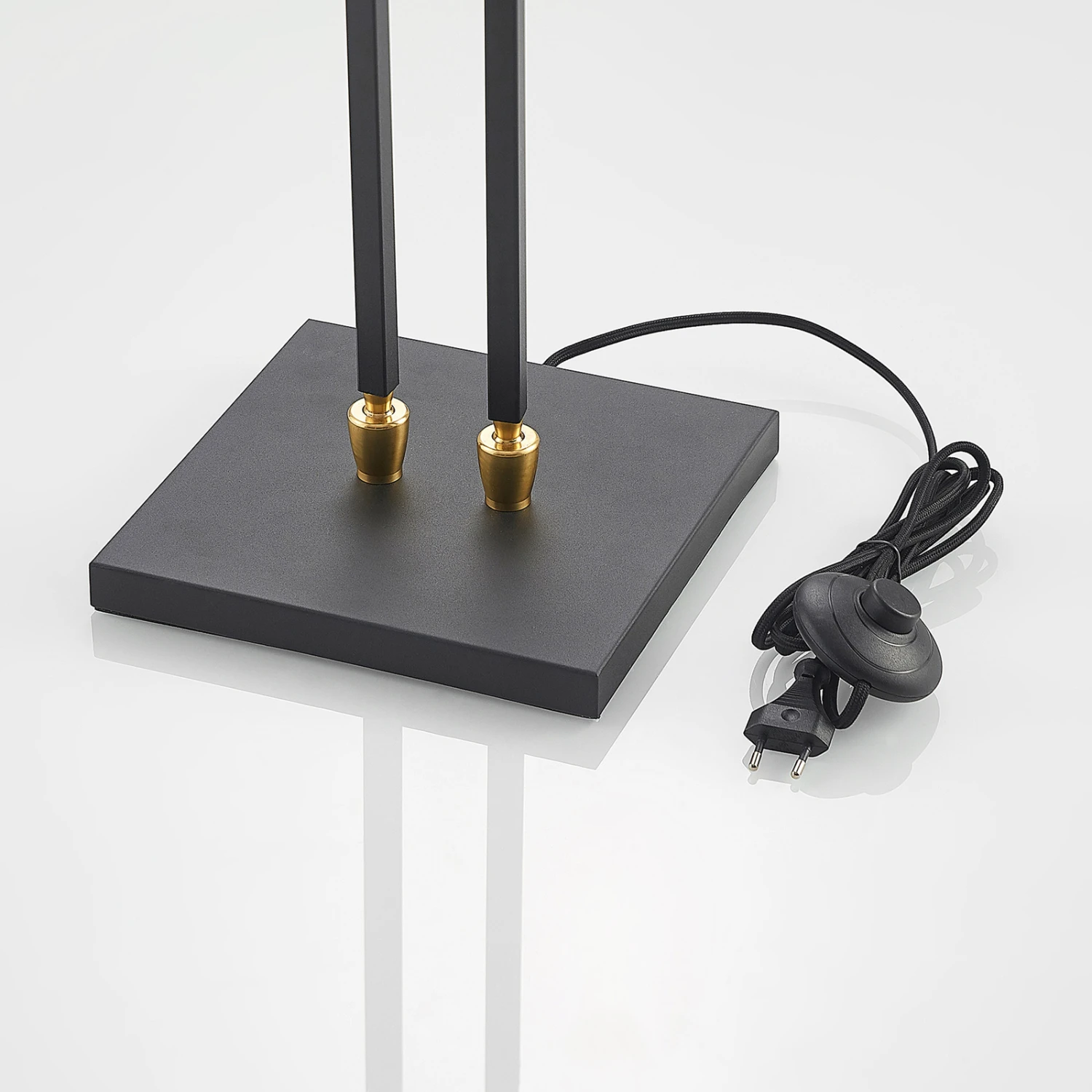 Die Stehleuchte Kemoni zeichnet sich durch ihr besonderes Design aus. Das schlanke, eiserne Gestell dieser Leuchte besteht aus einem stabilen, quadratischen Fuß und zwei filigranen Streben, an denen zwei Leuchtenschirme befestigt sind. Die Schirme wurden außen in einem klassisch schwarzen Ton gehalten und innen mit einem eleganten Gold verziert. Dies verleiht der Leuchte einen ganz besonderen Charakter und sorgt für warme Lichtakzente im Raum. Auch im ausgeschalteten Zustand macht Kemoni eine gute Figut und kann sowohl in den eigenen vier Wänden als auch in Bereich der Hotellerie zum Einsatz kommen.