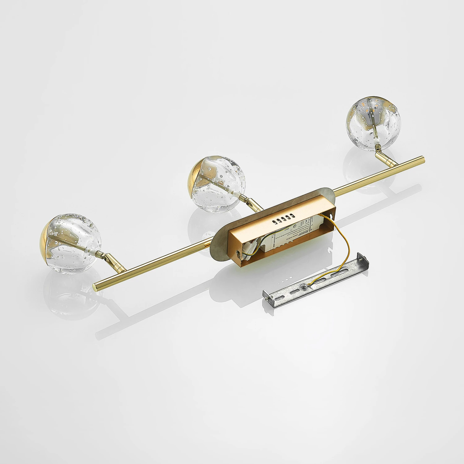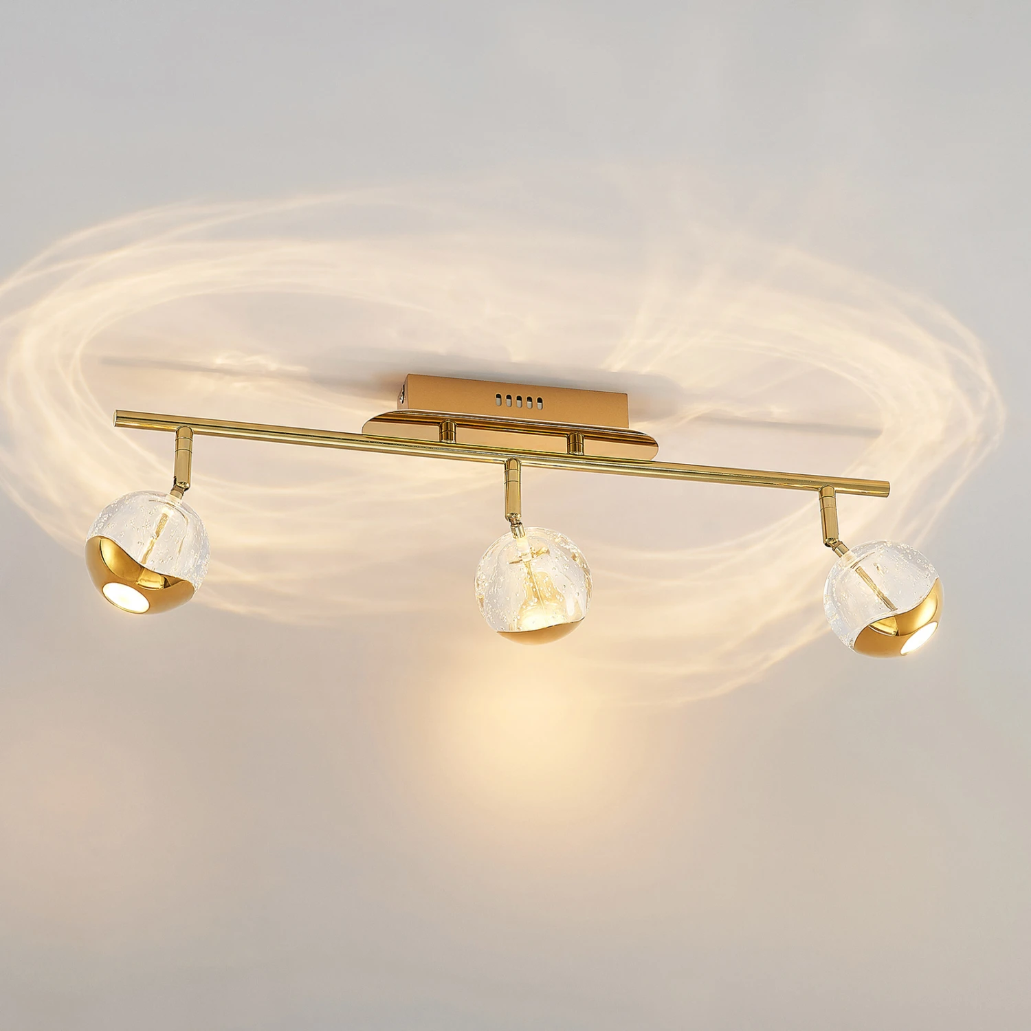 Goldglänzender LED-Deckenstrahler Kilio mit drei beweglichen Schirmen aus Blasenglas