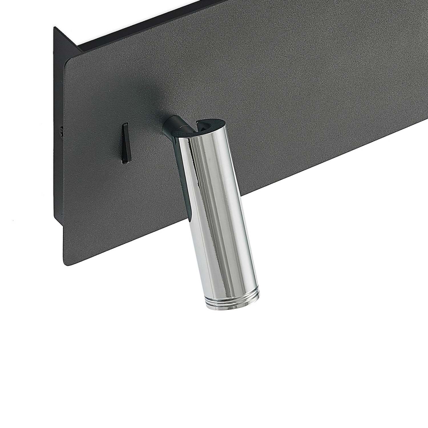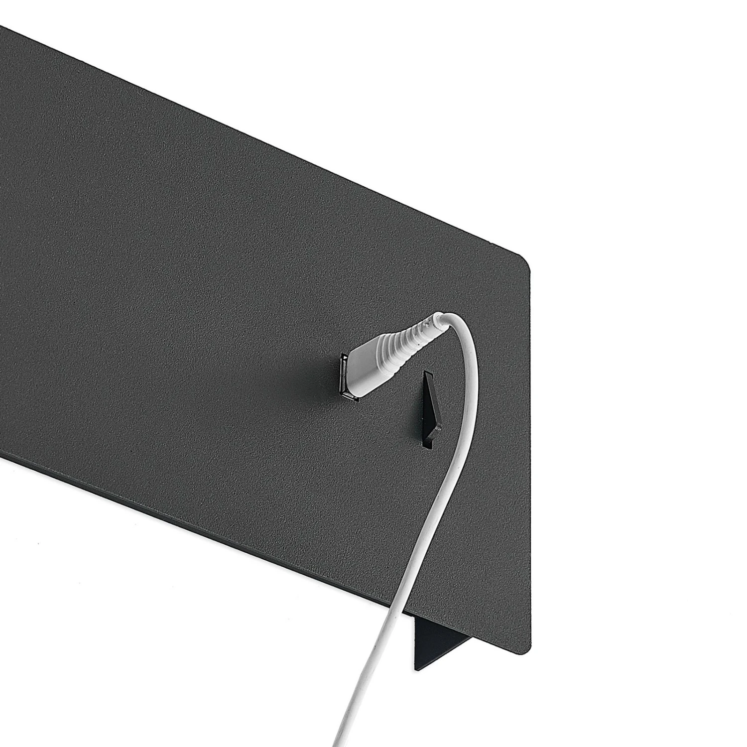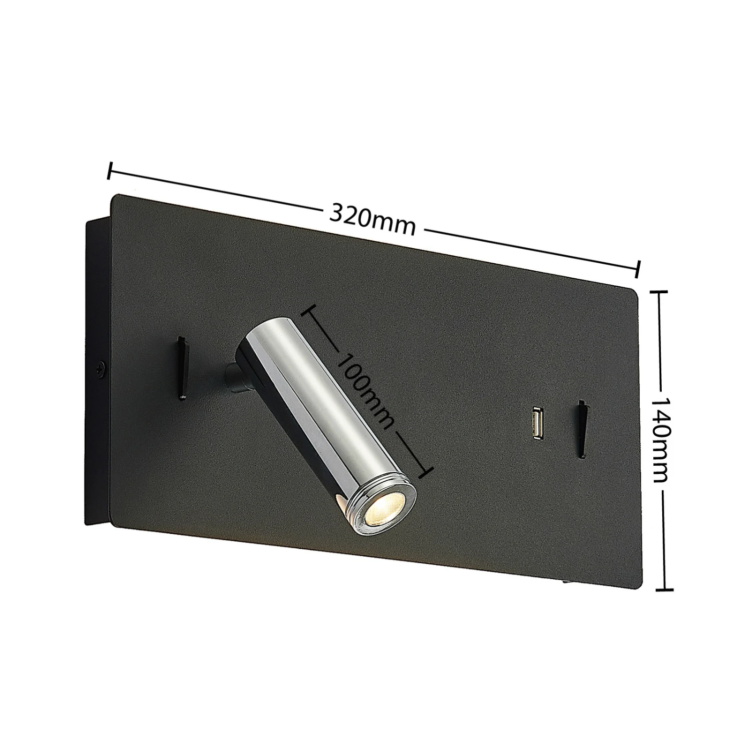 Schwarze, eckige LED-Wandlampe Kimo mit verstellbarem Strahler zum Lesen und USB-Port zum Laden