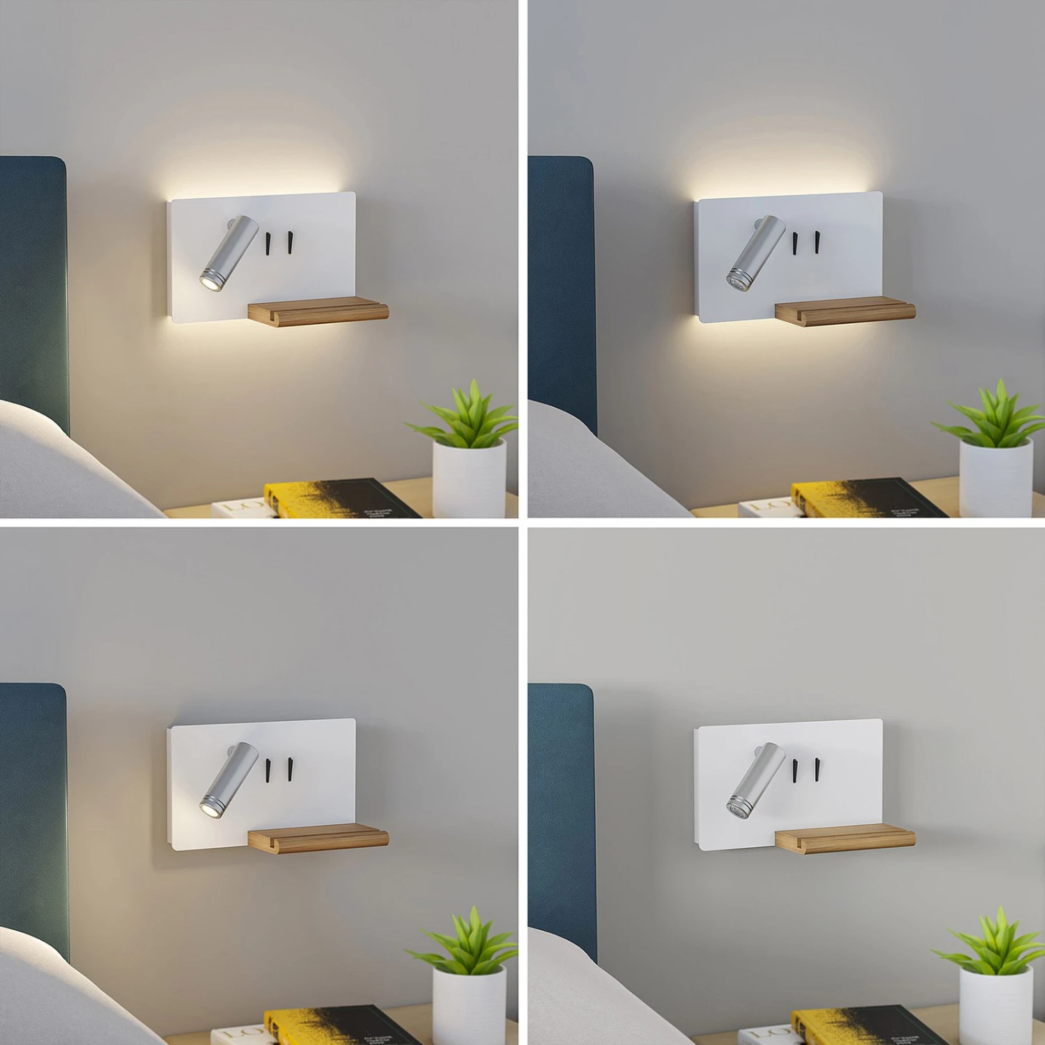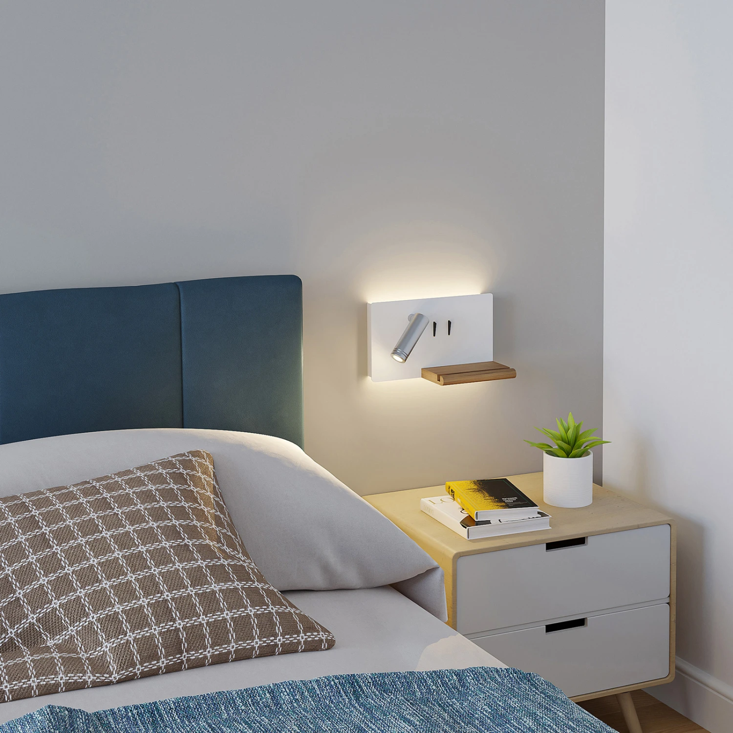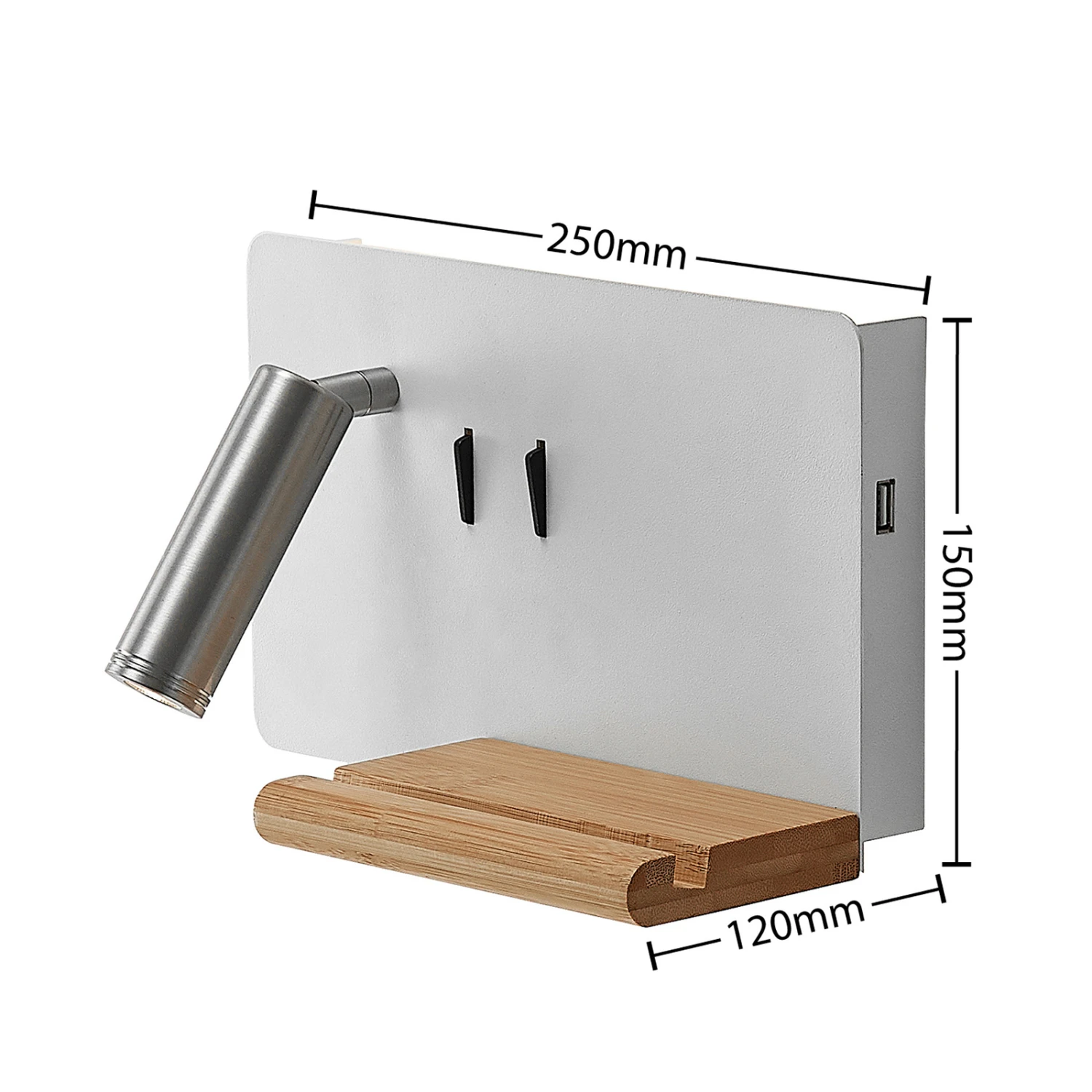 Eckige, weiße LED-Wandlampe Kimo mit USB-Anschluss und Ablage aus Bambusholz sowie einem schwenkbaren Leselicht