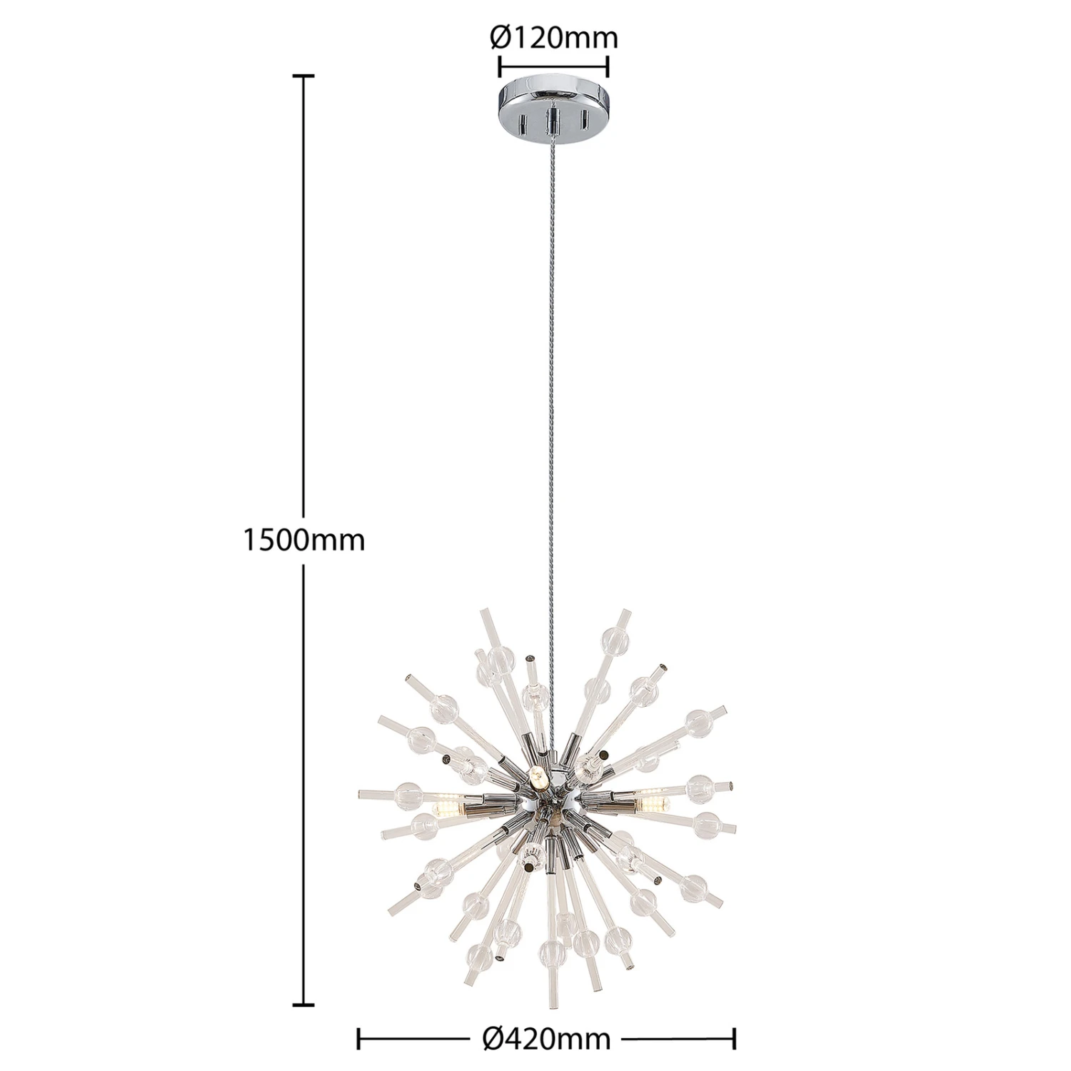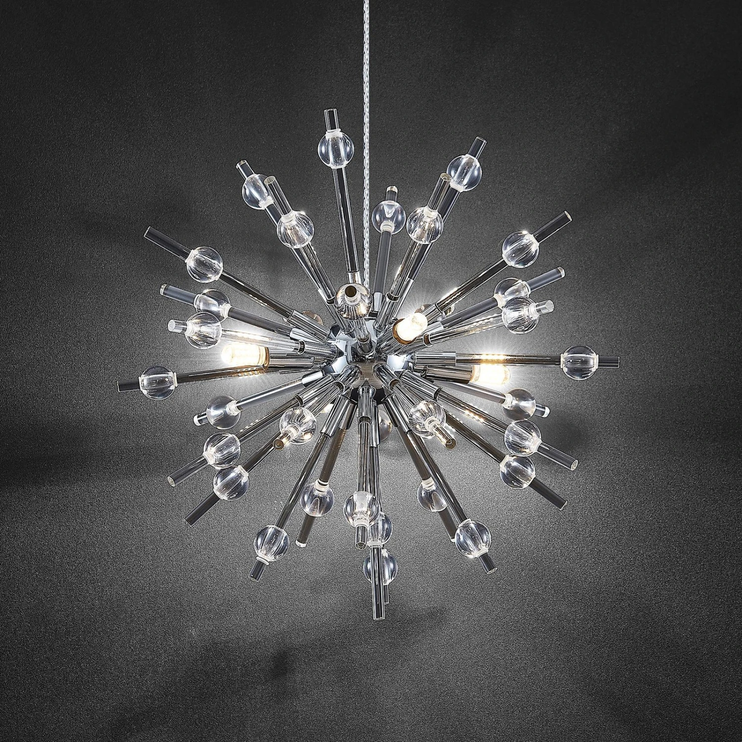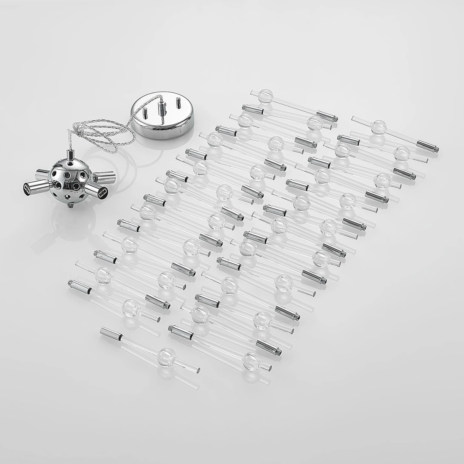 Die Deckenhalterung und Abhängung wuden ganz dezent gestaltet und bestehen aus Eisen, welches mit einem chromfarbenen Oberflächenfinish geschmückt wurde. Im Mittelpunkt steht jedoch der außergewöhnliche Leuchtenschirm, der aus vielen Glasstäbchen besteht, an denen kleine Kugeln aus Glas befestigt sind. Die Stäbchen sind in alle Richtungen verteilt und ergeben insgesamt die Form einer Kugel. Im Inneren sind vier Brennstellen verbaut, die mit G9-Leuchtmitteln ausgestattet werden können. Dabei ist die Wahl der Leuchtmittel dem Nutzer überlassen.