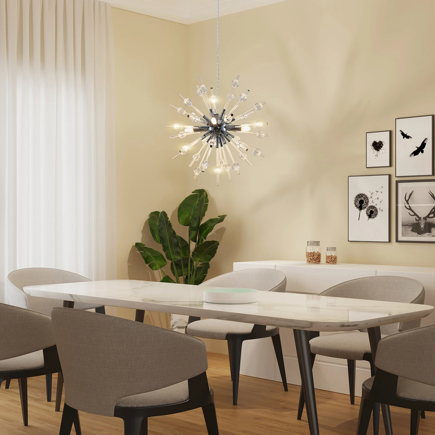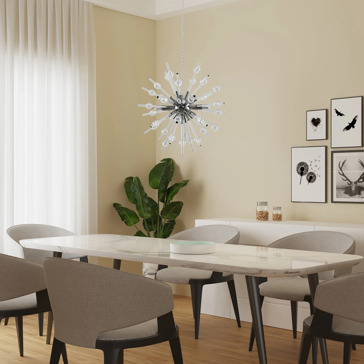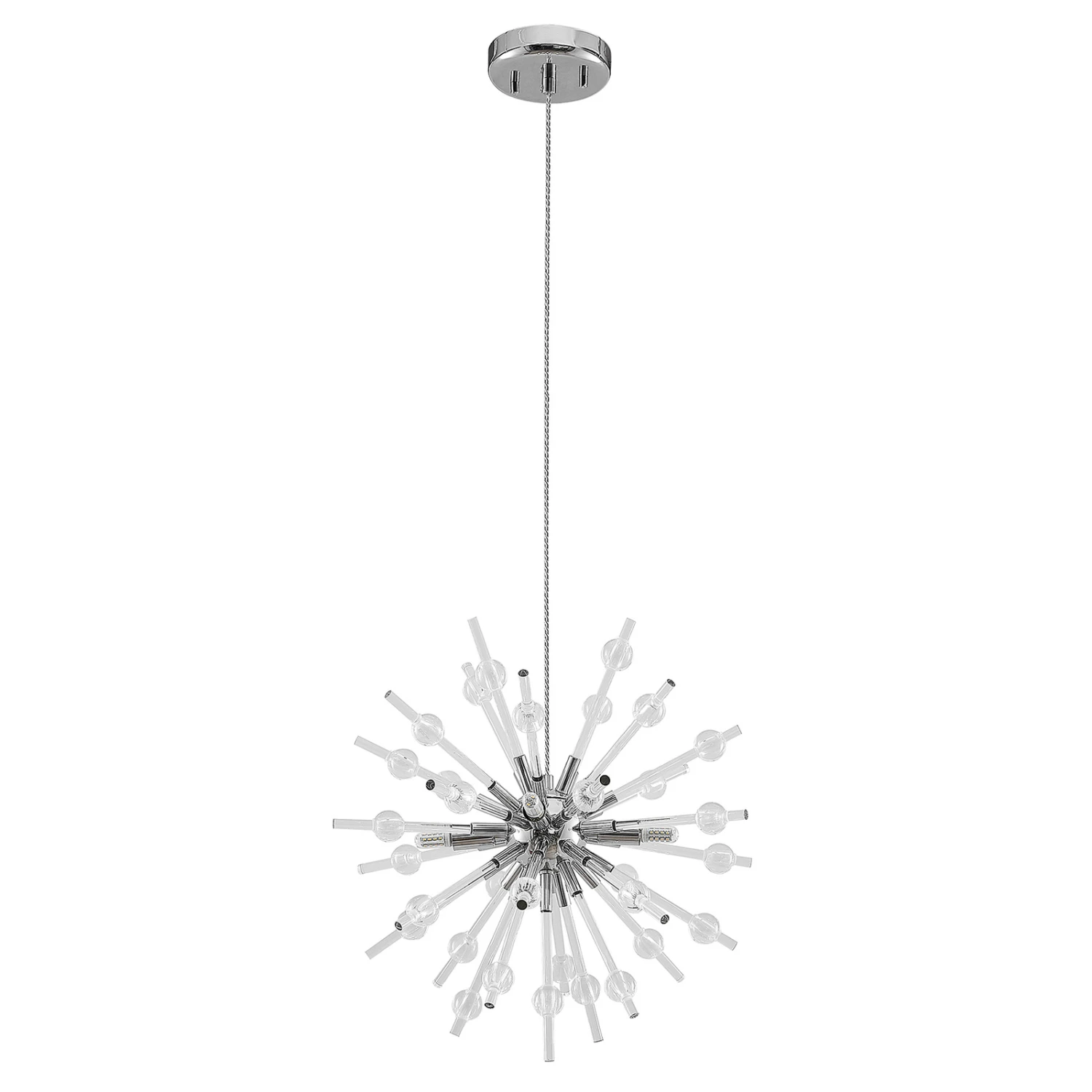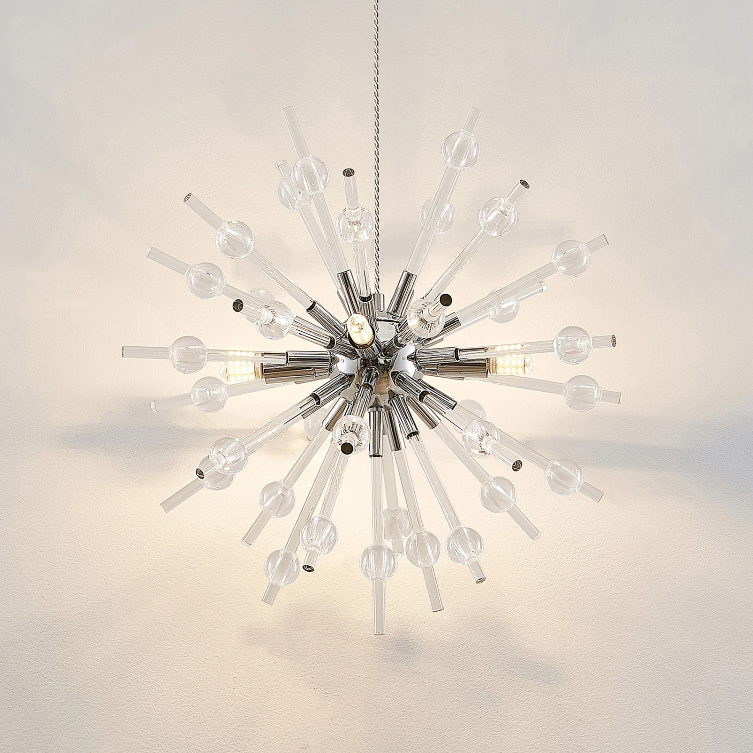 Die Deckenhalterung und Abhängung wuden ganz dezent gestaltet und bestehen aus Eisen, welches mit einem chromfarbenen Oberflächenfinish geschmückt wurde. Im Mittelpunkt steht jedoch der außergewöhnliche Leuchtenschirm, der aus vielen Glasstäbchen besteht, an denen kleine Kugeln aus Glas befestigt sind. Die Stäbchen sind in alle Richtungen verteilt und ergeben insgesamt die Form einer Kugel. Im Inneren sind vier Brennstellen verbaut, die mit G9-Leuchtmitteln ausgestattet werden können. Dabei ist die Wahl der Leuchtmittel dem Nutzer überlassen.