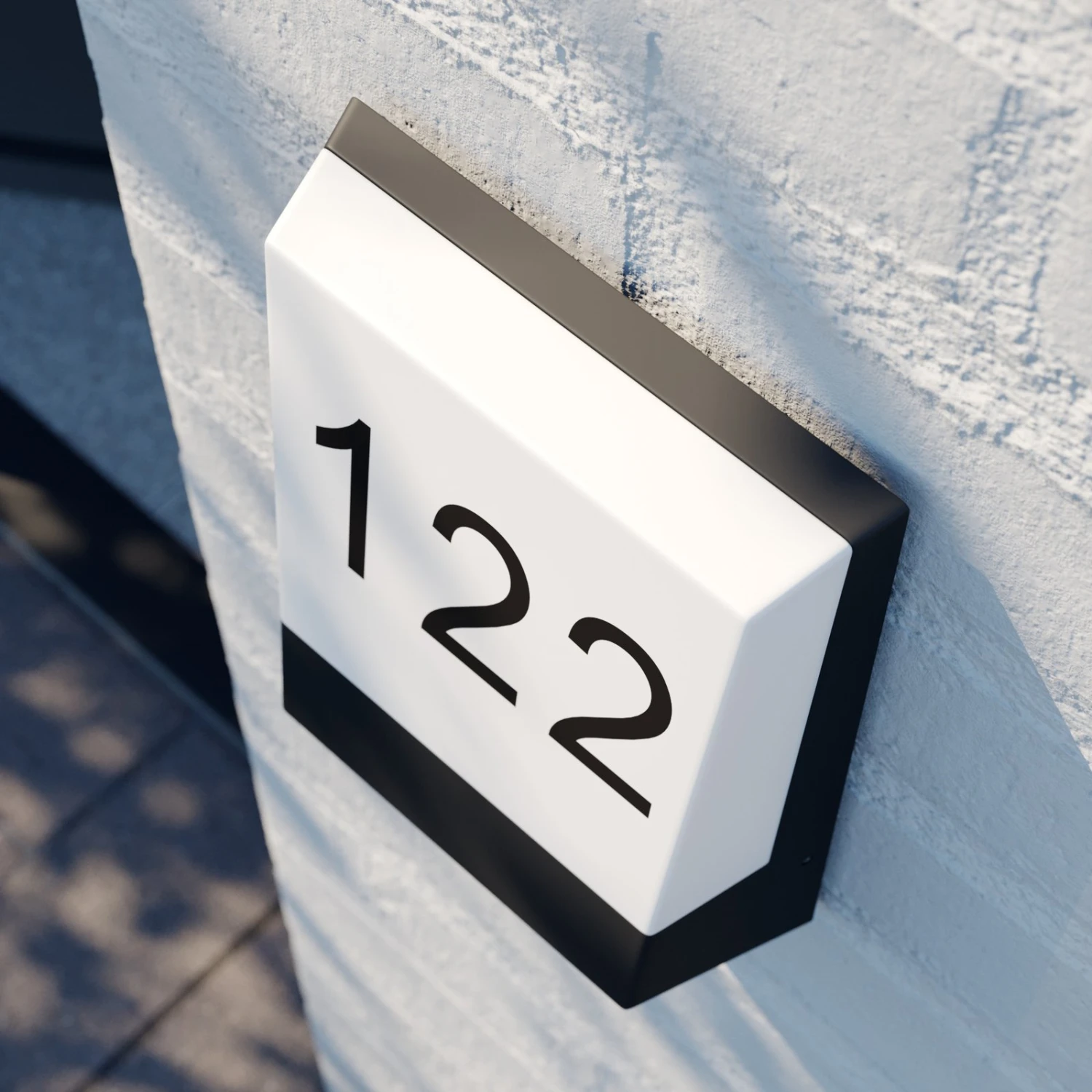 Die LED-Hausnummernleuchte Kosman vereint viele Vorteile in sich. Die großen, schwarzen Zahlen kommen auf dem weißen Hintergrund der Leuchtmittelabdeckung hervorragend zur Geltung. Durch den Infrarot-Bewegungssensor schaltet die Leuchte das Licht ein, sobald sich jemand nähert. Das sorgt zum einen dafür, dass Stolperfallen rechtzeitig erkannt werden können und zum anderen, dass unerwünschte Personen, die nichts Gutes im Sinn haben, abgeschreckt werden. Das Design der LED-Wandleuchte Kosman ist durch den nahtlosen Übergang vom Dunkelgrau des Gestells in das Weiß der Abdeckung besonders reizvoll gestaltet.
