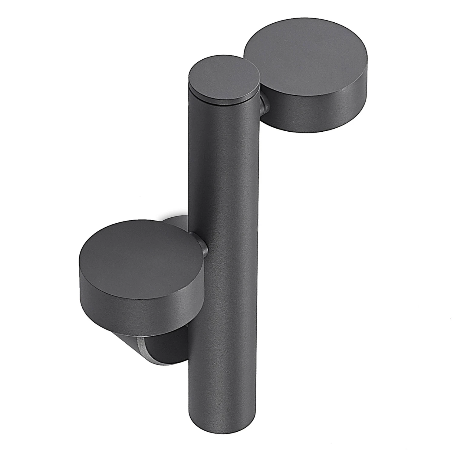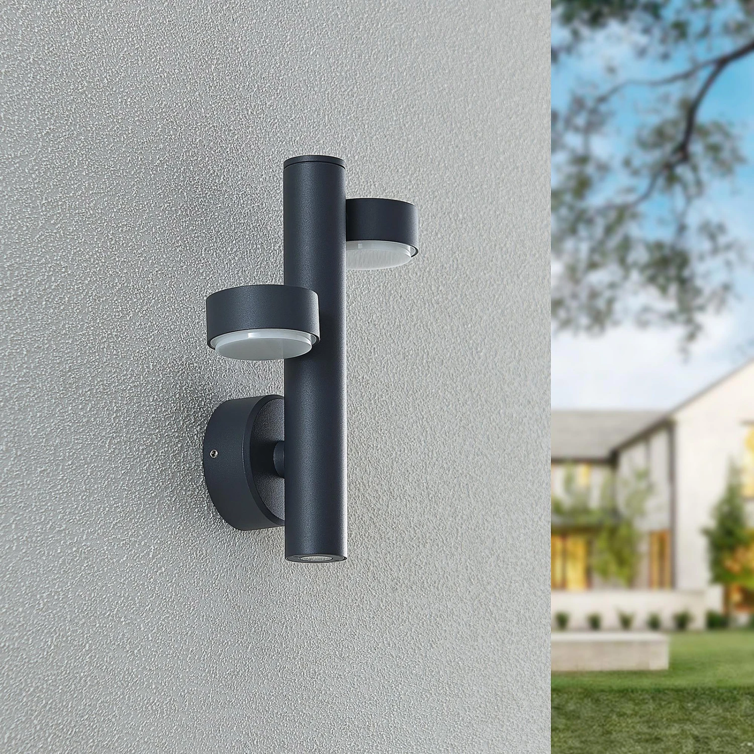 Die LED-Wandleuchte Kynlee ist eine robuste und moderne Beleuchtung für den Außenbereich. Ihr Leuchtenkörper ist aus Aluminium gefertigt und ihre Oberfläche besitzt eine dunklegraue Farbe. An ihrer runden Wandhalterung ist ein Röhre angebracht, an der jeweils an einer Seite ein kompakter Leuchtenschirm angebracht ist. Die LED-Wandlampe Kynlee verfügt über festverbaute LEDs, welche ein warmweißes Licht erzeugen und ein stimmiges Ambiente für den Außenbereich generieren. Durch die Schutzart IP54 ist die Leuchte nachweislich gegen Staub und Spritzwasser geschützt.