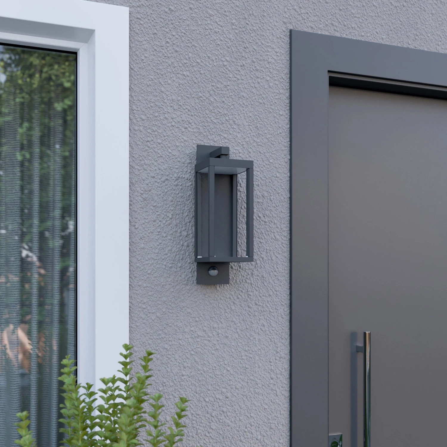Die Laternenform ist hier sehr modern und geradlinig interpretiert, wodurch die LED-Außenwandleuchte besonders gut zu zeitgemäßer Architektur passt.