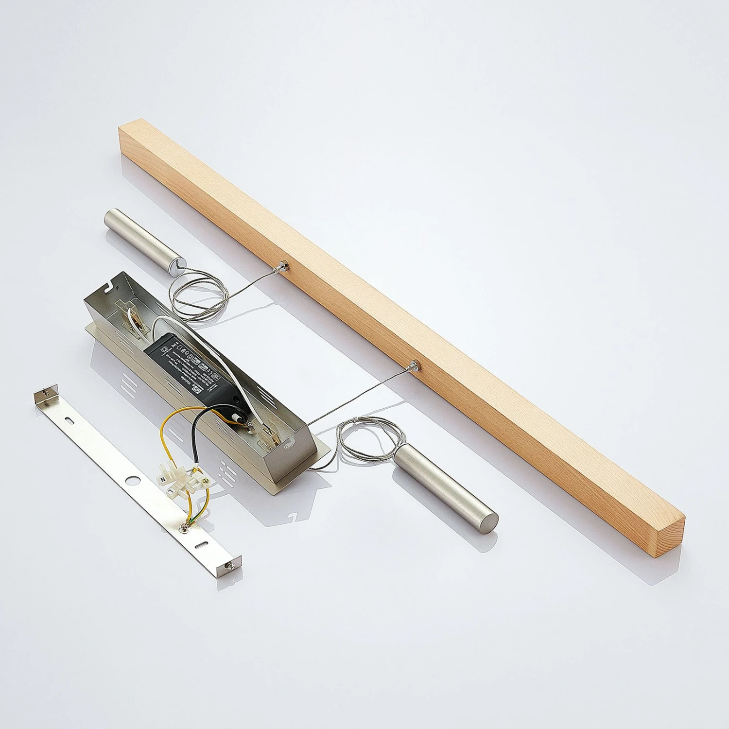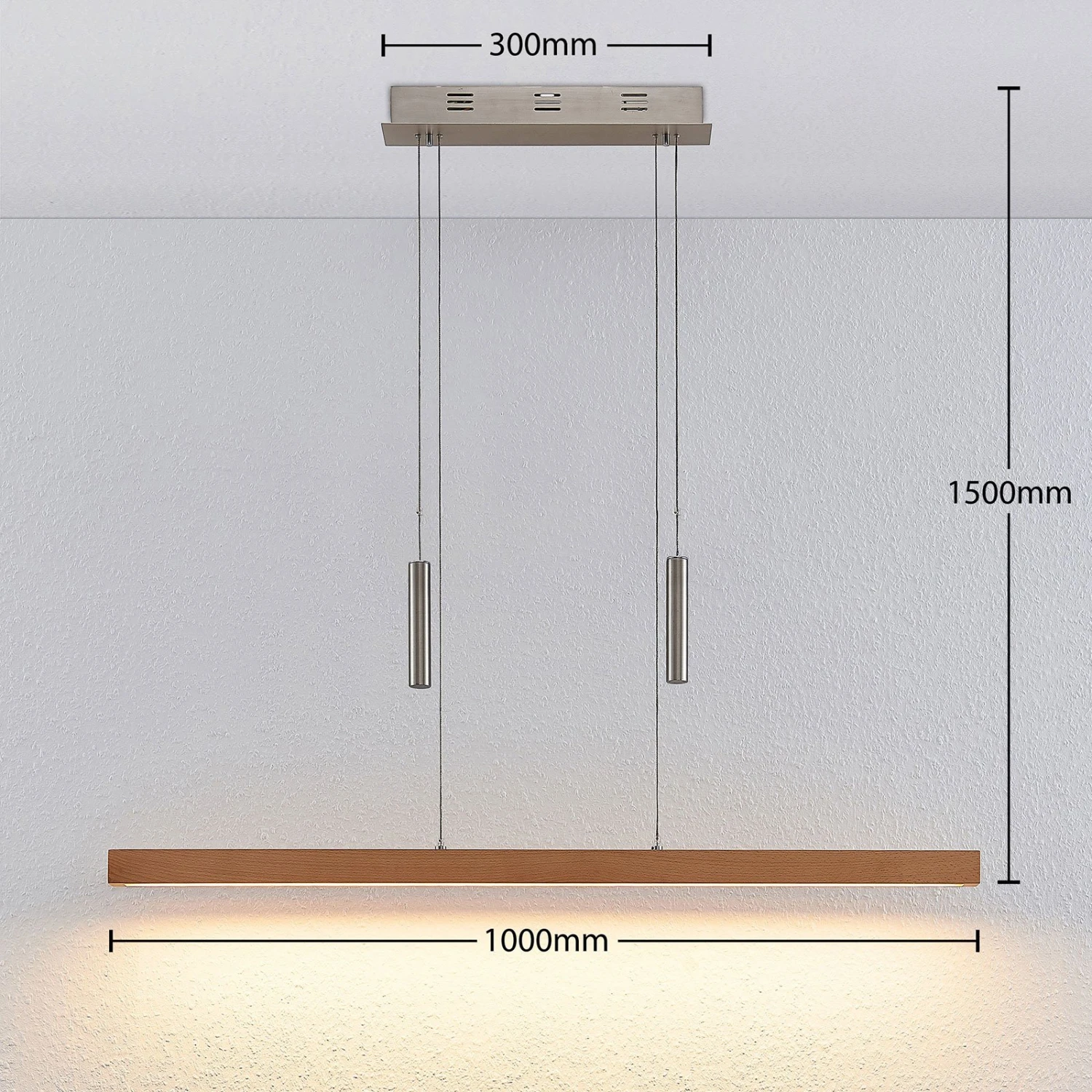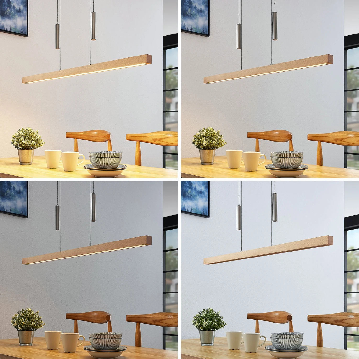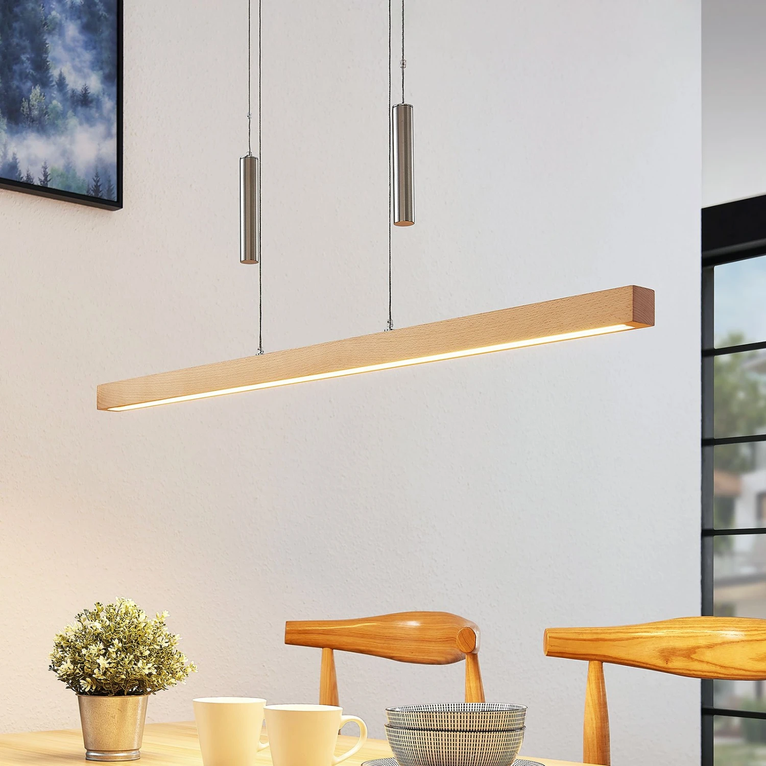 Diese balkenförmige Pendelleuchte hat einen sehr modern erscheinenden Schirm aus buchefarbenem Holz und lässt sich über den integrierten Seilzugmechanismus bequem in der Höhe verstellen, von 120 cm bis 210 cm. Der Lichtschein der LEDs wird nach unten abgestrahlt, was gemeinsam mit der länglichen Form und der Seilzugtechnik ein Indiz dafür ist, dass Pia sehr gut zur Tischbeleuchtung geeignet ist. Daher lässt sie sich hervorragend in moderne Esszimmer integrieren und sorgt dort trotz aller Modernität auch für ein natürliches Flair, denn schließlich besteht der längliches Schirm aus echtem Holz. Über einen externen Dimmer hat man zudem die Möglichkeit, die Helligkeit der leuchtstarken LED-Balkenpendelleuchte anzupassen.