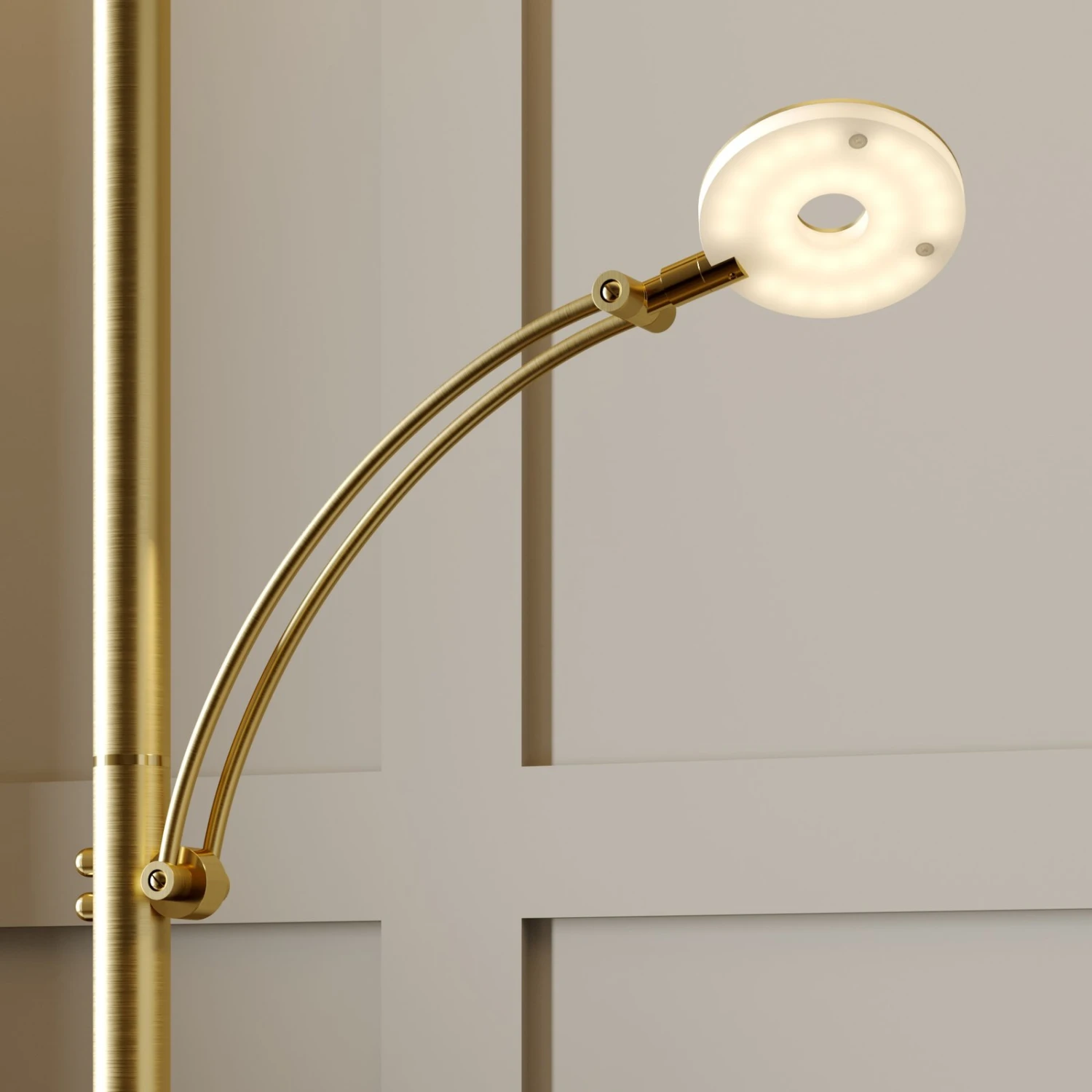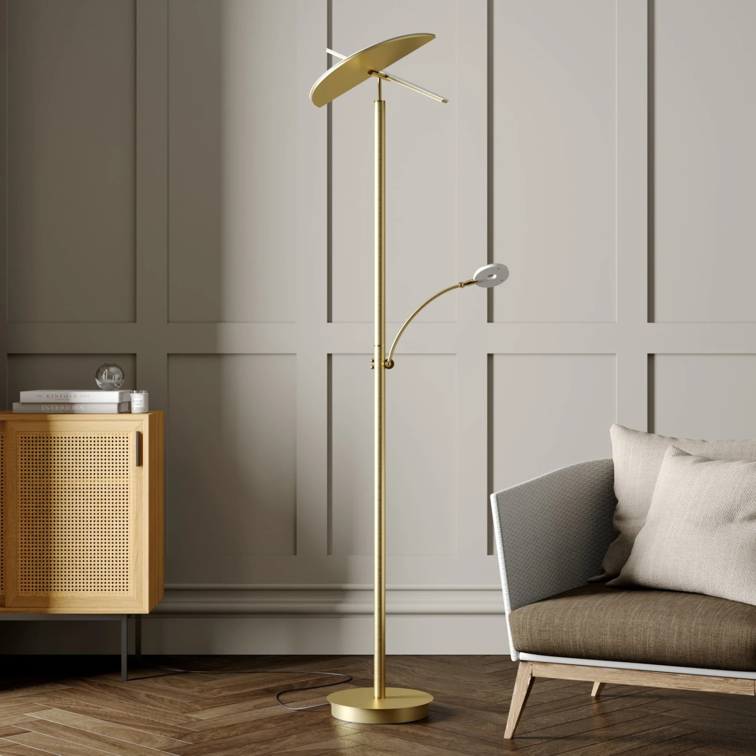 Messingfarbener LED-Deckenfluter Anniki mit verstellbarer Leuchtfläche und separatem Leselicht, dimmbar