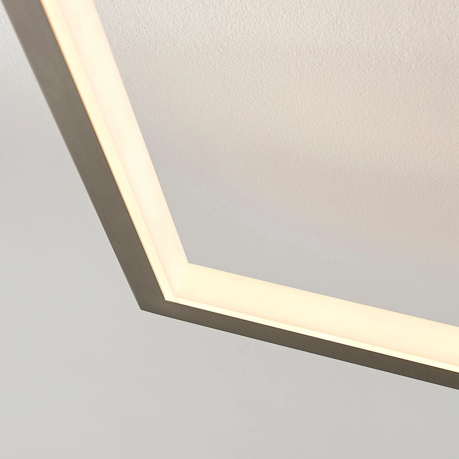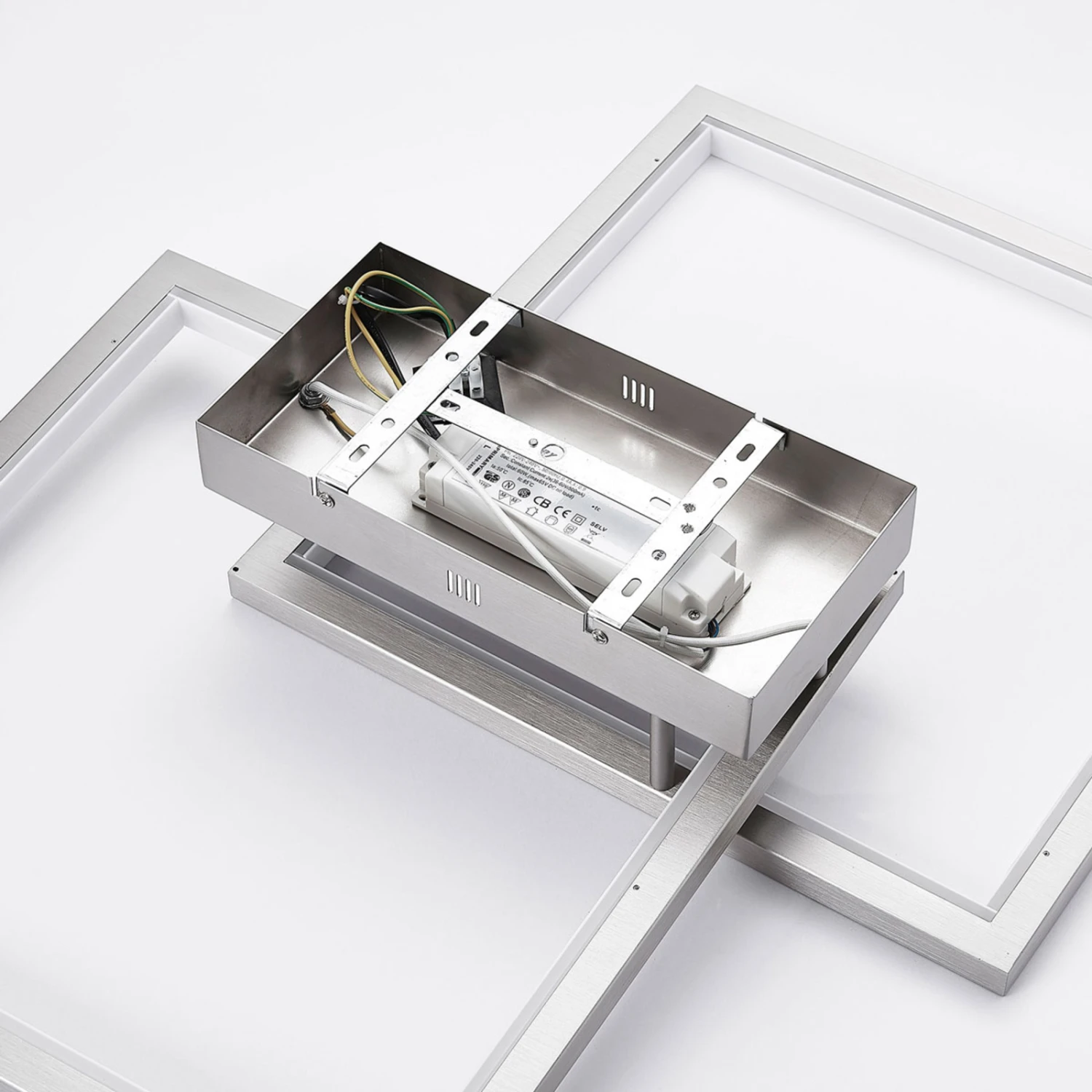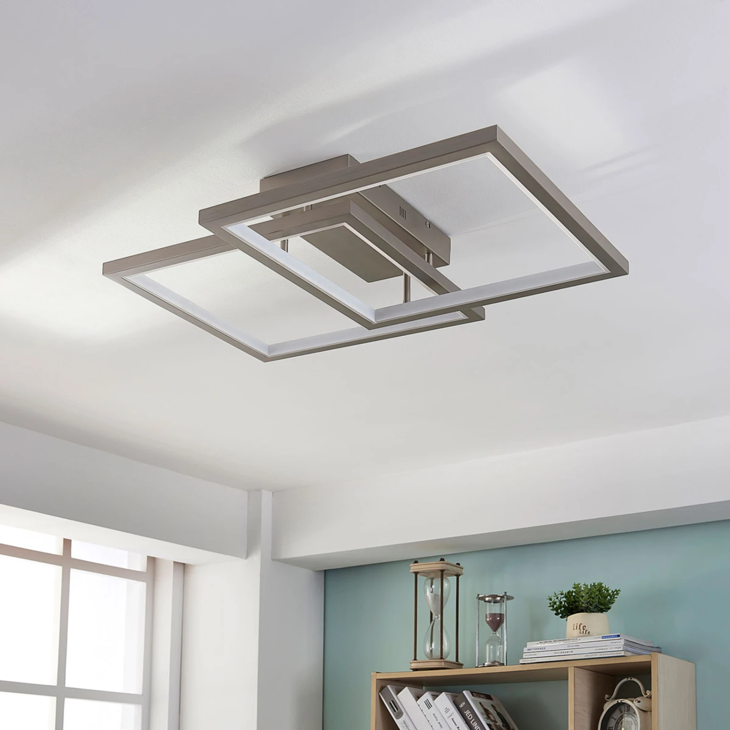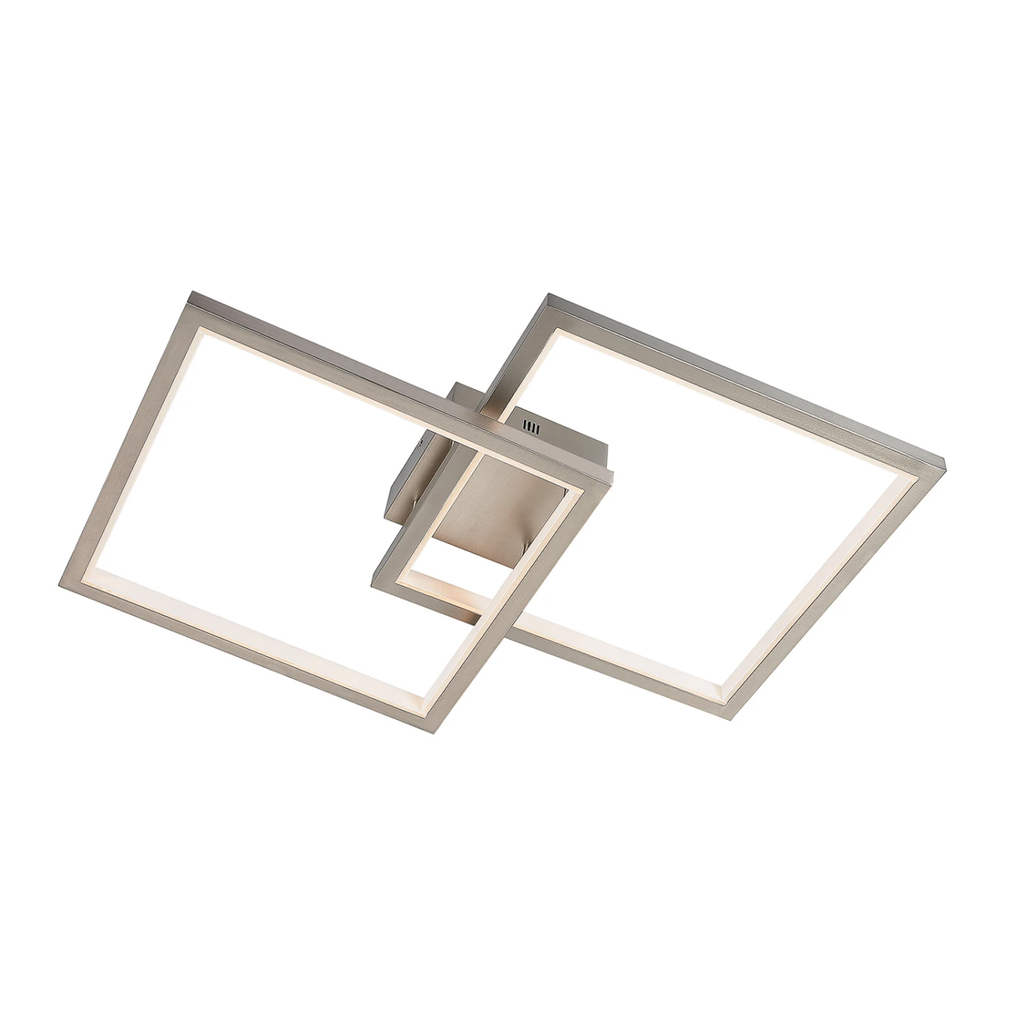 Heriba setzt sich aus zwei Metallrahmen zusammen, die an der Innenseite mit LED-Bändern versehen worden sind und daher angenehm wohnlichen Lichtschein erzeugen. Über einen ganz normalen Wandschalter kann man die Leuchte in vier Stufen in der Helligkeit regulieren, so dass mehr Komfort bei der täglichen Beleuchtung entsteht und man mit der Leuchte persönlichen Bedürfnissen besser gerecht werden kann.