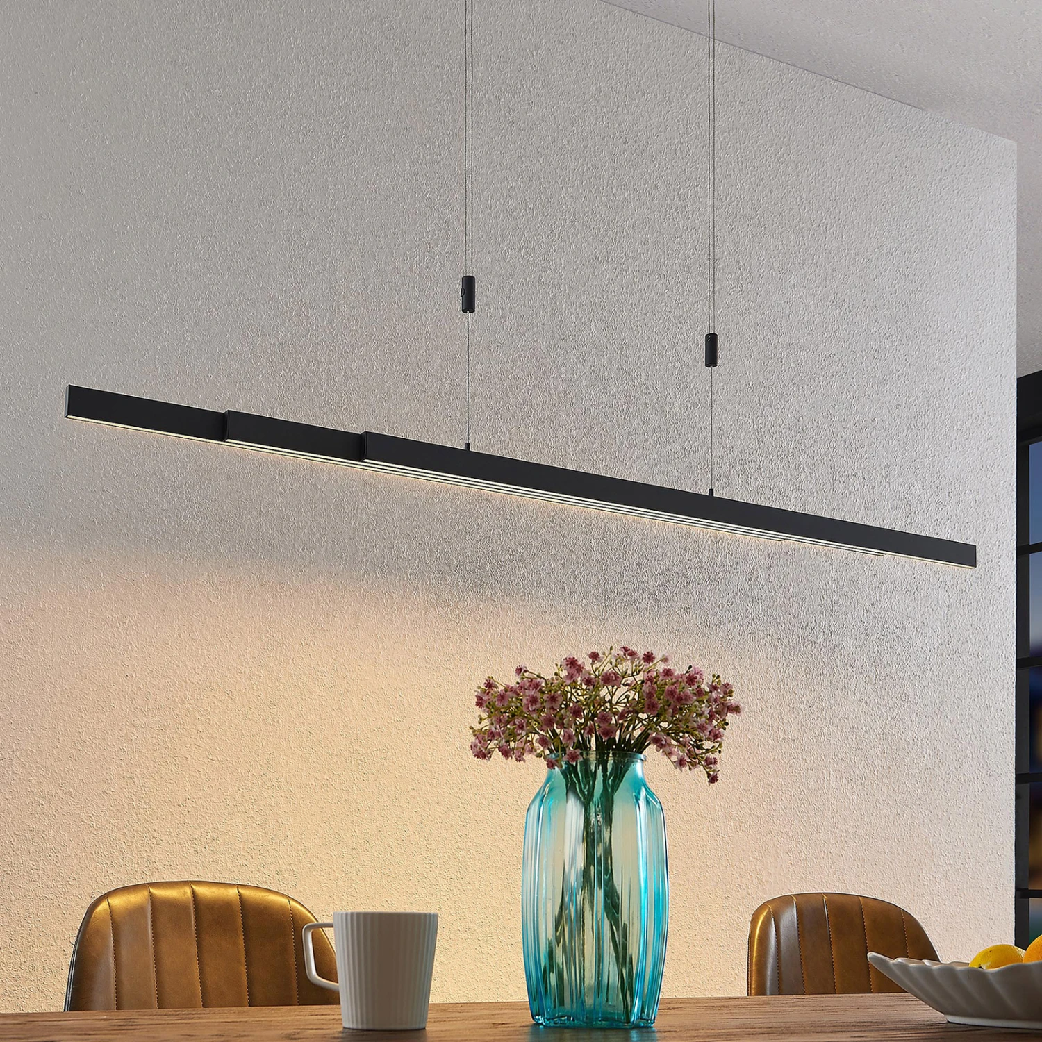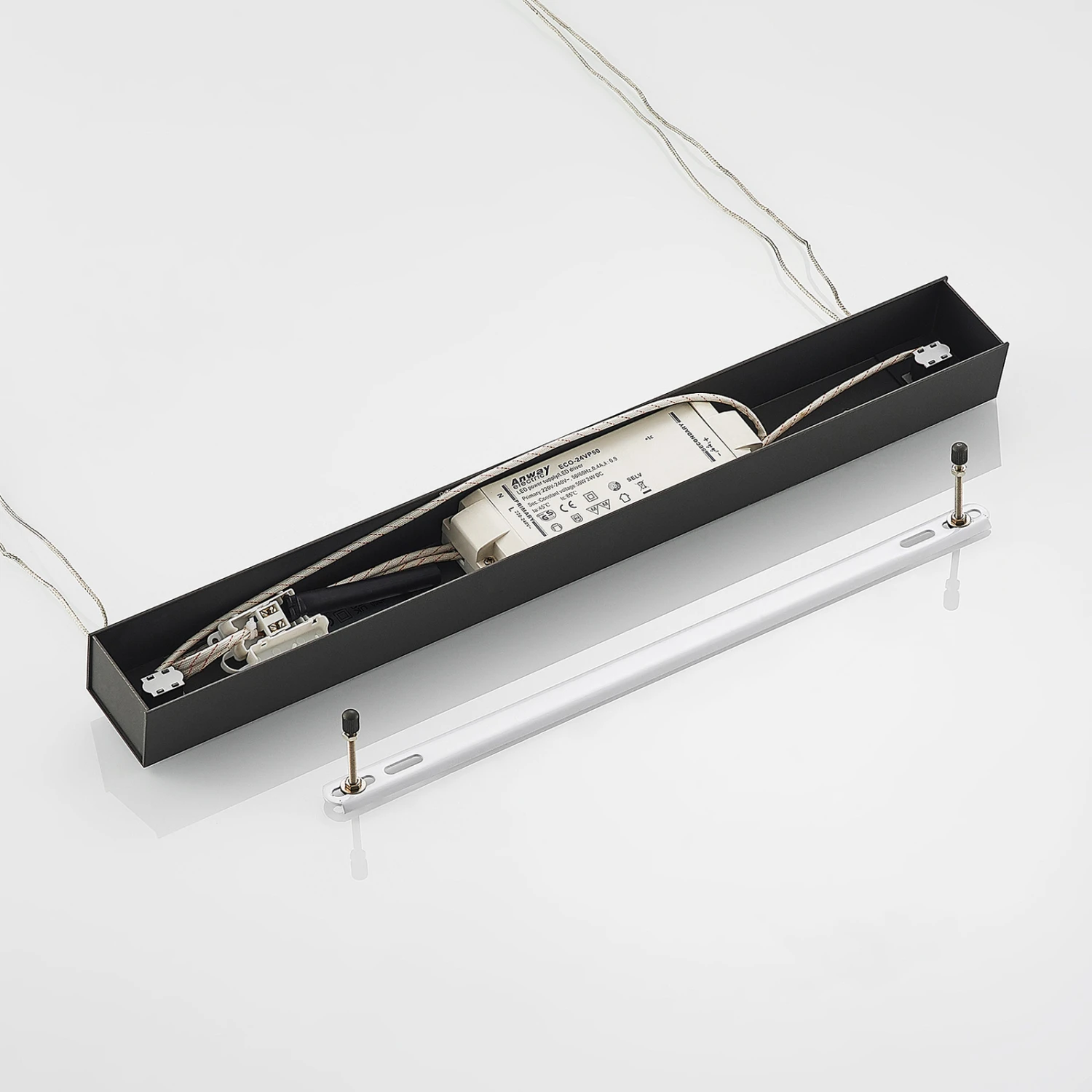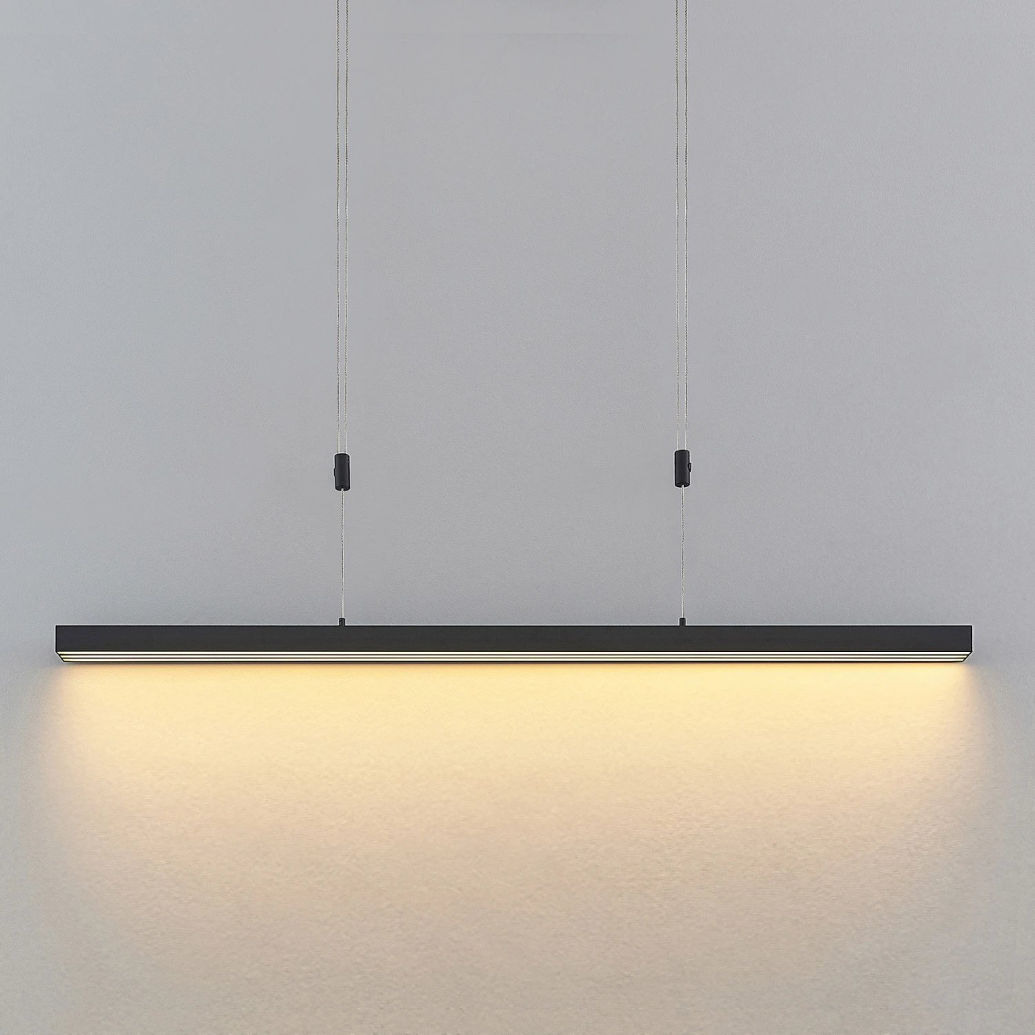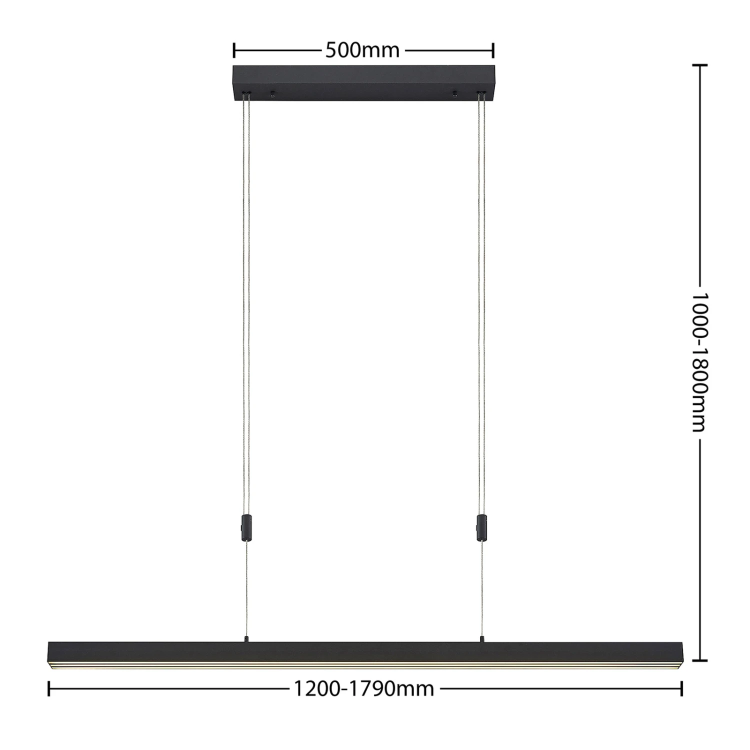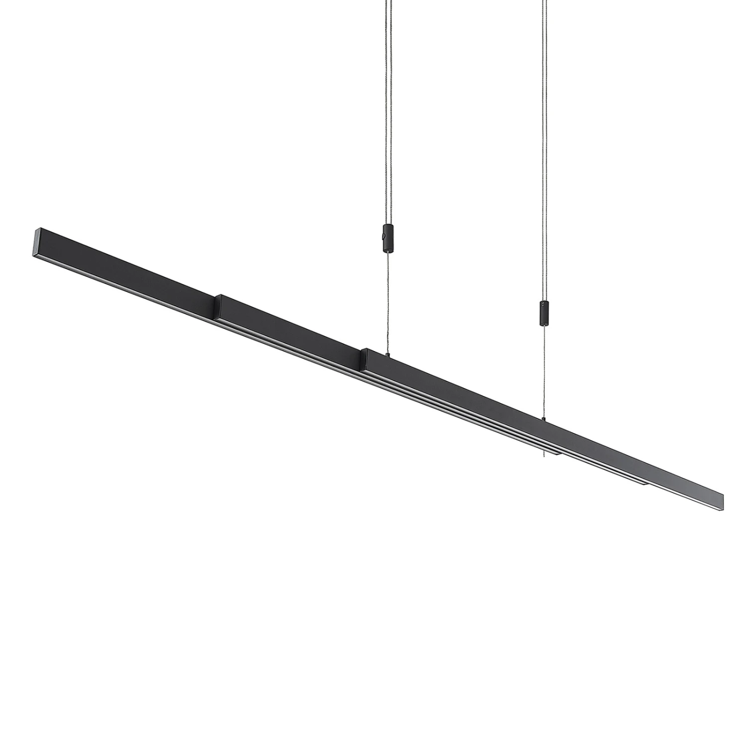 Ein schlankes Design und kantige Formen prägen die Optik der LED-Hängeleuchte Merrit, einer Lichtquelle, die sich besonders gut zur Beleuchtung von Esstischen, Küchentheken u. a. in modern eingerichteten Wohnungen eignet. Die Abhängung lässt sich mit wenigen Handgriffen verstellen, so dass die lange, schmale Leuchte immer perfekt über dem Tisch hängt und auch in der Länge kann die Leuchte durch Ausziehen der seitlichen Elemente verstellt werden, und zwar im Bereich von 120 cm bis hin zu 179 cm. Auch in Bezug auf die Lichtgestaltung ist die LED-Hängeleuchte Merrit sehr vielseitig, denn die Lichtfarbe kann im Bereich von warmweißer Beleuchtung bis hin zu universalweißem Licht eingestellt werden und auch die Helligkeit kann dank des integrierten Touchdimmers variiert werden. Diese hohe Funktionalität und Flexibilität ermöglicht eine Lichteinstellung, die jeder Situation entsprechend angepasst werden kann.