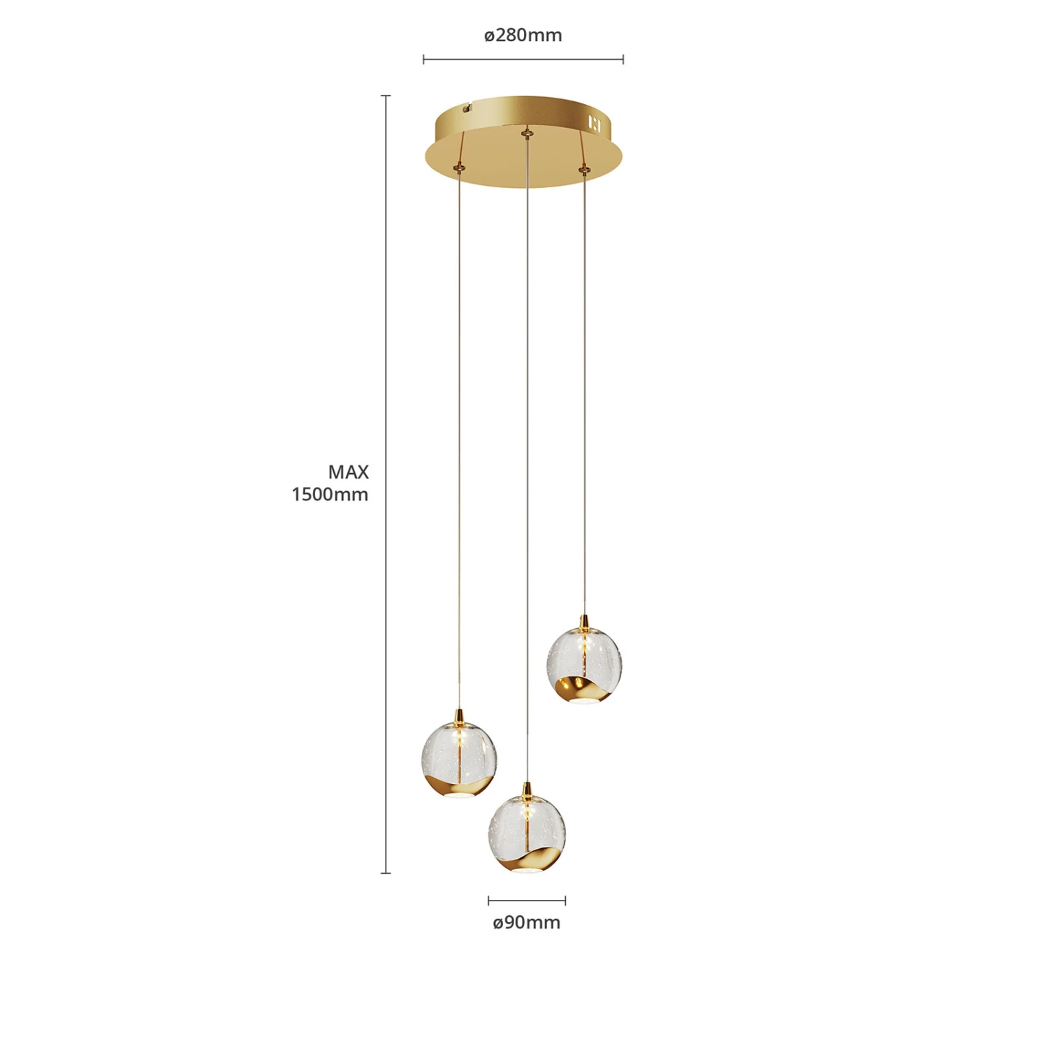 LED-Hängeleuchte Hayley mit drei Glaskugeln und Metallelementen in glänzendem Gold