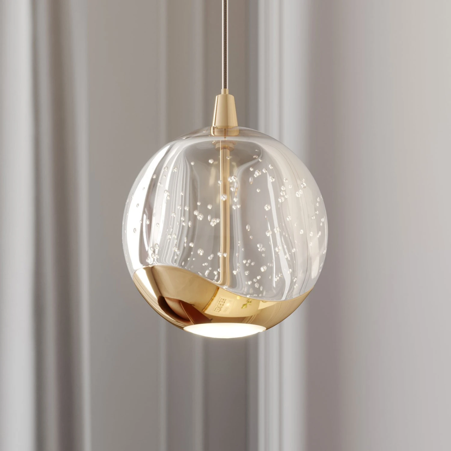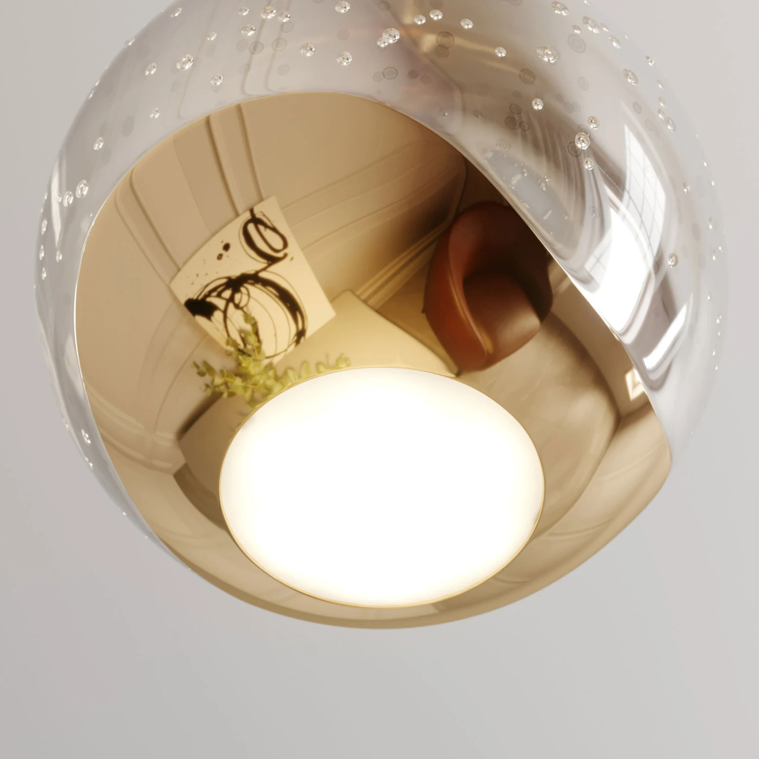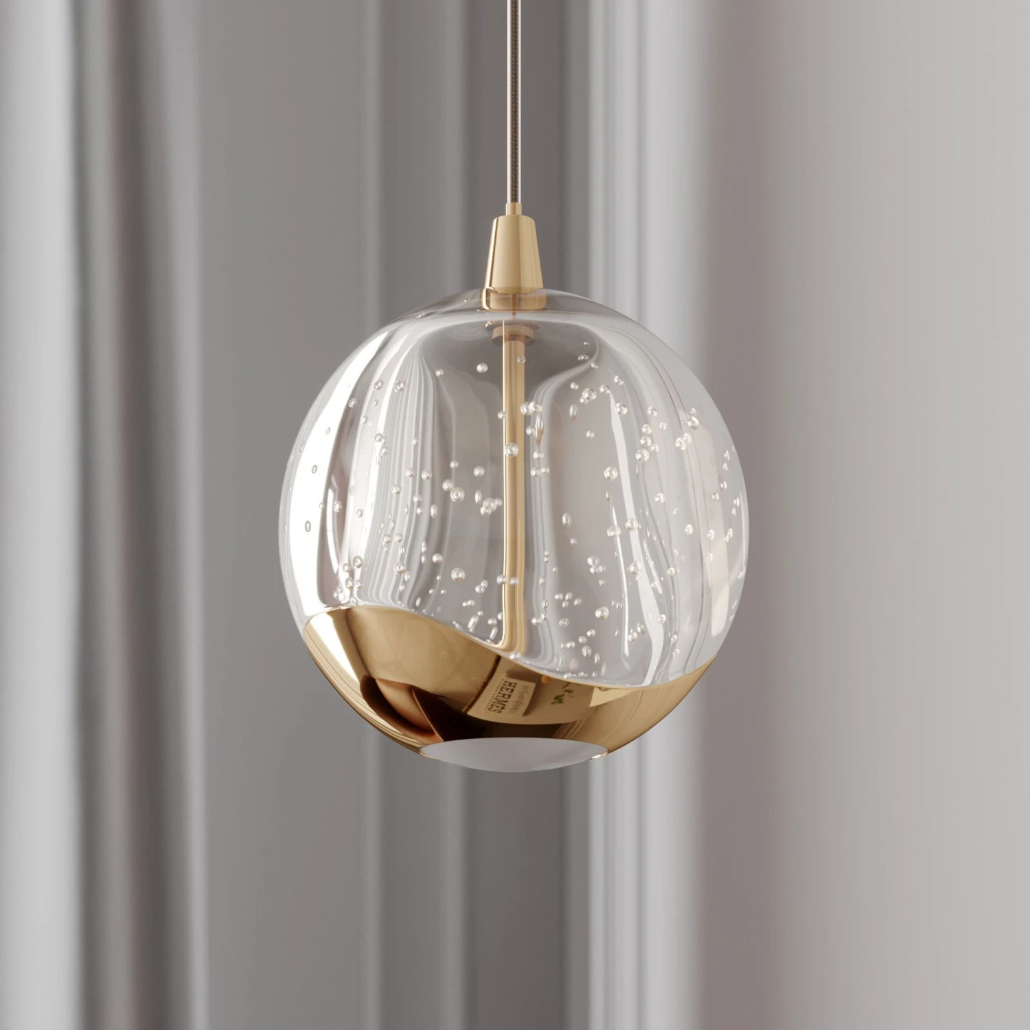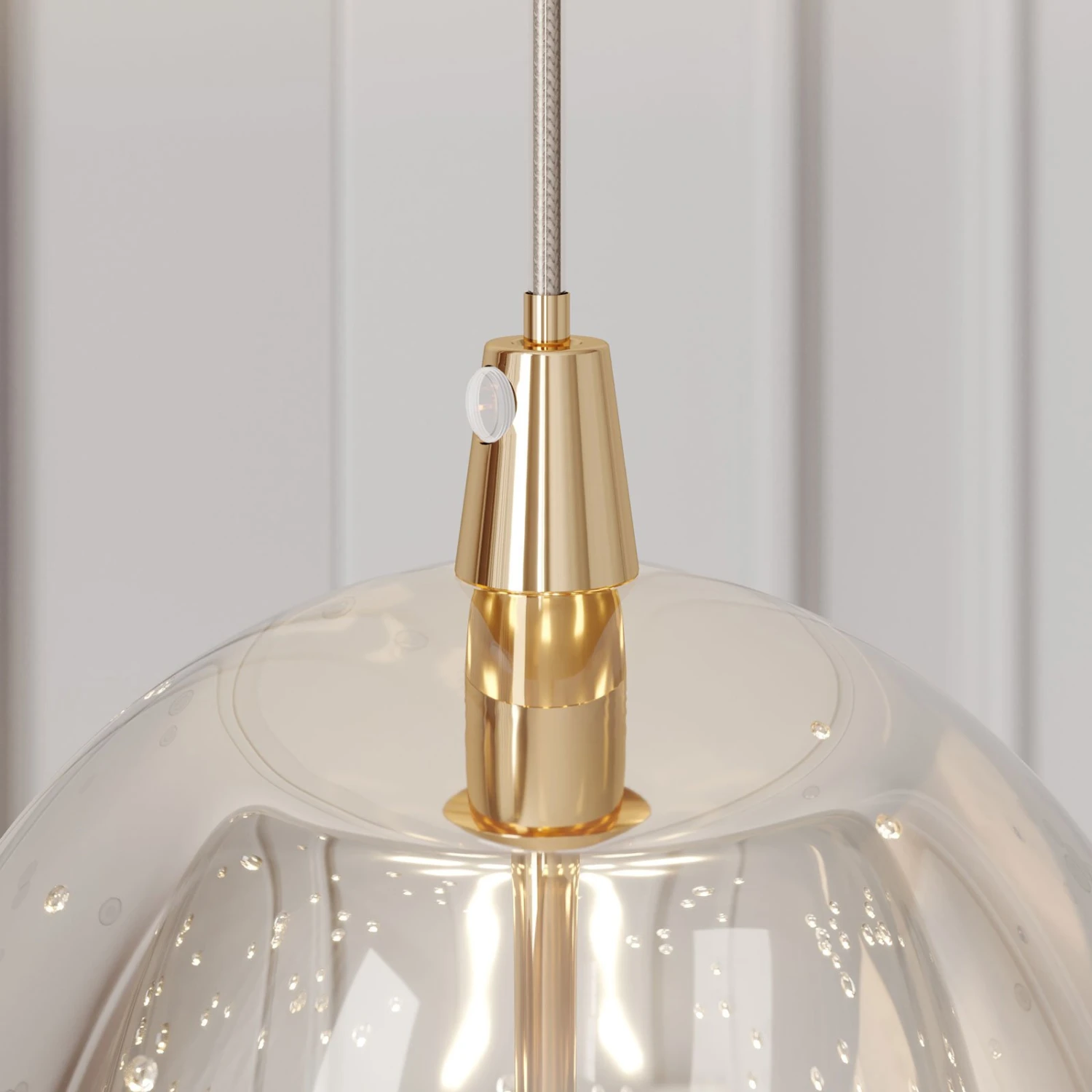 Kugelförmige LED-Hängeleuchte Hayley mit goldfarbenen Elementen und einem Schirm aus Glas mit Blasenstruktur