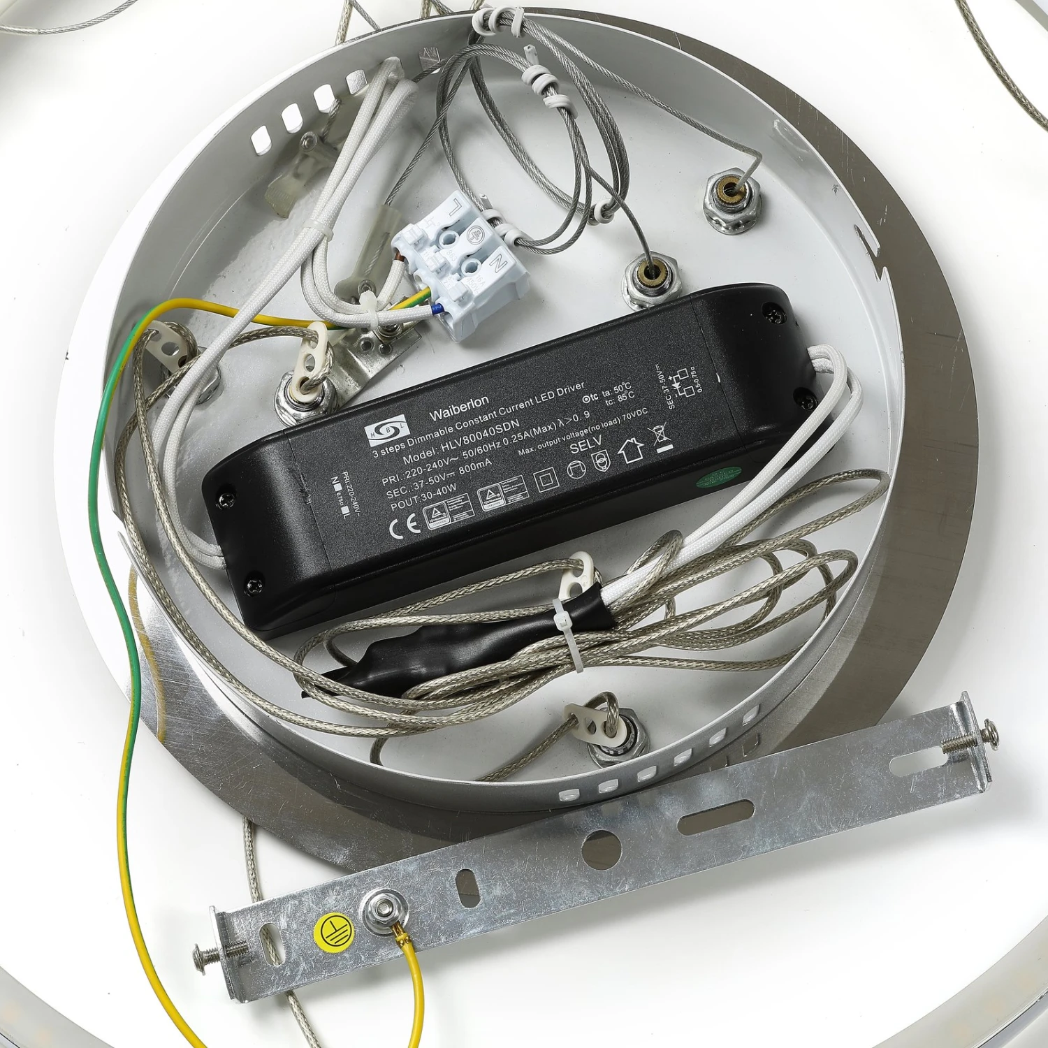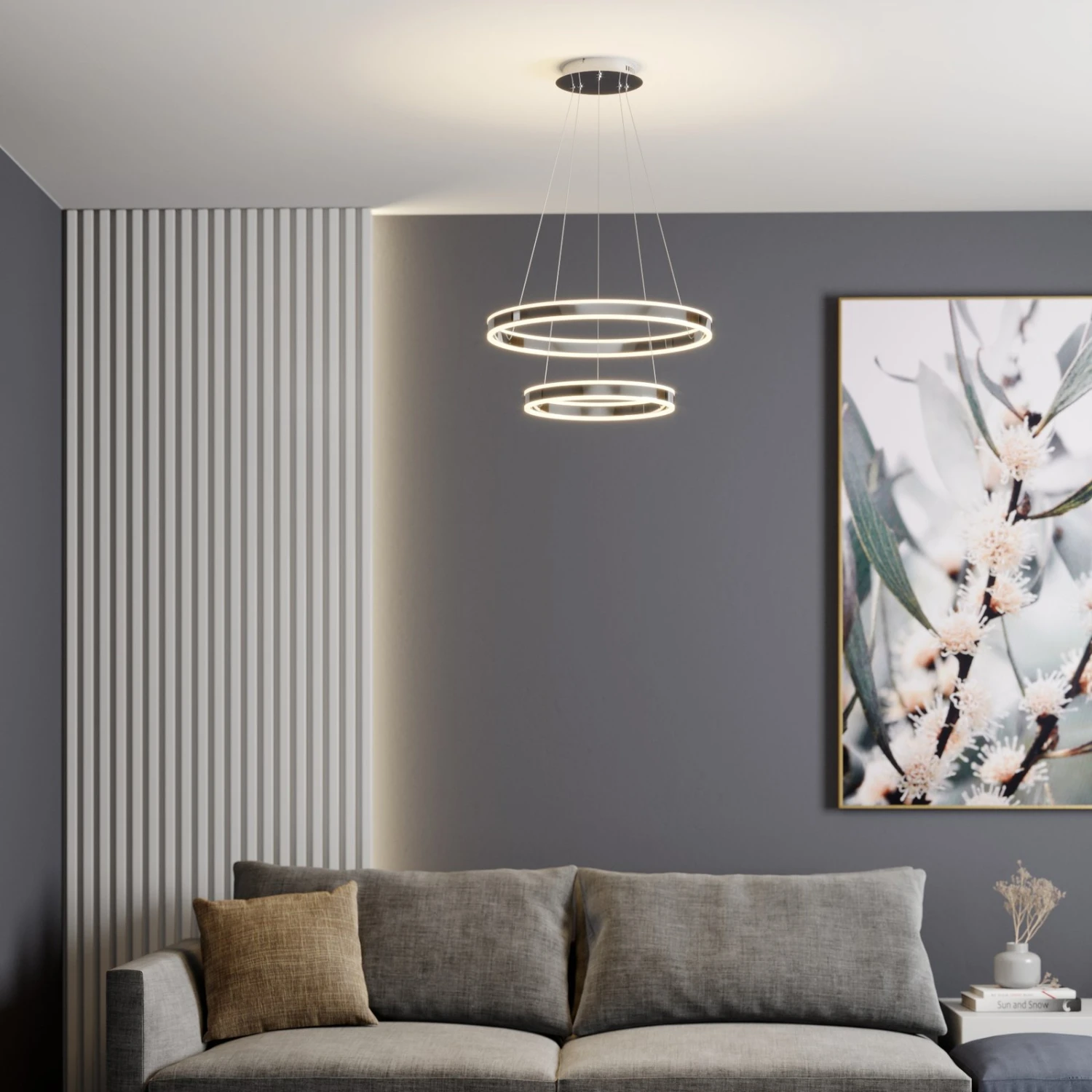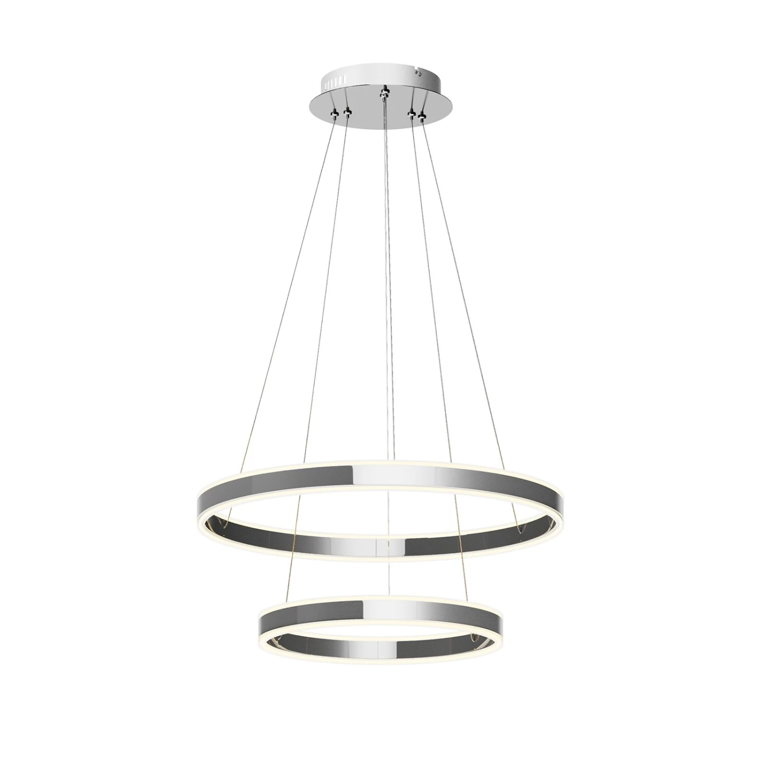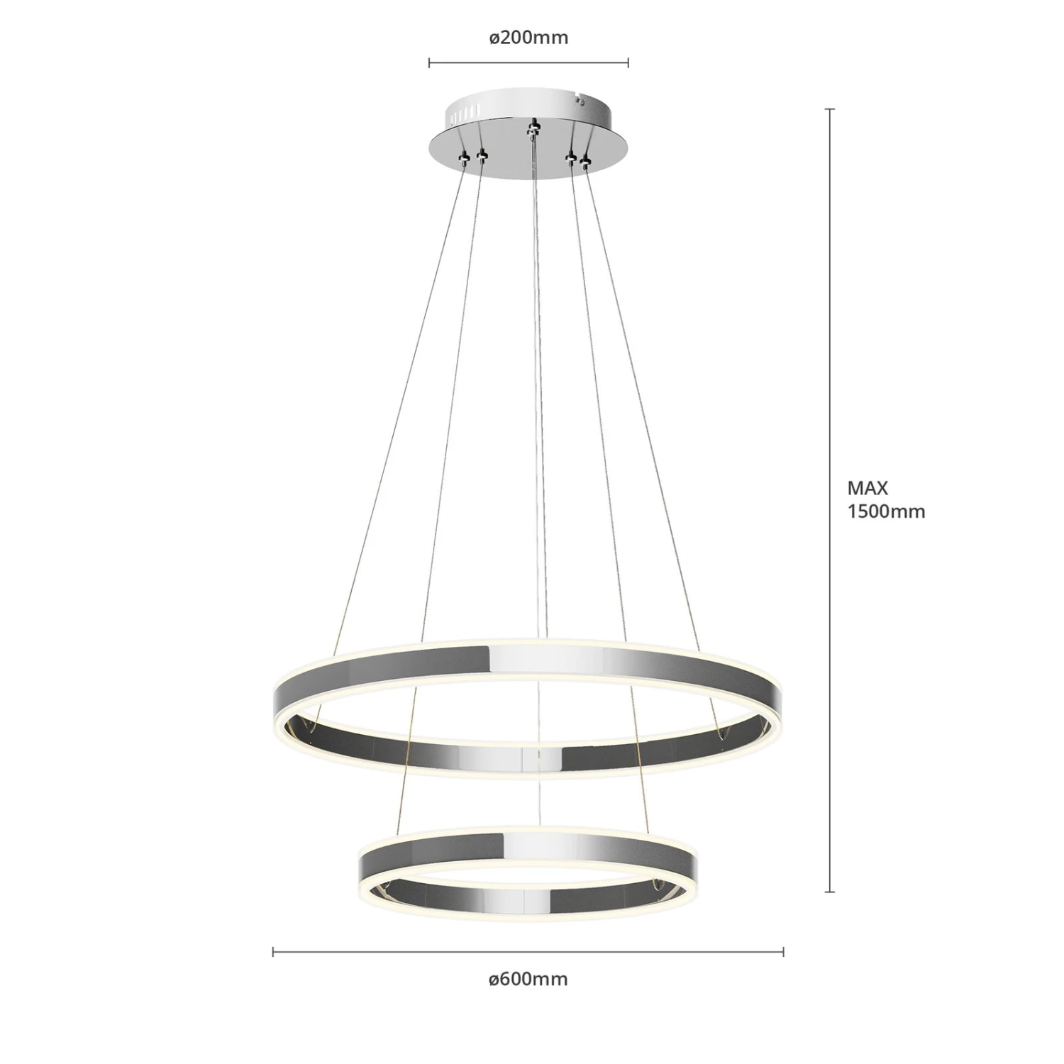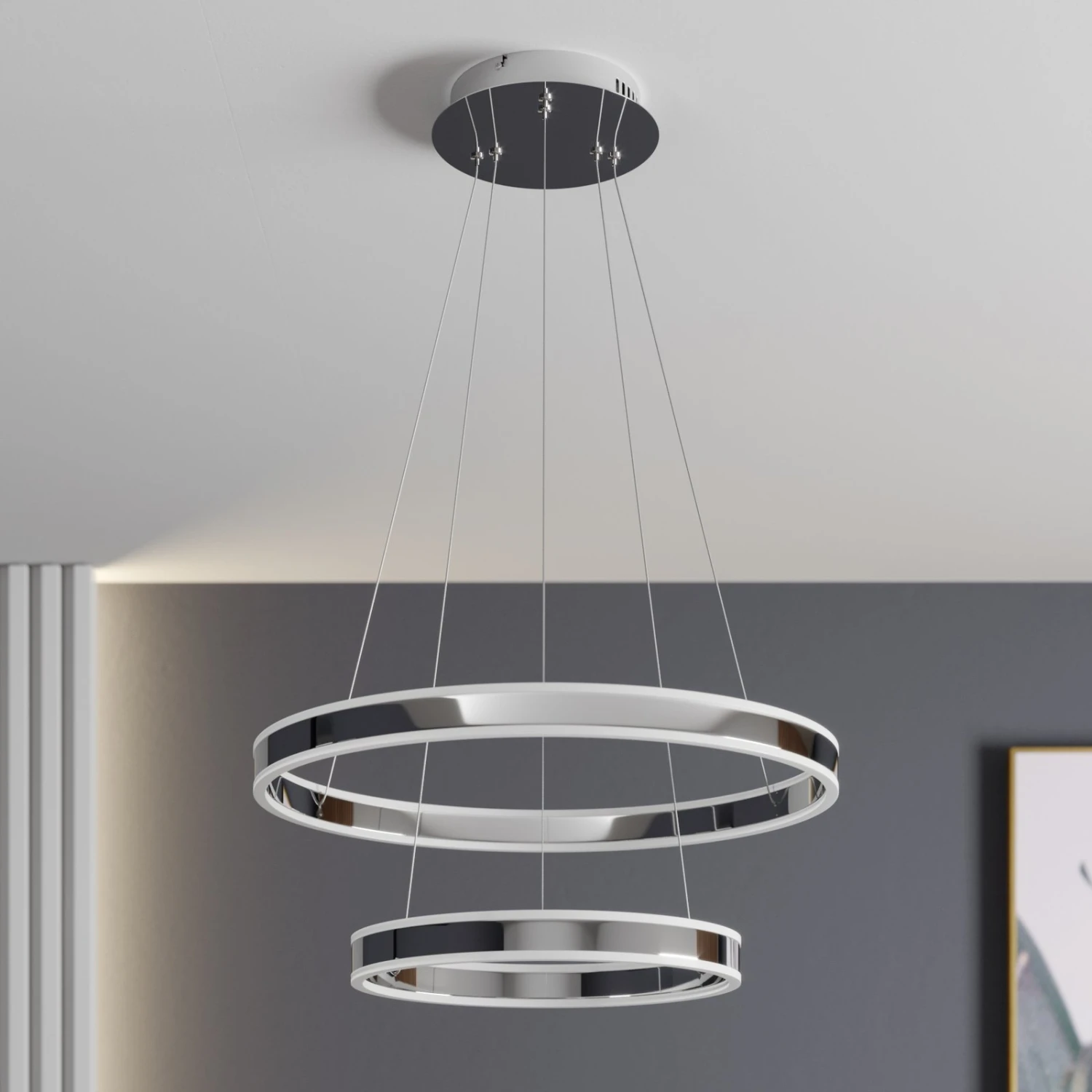 Zweistufig angeordnete LED-Pendelleuchte Lyani mit verchromten Ringen in unterschiedlicher Größe, per Schalter dimmbar