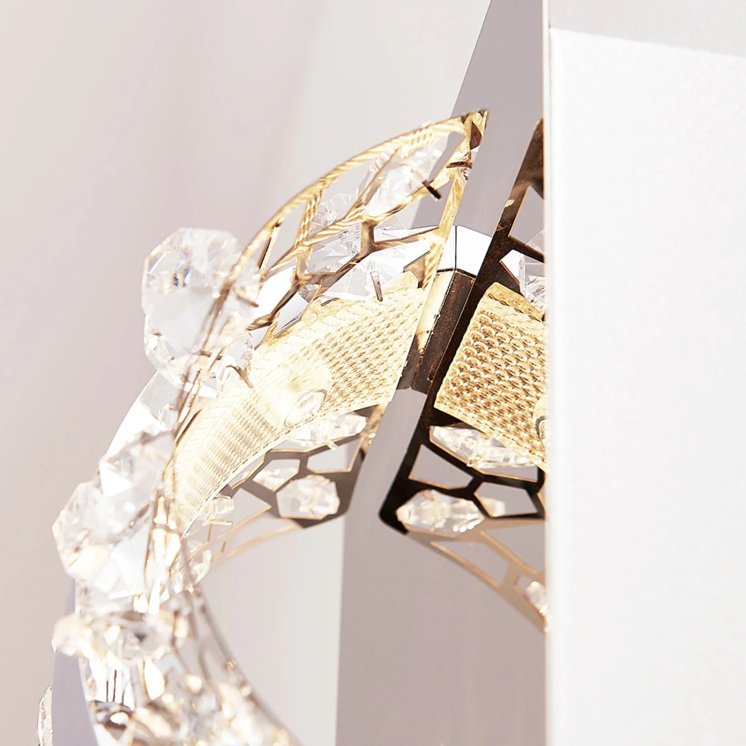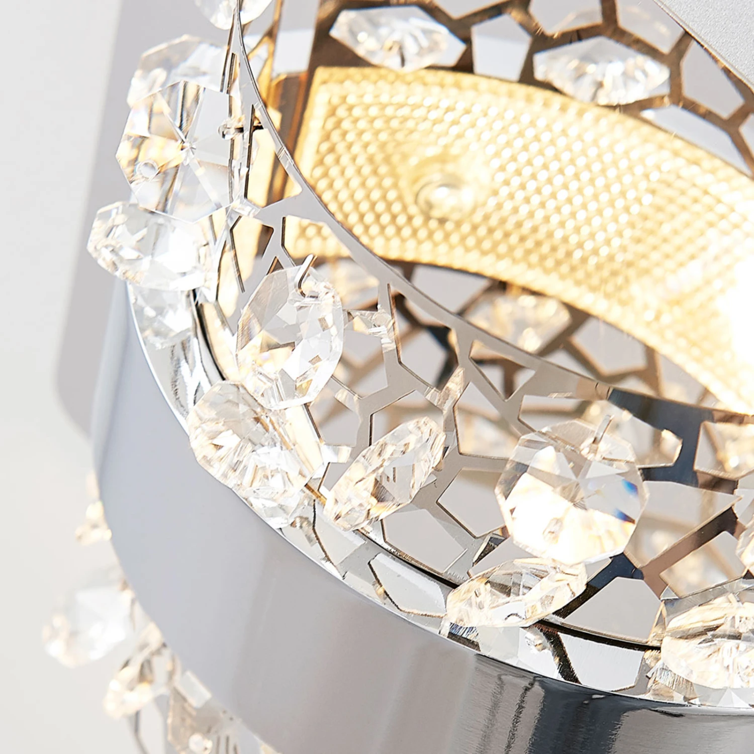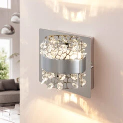 Neelie erscheint modern und glamourös zugleich und ergänzt den Wohnbereich auf sehr schöne Weise. Das Metallgestell der Wandlampe hat eine glänzend verchromte Oberfläche, die für schöne Spiegelungen sorgt, und die geschliffenen Steinchen aus Glas bewirken ein tolles Glitzern, weil der Lichtschein so oft reflektiert wird. Dadurch entsteht eine besondere Eleganz im Wohnraum, die für bewundernde Blicke sorgt und den Raum erhabener wirken lässt.