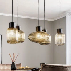 Lomeris überzeugt im wahrsten Sinne des Wortes auf ganzer Linie, denn die Pendellampe ist in länglicher Form gehalten und hat insgesamt fünf rauchgraue Schirme aus Glas, die in drei unterschiedlichen Formen gehalten sind. Alle sind rund, manche jedoch bauchiger und andere eher schmal und höher. Damit ergibt sich ein schönes Gesamterscheinungsbild, das edel wirkt und auch eine besondere Vintage-Note nicht leugnen kann. Jeder Schirm erzeugt mit dem getönten Rauchglas ein sehr gemütliches Lichtbild und die Rillenstruktur verfeinert das Lichtbild zusätzlich und schenkt ihm ein schönes Funkeln.