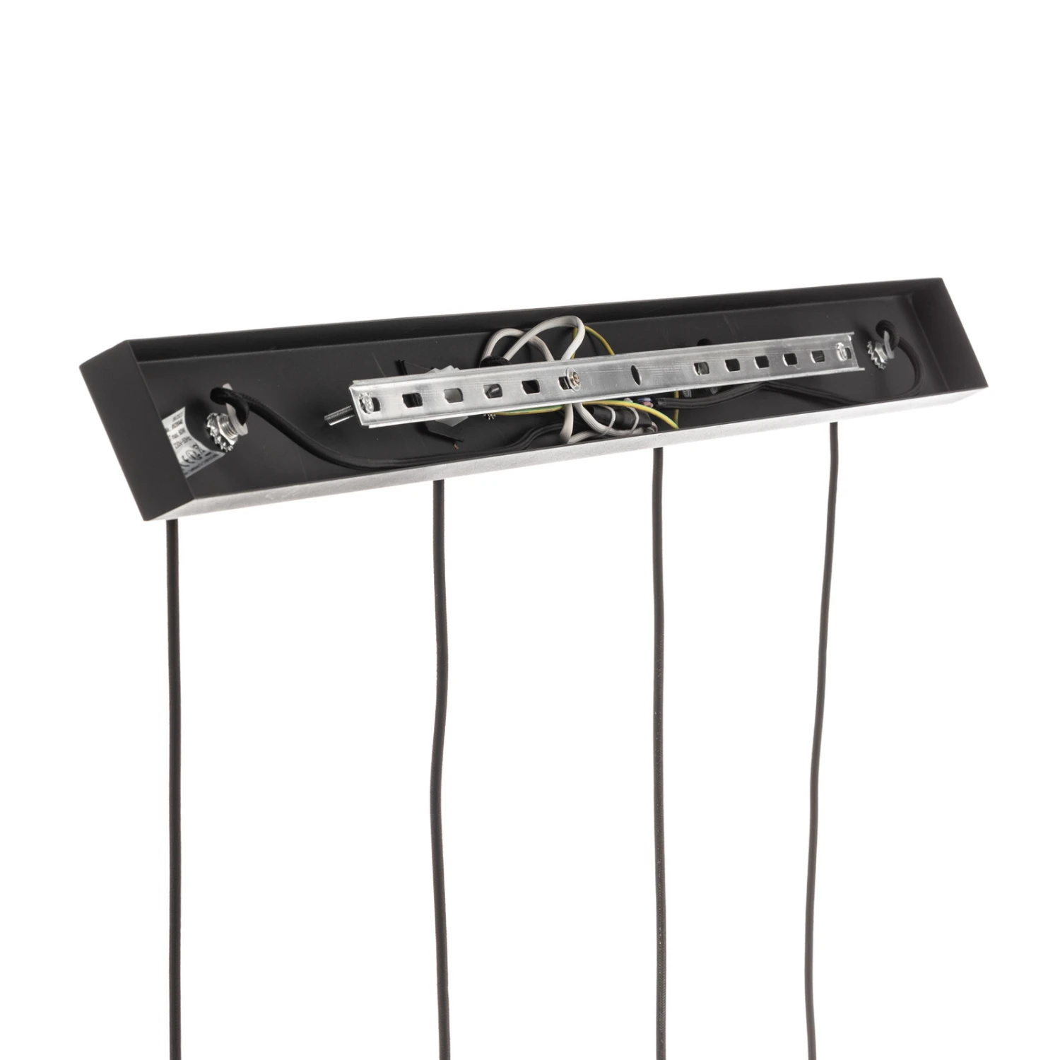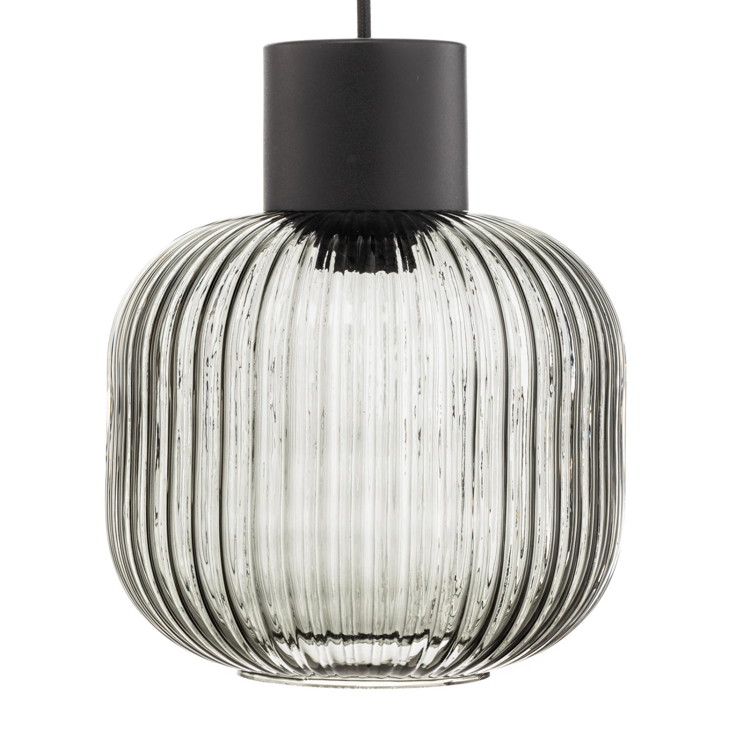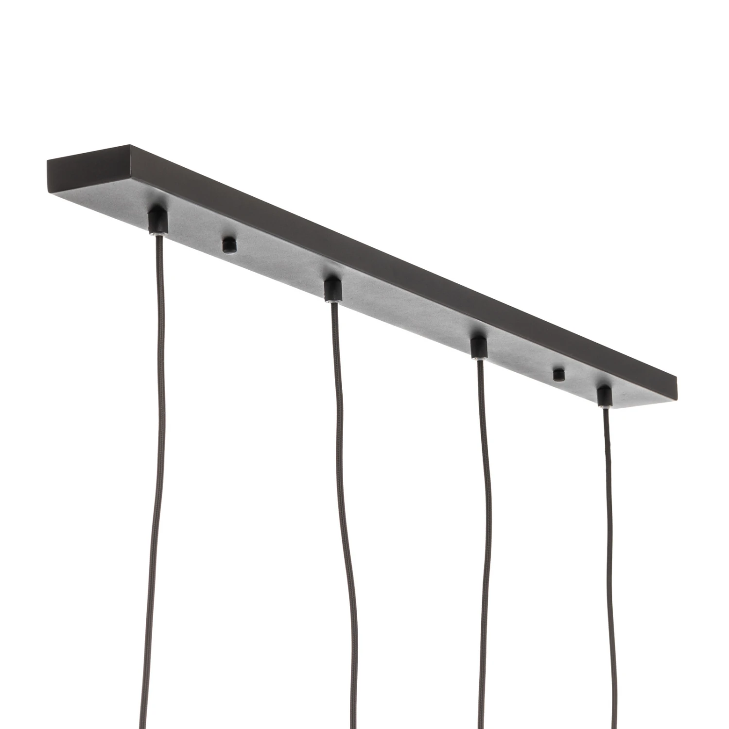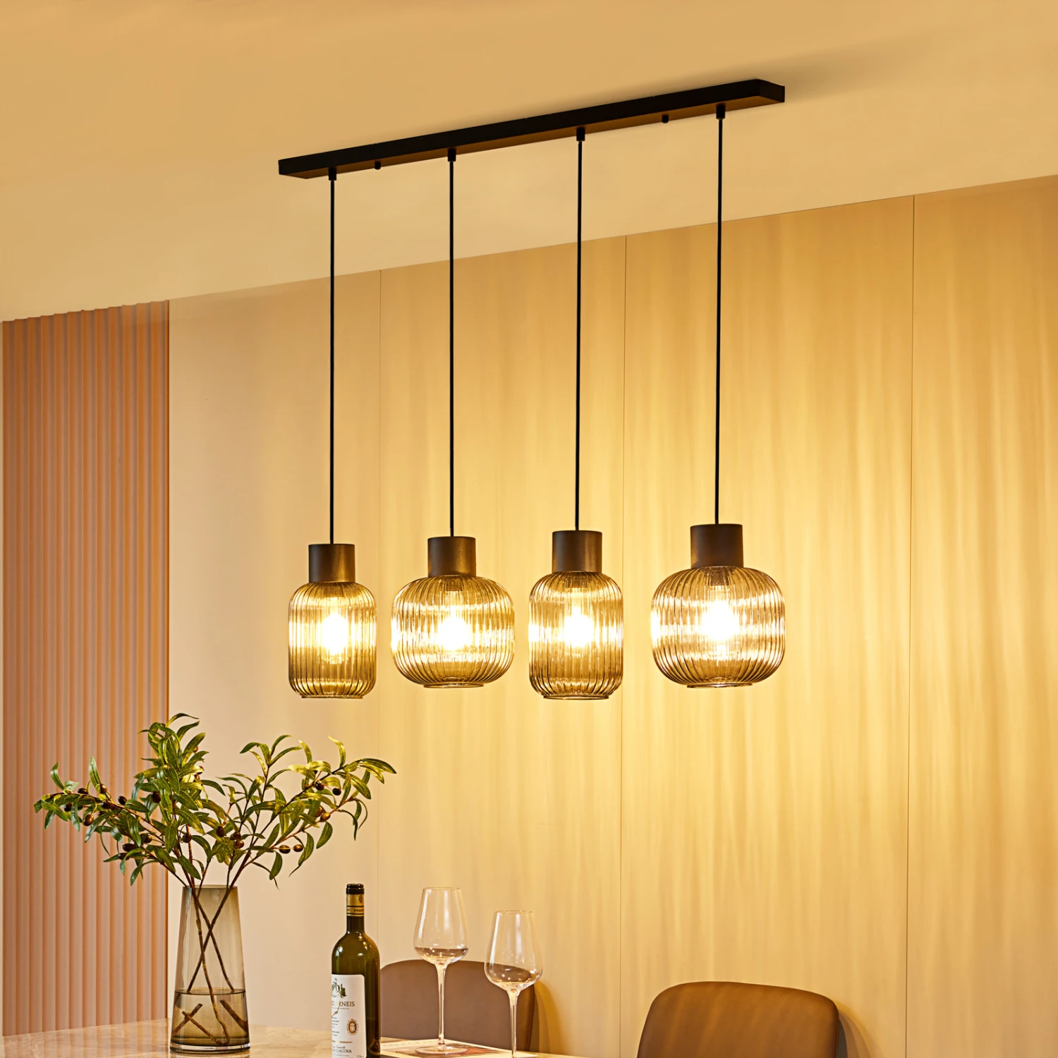 Lomeris ist eine Hängeleuchte, die sich gut über einem Esstisch platzieren lässt mit ihrer länglichen Form und den vier getönten Lampenschirmen aus Glas. Dabei weichen je zwei Schirm in der Form voneinander ab, zwei sind eher bauchig, die zwei anderen schmaler und etwas länger. Allen gleich ist jedoch die rauchgraue Tönung und die Rillenstruktur im Glas, wobei beide nicht nur Einfluss auf die Optik nehmen, sondern auch das Lichtbild ansprechend gestalten, das dann ein gewisses Funkeln bekommt sowie eine warme und gemütliche Ausstrahlung. Da es sich um Klarglas handelt, das zwar getönt ist, aber dennoch durchsichtig, kann man die eingesetzten Lampen noch relativ gut erkennen und sollte darauf achten, dass sie möglichst passend und dekorativ aussehen, wie es auf alle LED-Filamentlampen mit Glaskolben zutrifft, die zudem in der Regel auch noch effizient in Hinsicht auf Verbrauch und Helligkeit sind.