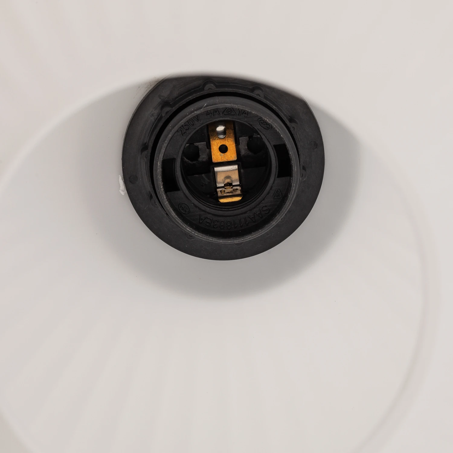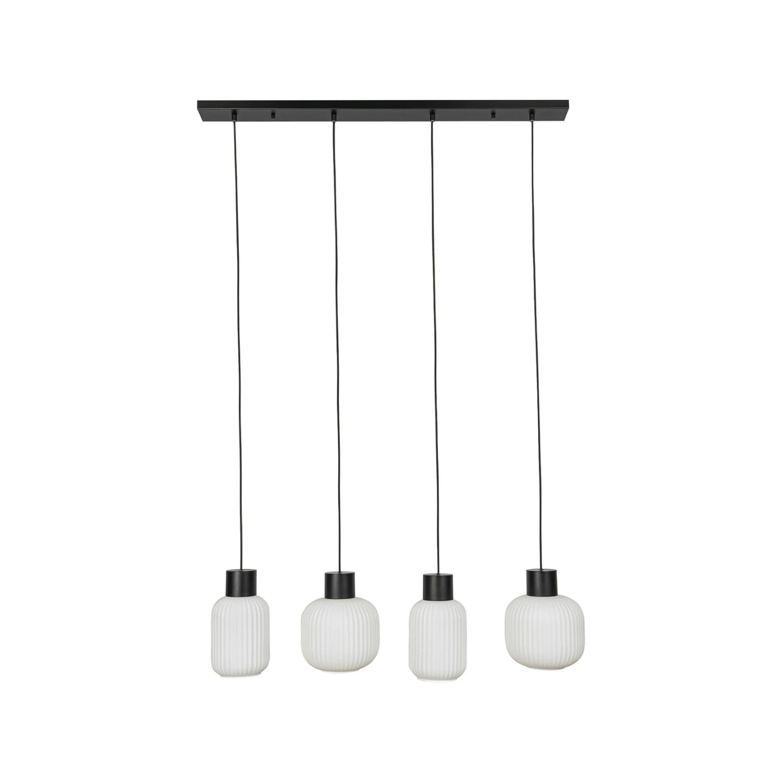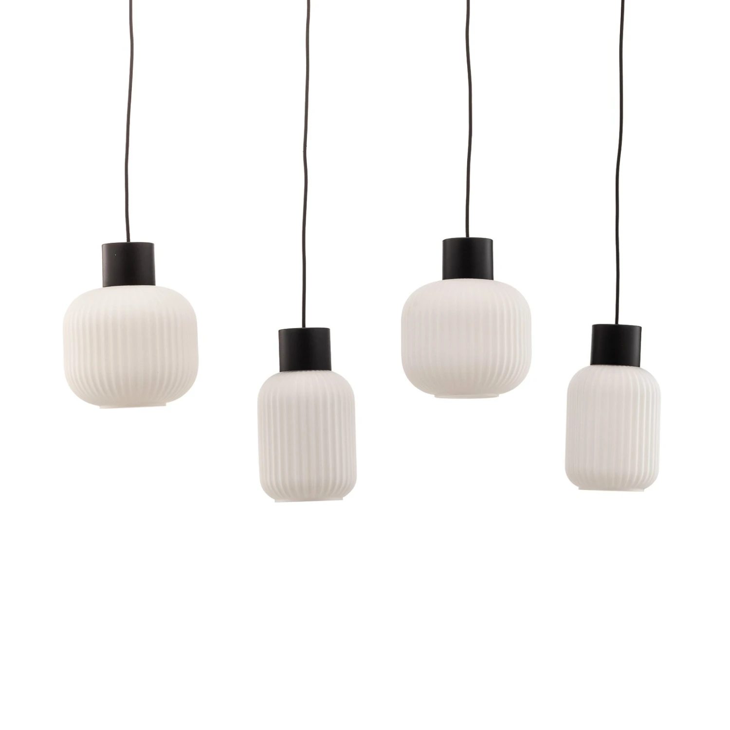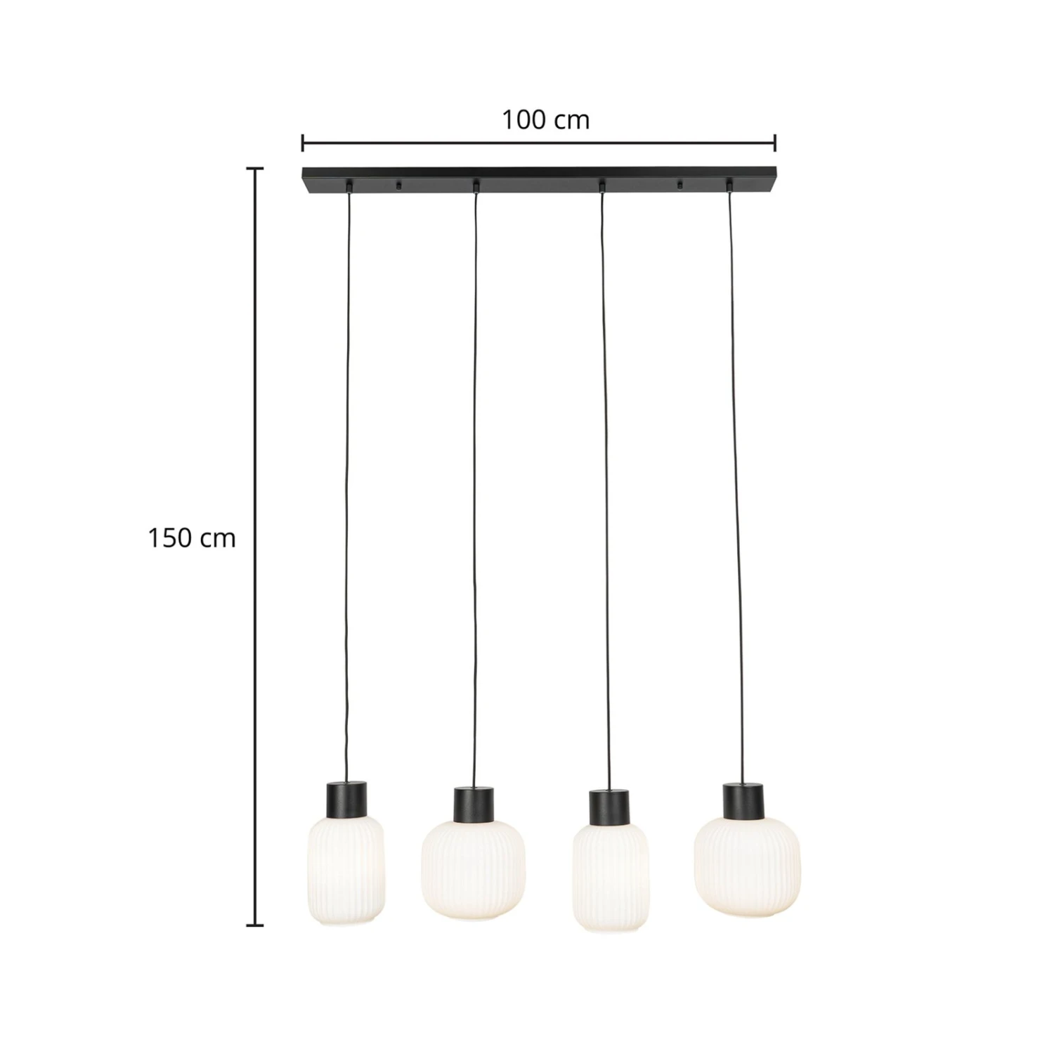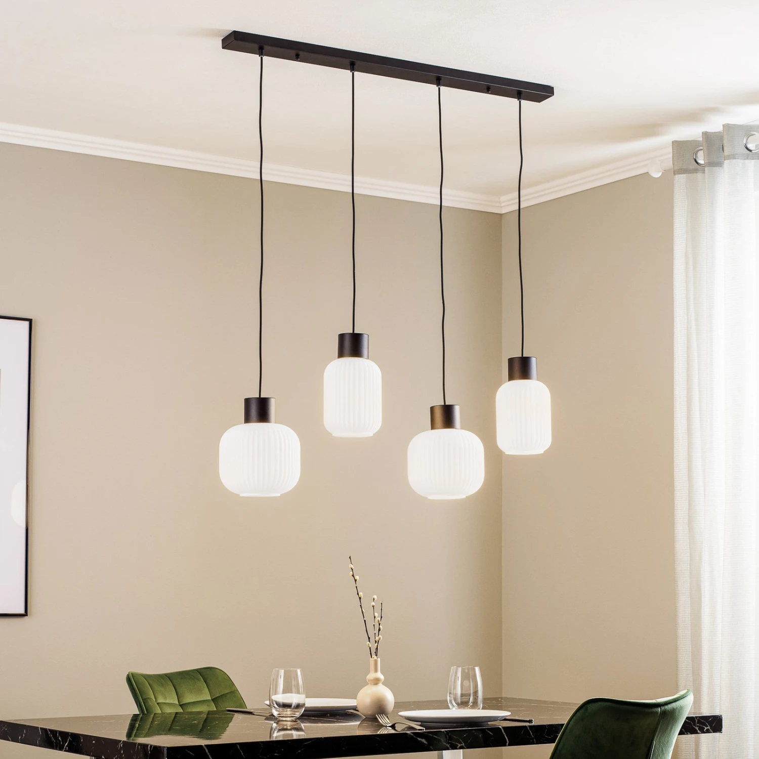 Vierflammige Esszimmer-Pendelleuchte Lomeris mit weißen Opalglasschirmen mit geriffelter Struktur