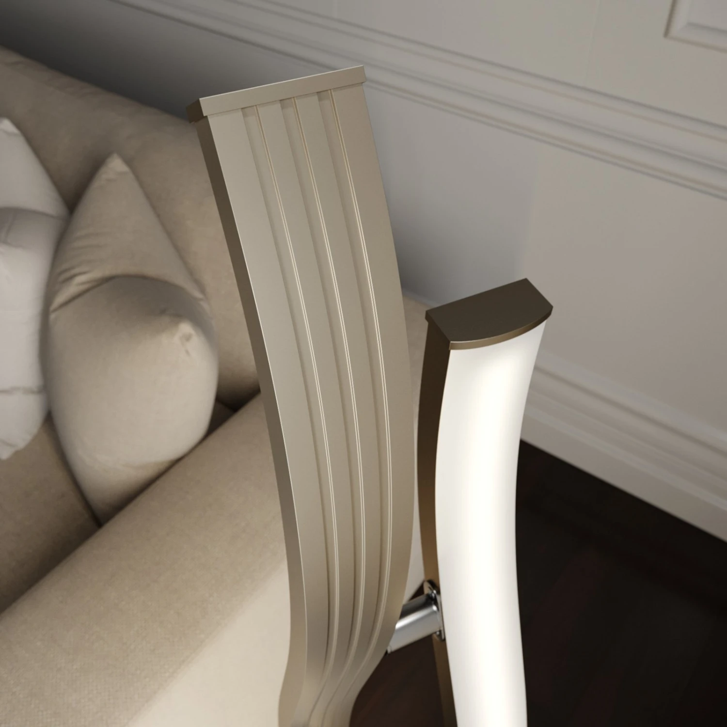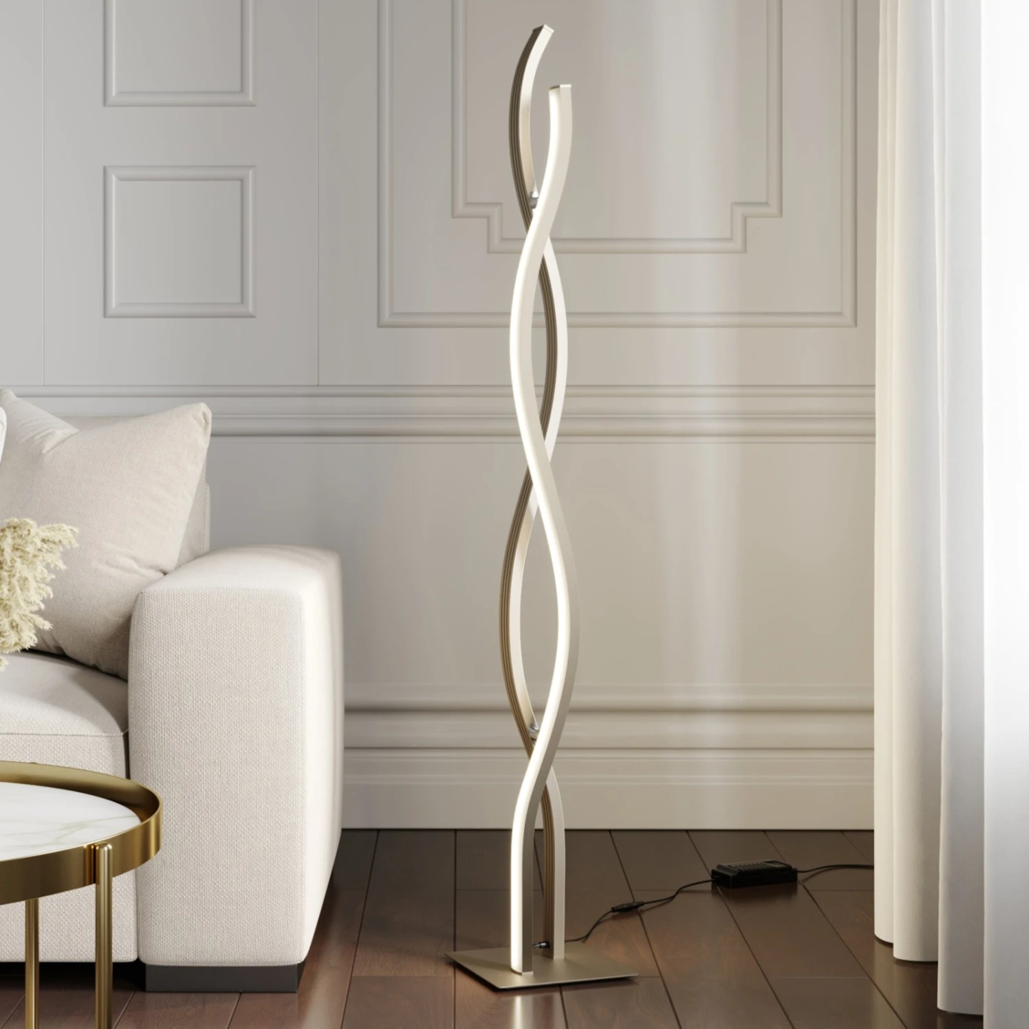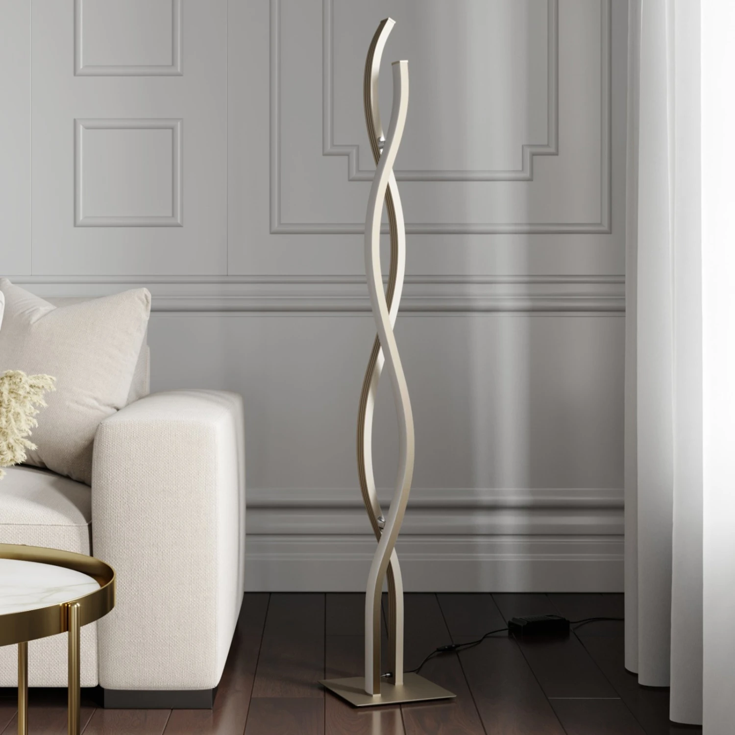 Die LED-Stehleuchte Mairia wirkt dank ihres puristischen Designs besonders edel. Die beiden wellenförmigen Elemente ergänzen sich hervorragend und wirken dank ihrer rundlichen Form sanft und geben ein harmonisches Bild ab. Die Elemente sind mit energiesparenden LEDs ausgestattet, sodass für eine gleichmäßige Beleuchtung des Raumes gesorgt wird. Gleichzeitig wird ein warmweißes Licht abgegeben, welches über einen Schalter in drei Stufen dimmbar ist. Damit eignet sich Mairia hervorragend zur gemütlichen Beleuchtung in einem Wohnzimmer. Besonders gut integriert sie sich in einem modernen Zuhause und eignet sich als schöner Hingucker.