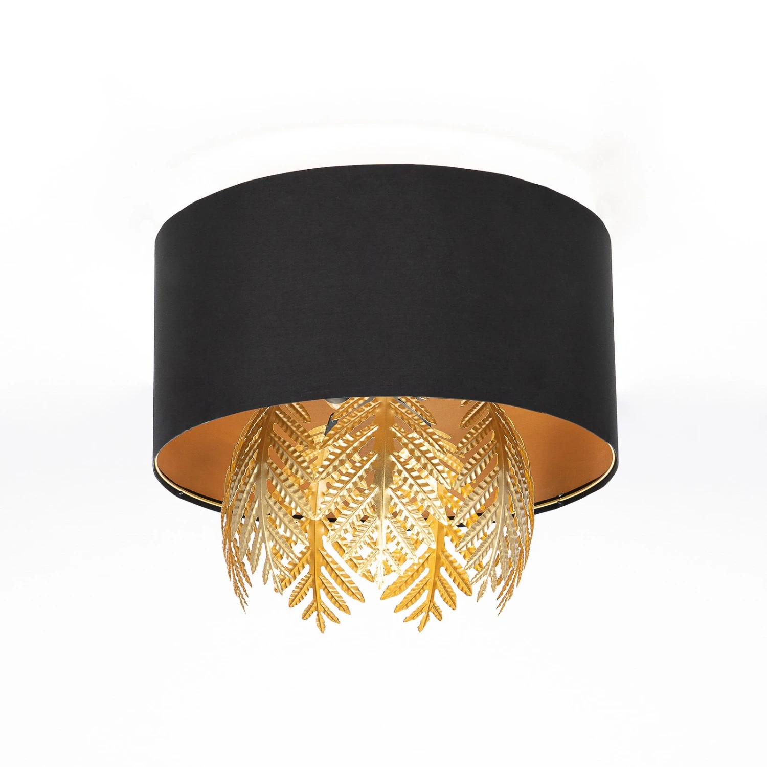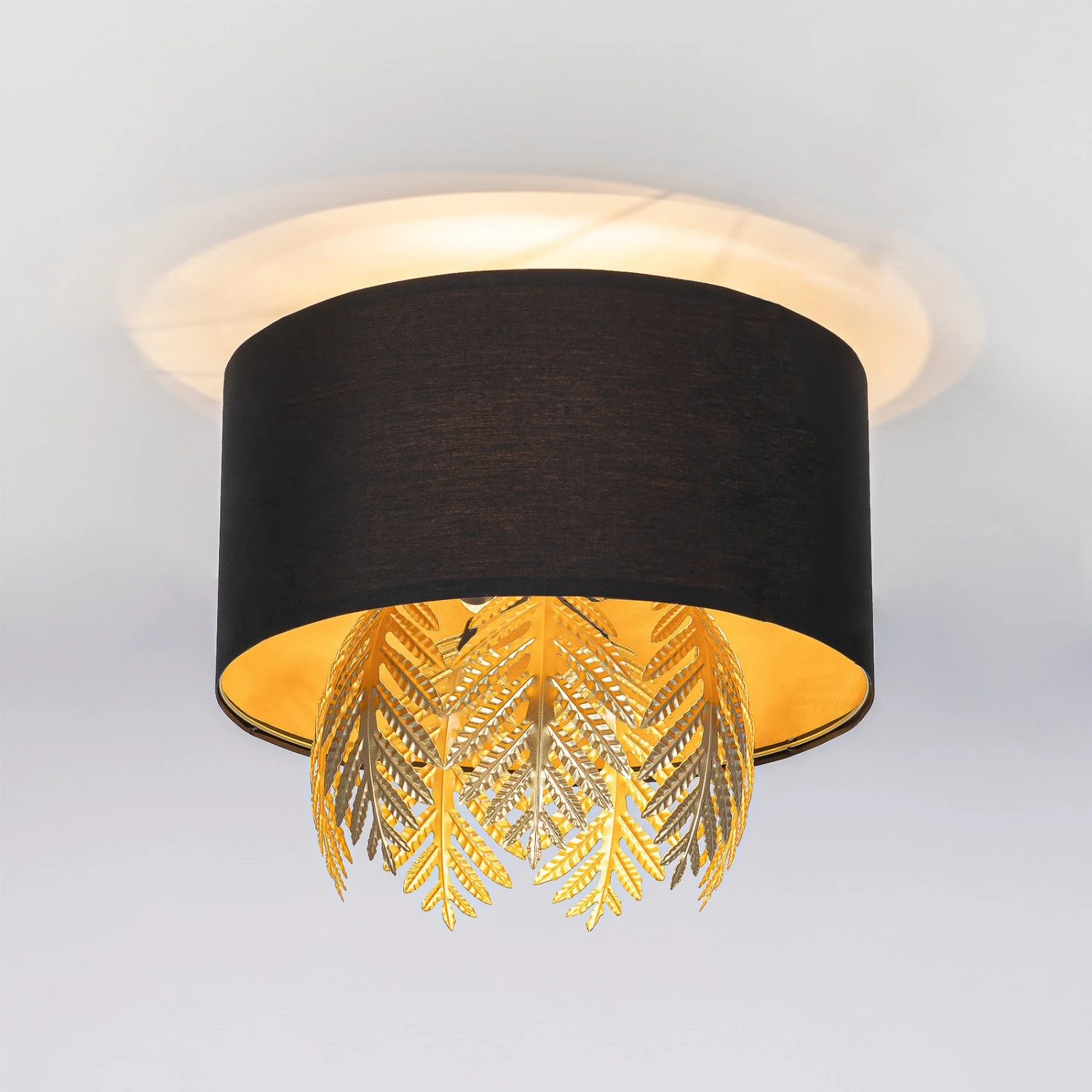 Malviras ist eine schöne Textilleuchte für die Decke, die eine runde Form besitzt. Die Außenseite des zylindrischen Schirms ist in Schwarz gehalten, während er innen golden glänzt und ein ganz warmtöniges Licht erzeugt. Zusätzlich dazu befinden sich an der Unterseite goldene Dekoelemente, die in Farnblattoptik gestaltet sind und das Licht noch mehr abschirmen und ein tolles Licht- und Schattenspiel erzeugen. Außerdem sorgt der Goldton für einen herrlichen und sehenswerten Kontrast, wenn er sich zusammen mit dem kühlen Schwarz des Schirms zeigt. Das einzigartige Design setzt im Wohn- und Schlafraum wirklich schöne Akzente und überzeugt mit einer tollen Lichtwirkung!