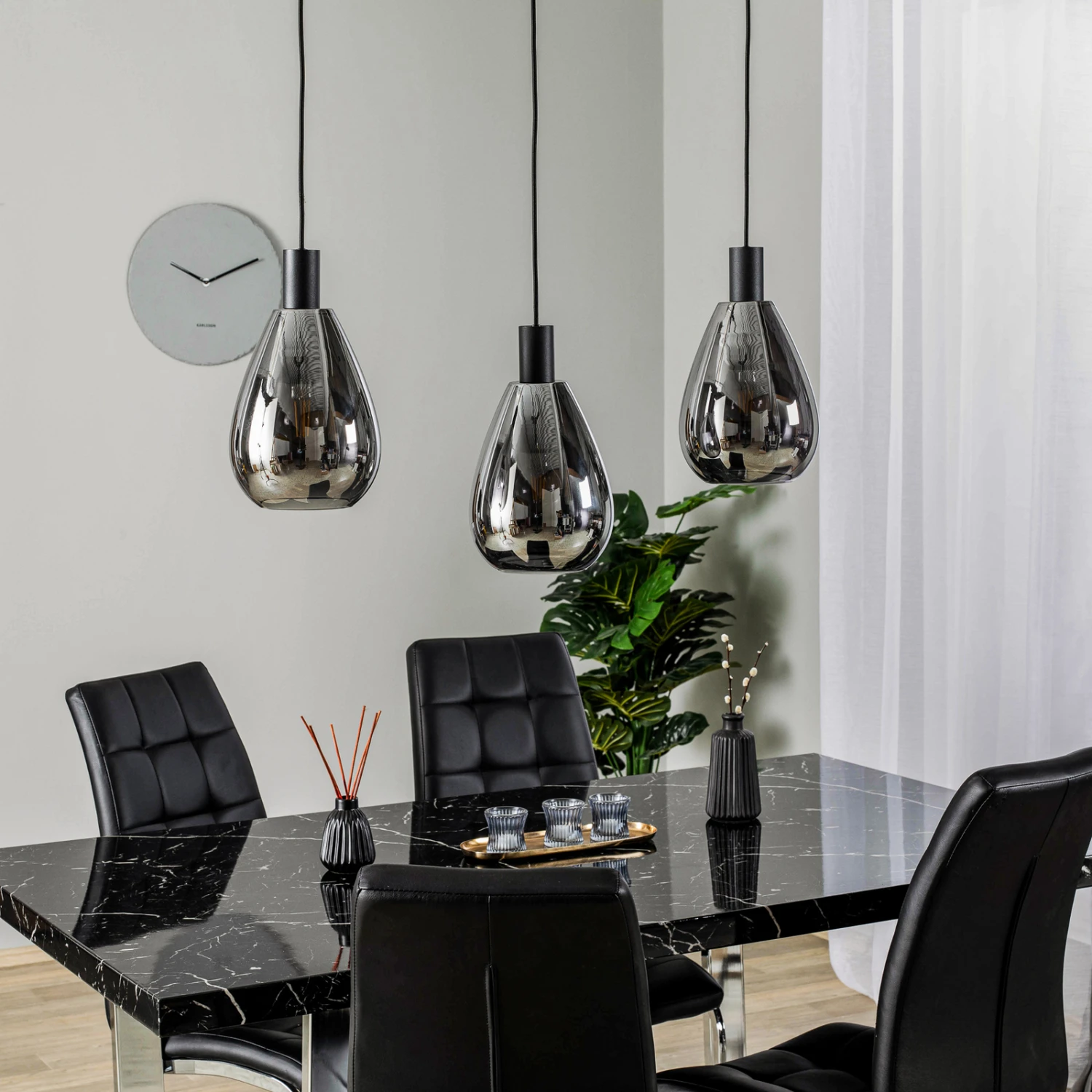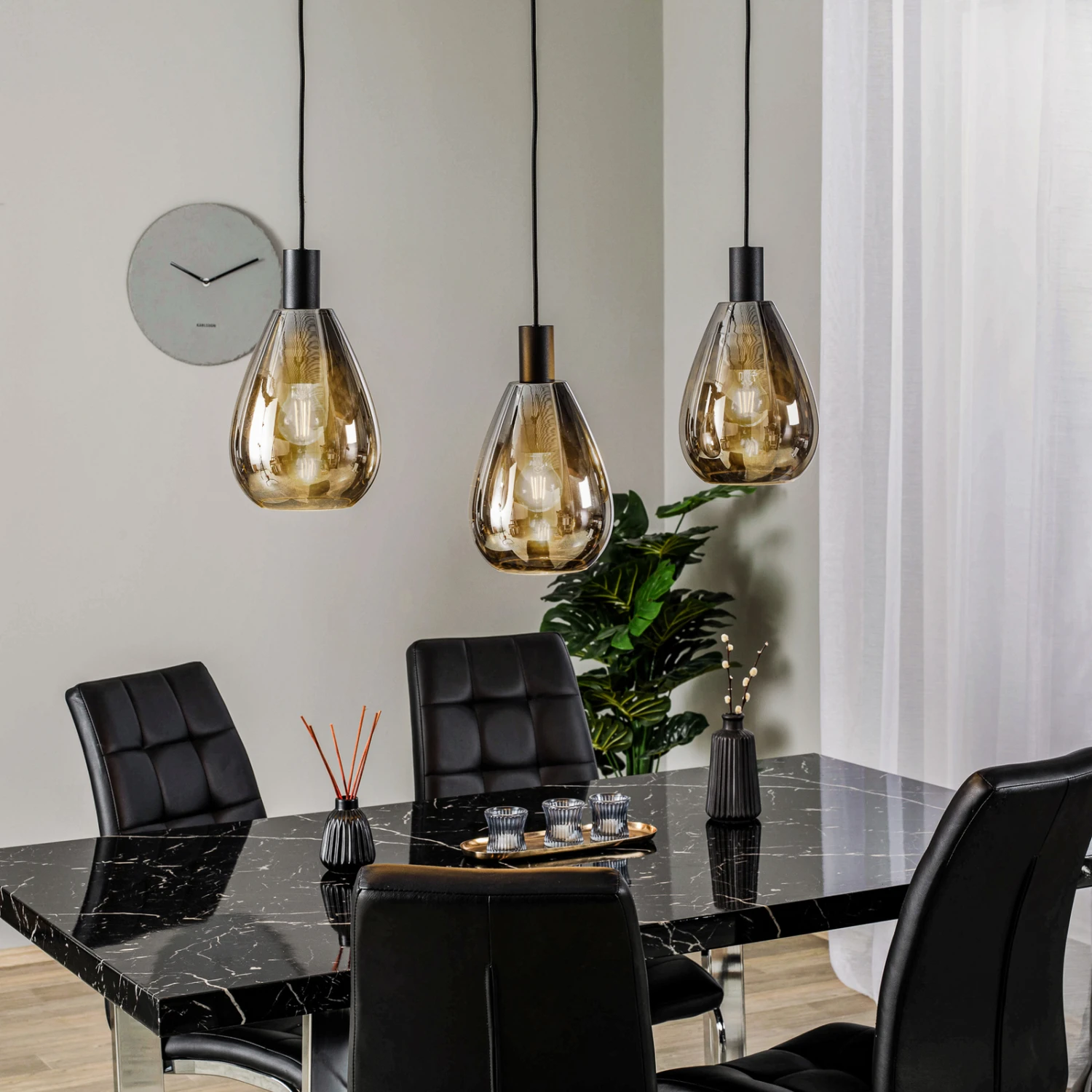 Marvelos ist ein entzückender Lichtspender für den Esstisch, denn die Pendellampe verfügt über drei Lampenschirme aus Glas, die eine elegante rauchgraue Tönung besitzen, sonst aber klar sind. Nicht nur die Optik wirkt dadurch edel, auch das Lichtbild wird verfeinert und erscheint besonders behaglich. Mit den bauchigen Lampenschirmen ist eine organische Form gewählt worden und die dunkle Farbgebung in Rauchgrau und Schwarz steht für maximale Eleganz. Über einem Tisch sorgt Marvelos gleichzeitig für angemessene Helligkeit und eine dekorative und gemütliche Wirkung. Da die Lampen stets noch gut sichtbar sind, sollten die Leuchtmittel eher dekorativ gehalten sein, damit die Gesamtoptik stimmig und stilvoll erscheint.