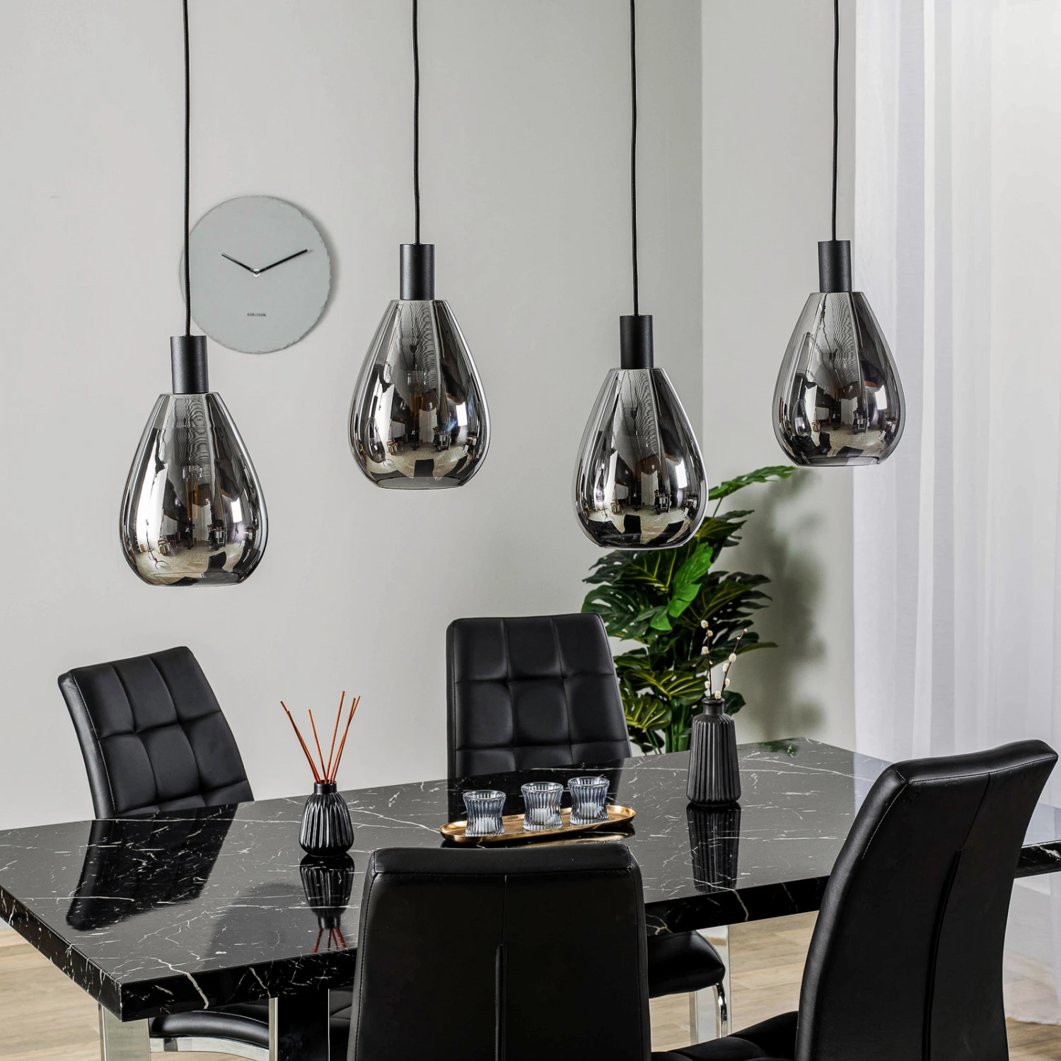 Marvelos ist eine Pendelleuchte, die mit einem sehr schönen Look und einer ebenso schönen Lichtwirkung punktet. Die vier Schirme aus Glas sind in einer Reihe angeordnet und hängen an textilummantelten Kabeln in Schwarz von der Deckenhalterung herab. Mit ihrer rauchgrauen Tönung erzeugen sie ein sehr wohnliches Licht, das in vielen modernen Wohnumgebungen und solchen, die ein bisschen mehr auf Vintage setzen, sehr willkommen ist. Die Schirme sind rund und bauchig und in einem edlen Grauton gehalten, während der Rest des Gestells schwarz ist. Gerade in eingeschaltetem Zustand sind die Leuchtmittel durch das getönte Glas noch gut sichtbar, so dass die Wahl der passenden Lampen auch nach optischen Gesichtpunkten vorgenommen werden sollte.