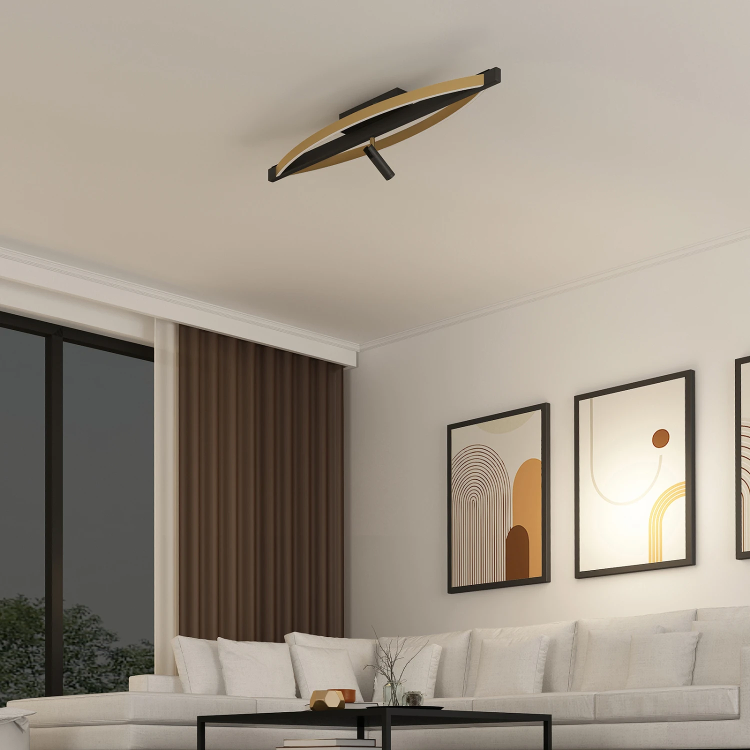 Dreistufig dimmbare LED-Deckenleuchte Matwei mit seitlichen Bögen in Messing und zusätzlichem Spot in Schwarz