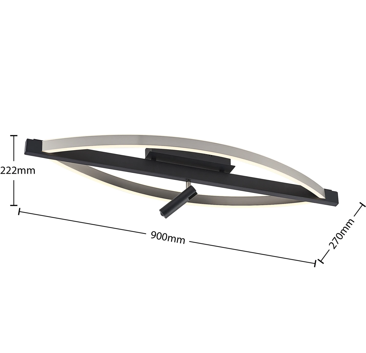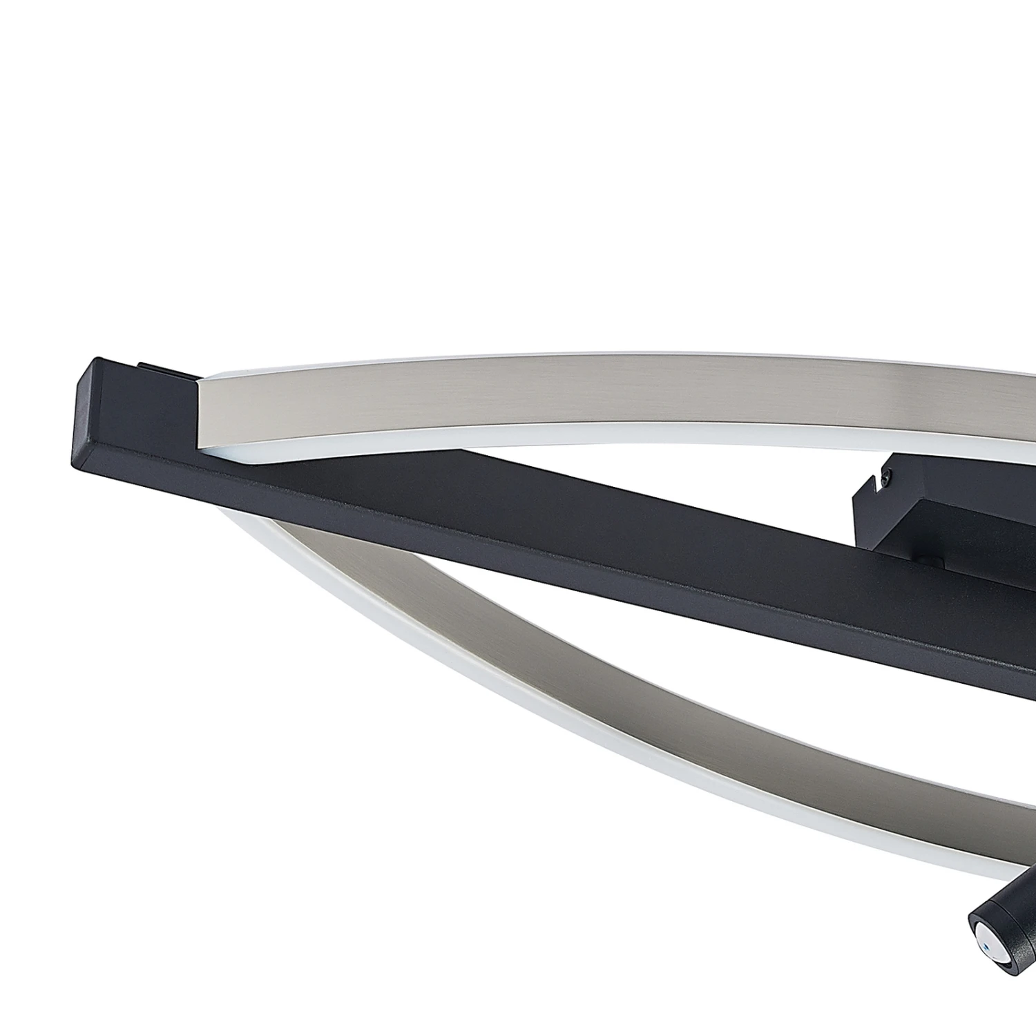 Mittig auf dem Baldachin ist eine schwarze Metallstange platziert, an der zwei elegant gebogene Flanken gespannt sind. Diese sind innen mit LEDs ausgestattet, während außen die Oberfläche in Nickel fein verarbeitet wurde. Die LEDs spenden ein warmweißes, angenehmes Umgebungslicht, das gleichmäßig im Raum verteilt wird.