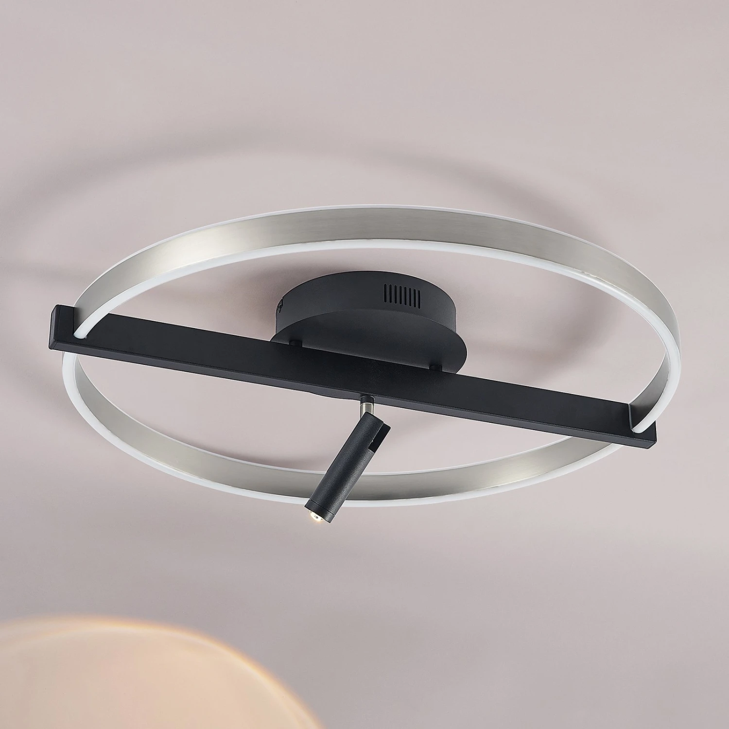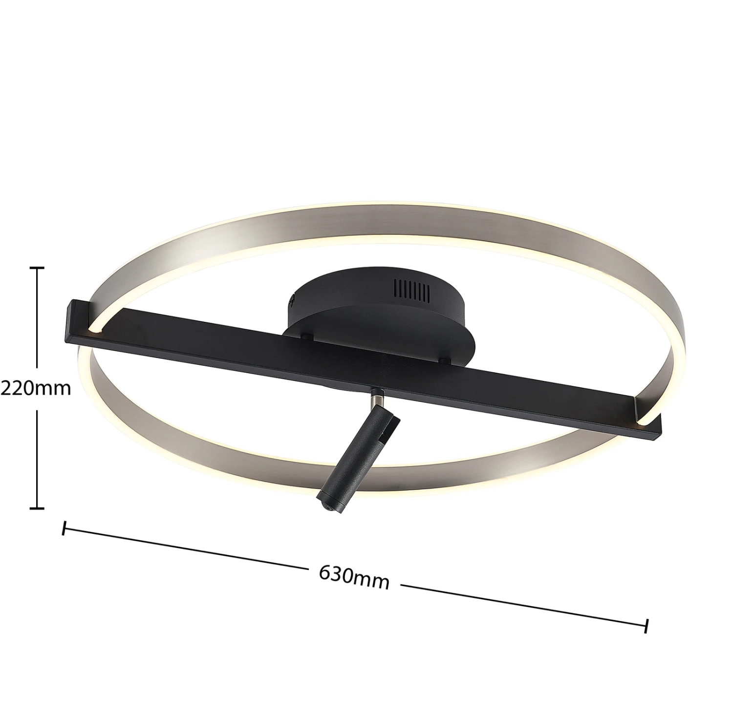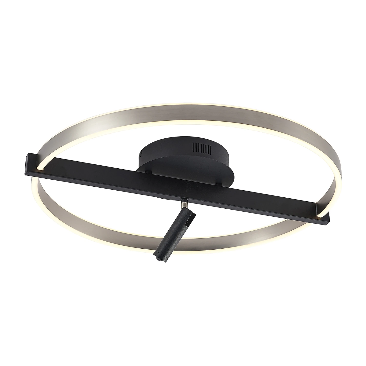 Die leuchtstarke LED-Deckenlampe Matwei überzeugt auf ganzer Linie mit ihrem außergewöhnlichen Design und der durchdachten Funktionalität. Das robuste Eisengestell besteht aus einer runden Montageplatte, auf der eine Stange befestigt ist. Statt eines Leuchtenschirms wurde hier das Design auf ein Minimum reduziert und stattdessen ein moderner Leuchtring verbaut, der auf der Stange aufgespannt zu sein scheint. Das Nickel-Finish des Ringes wird in einem harmonischen Zusammenspiel vom klassischen Schwarz des Gestells ergänzt. Dies erzeugt eine elegante Wirkung und verleiht der Leuchte eine luxuriöse Note.