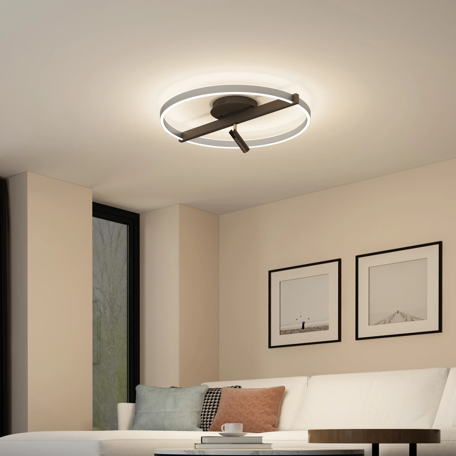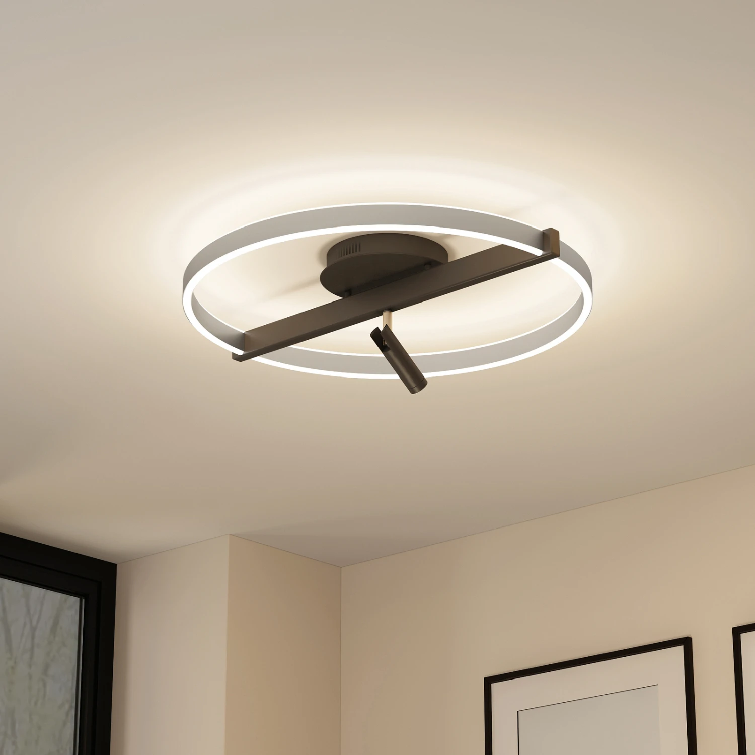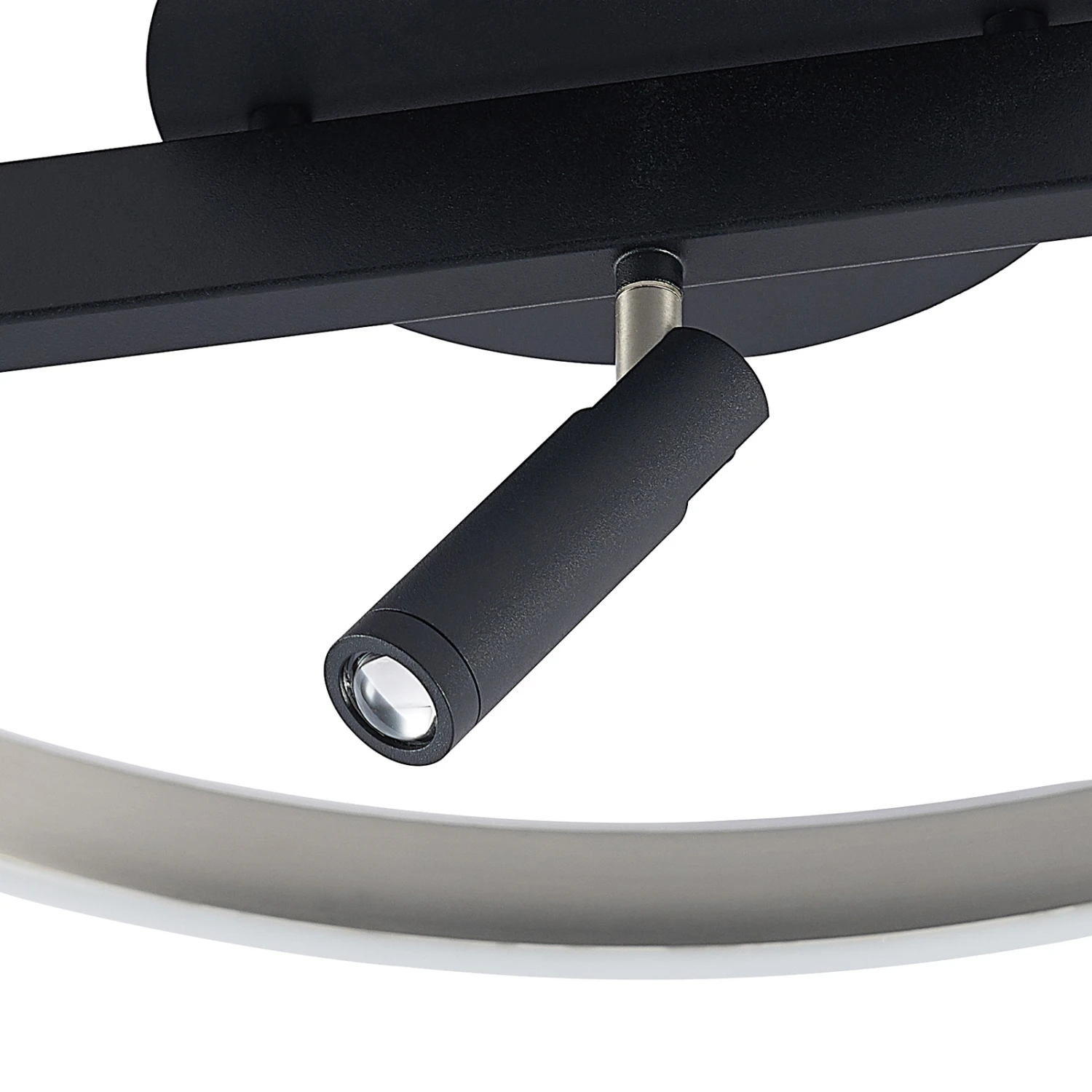 Die leuchtstarke LED-Deckenlampe Matwei überzeugt auf ganzer Linie mit ihrem außergewöhnlichen Design und der durchdachten Funktionalität. Das robuste Eisengestell besteht aus einer runden Montageplatte, auf der eine Stange befestigt ist. Statt eines Leuchtenschirms wurde hier das Design auf ein Minimum reduziert und stattdessen ein moderner Leuchtring verbaut, der auf der Stange aufgespannt zu sein scheint. Das Nickel-Finish des Ringes wird in einem harmonischen Zusammenspiel vom klassischen Schwarz des Gestells ergänzt. Dies erzeugt eine elegante Wirkung und verleiht der Leuchte eine luxuriöse Note.