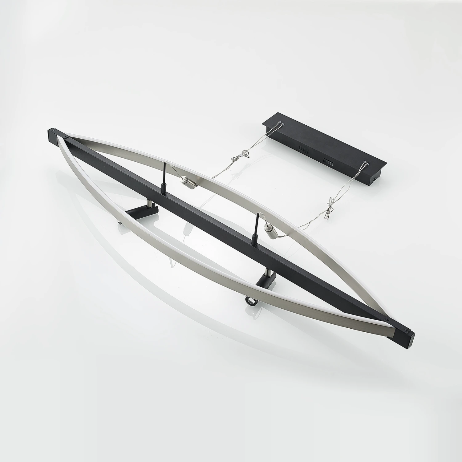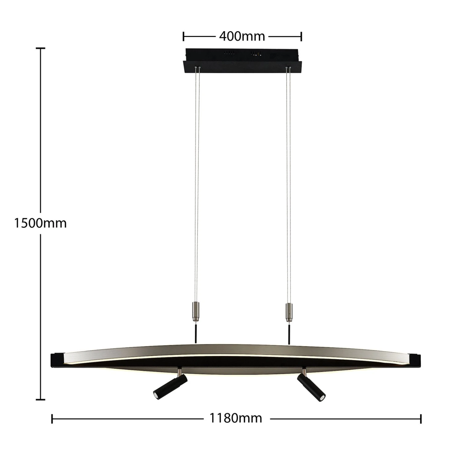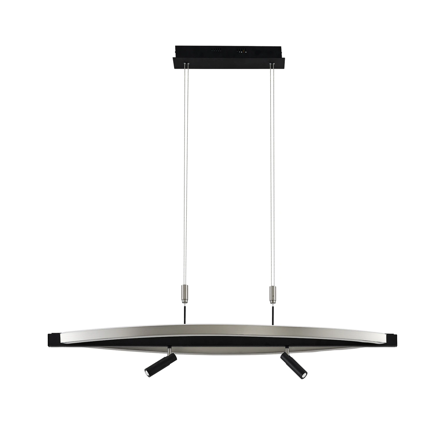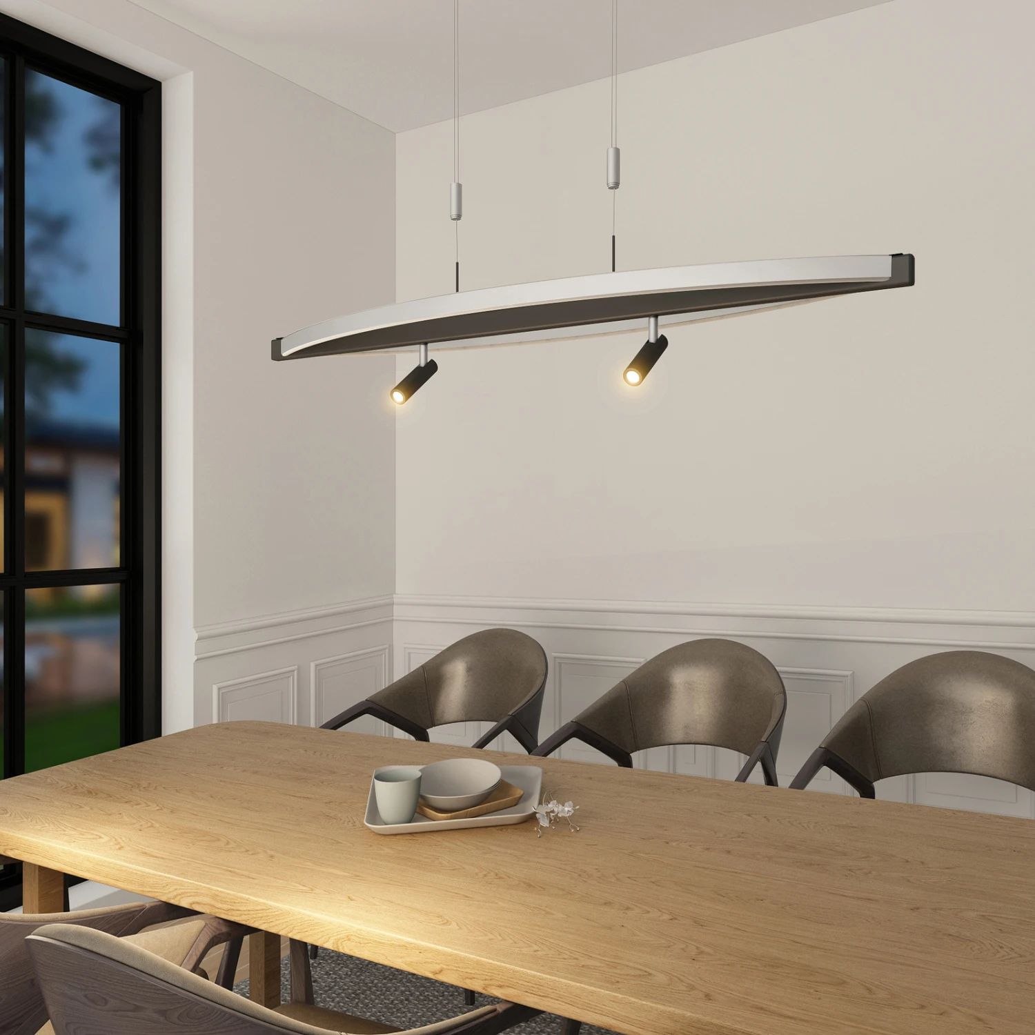 Die Bauform der Leuchte setzt sich zusammen aus einem schwarzen Balken sowie zwei seitlich aufgespannten Flanken in gebogener Form. Diese sind mit einem modernen Nickel-Finish veredelt, was der Leuchte eine luxuriöse Note verleiht. Die beiden Flanken sind mit zahlreichen LEDs versehen, die ein angenehmes, warmweißes Umgebungslicht spenden und es gleichmäßig im Raum verteilen. Dank ihrer guten Leuchtkraft ist Matwei wunderbar für den Einsatz über einem Esszimmertisch geeignet. Alternativ lässt sich die Helligkeit im Handumdrehen an die eigenen Bedürfnisse anpassen, dank der integrierten Switch-Dim-Funktion. Diese erlaubt es, die Leuchte über den gängigen Wandschalter in drei Stufen zu dimmen.