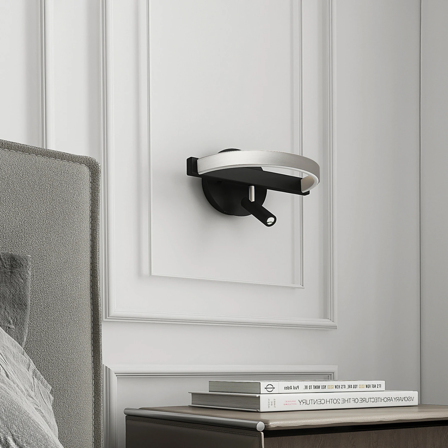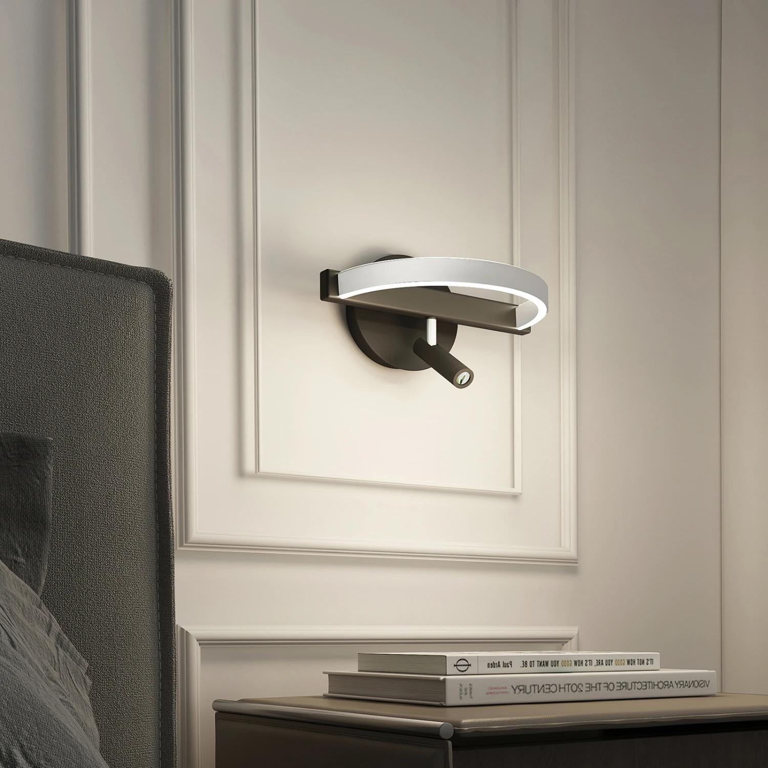 Das ansprechende Design wird zudem komplementiert von durchdachter Funktionalität, denn die Leuchte besitzt außer der Hauptleuchtquelle noch einen zusätzlichen Strahler, der sich drehen und schwenken lässt. Der kleine, schwarze Spot kann nicht nur als Akzentlicht, sondern auch als Leselicht fungieren.