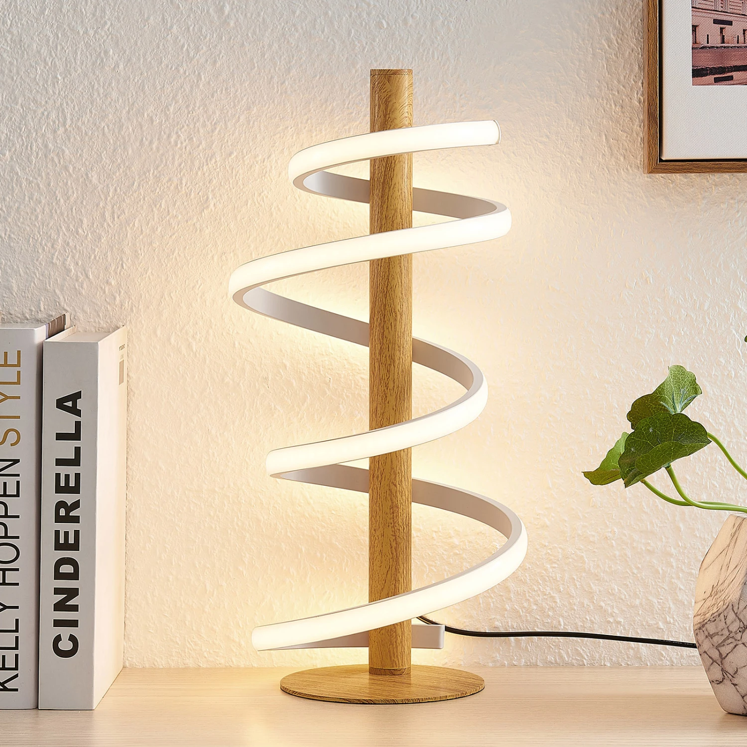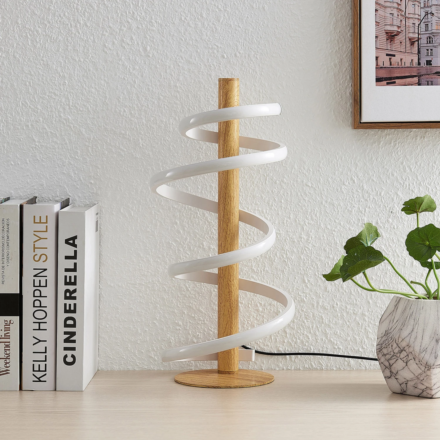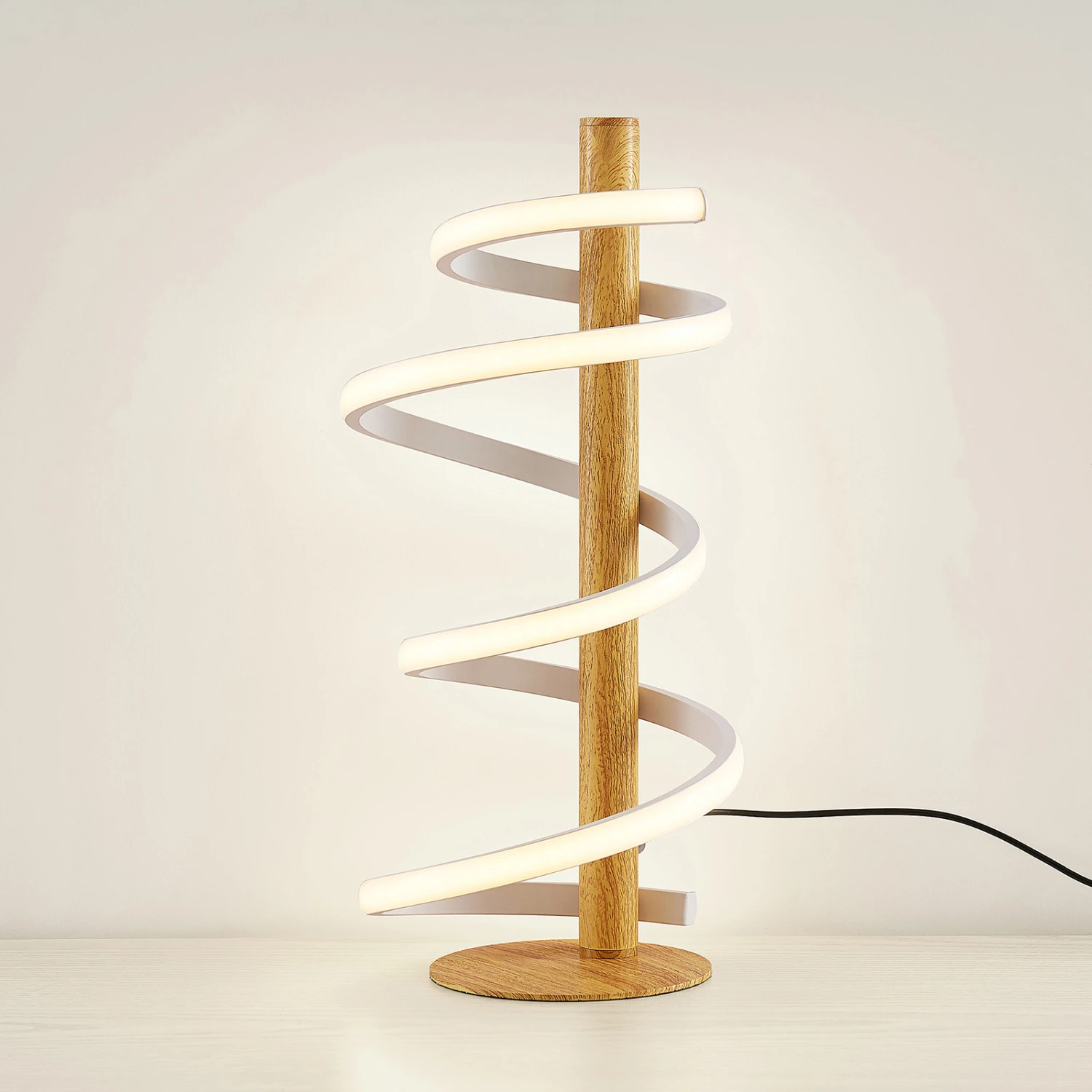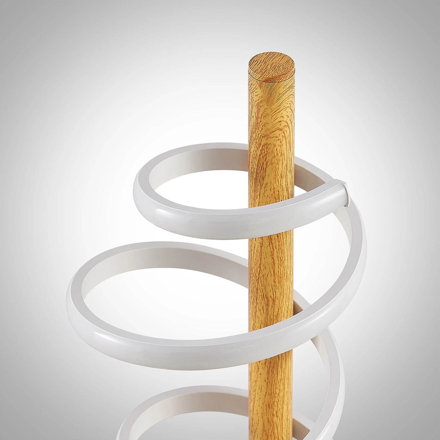 Eine Tischleuchte der besonderen Art – das ist Milora, die aus Metall gefertigt und in der Optik von hellem Eichenholz gestaltet wurde. Vom runden Fuß ragt die Leuchte in Form eines schmalen Armes nach oben, als Lichtquelle wurden warmweiße LEDs in einem Aluminiumprofil verbaut, die durch die Abdeckung aus Silikon gleichmäßiges Licht abgeben, und zwar durch die spiralförmige Anordnung des Profils, das sich um das Gestänge schlängelt, in alle Richtungen.