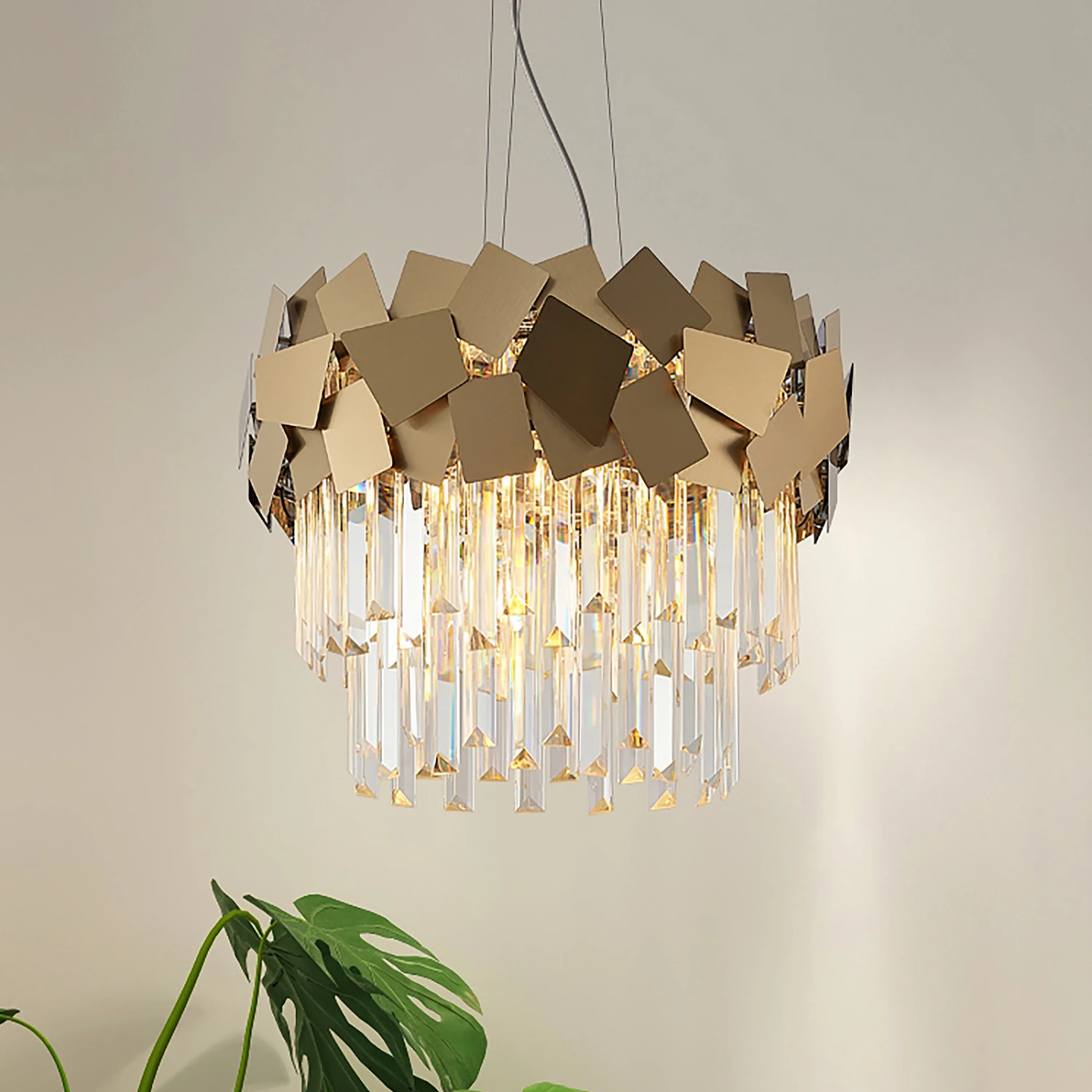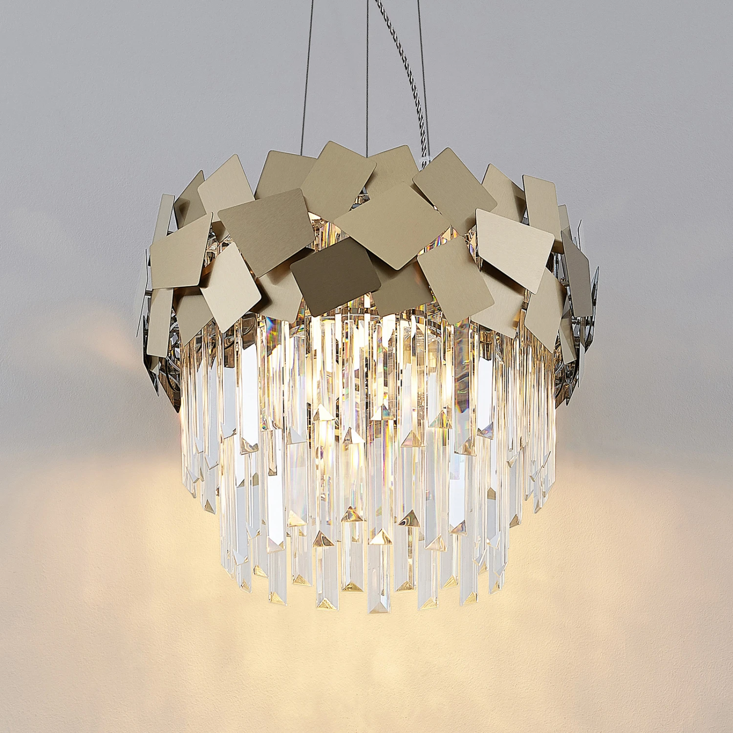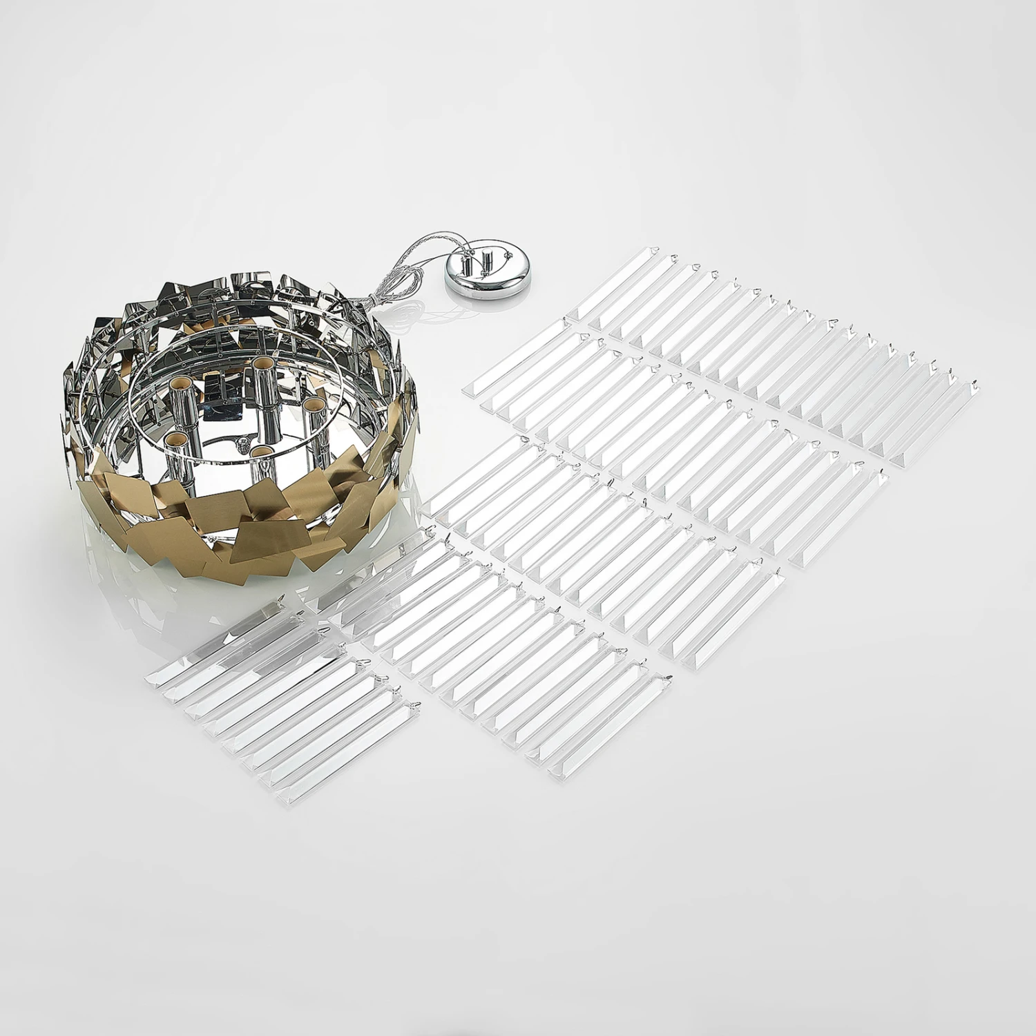 Diese Hängeleuchte präsentiert sich in einem besonderen Design, das dem Raum einen exklusiven Charakter verleiht. Die Basis des Leuchtenschirms wurde mit vielen Edelstahlplatten verarbeitet, die einen goldenen Oberflächenfinish bekommen haben. In der Mitte befinden sich insgesamt drei Ebenen, auf denen zahlreiche Elemente aus Kristall angebracht sind.