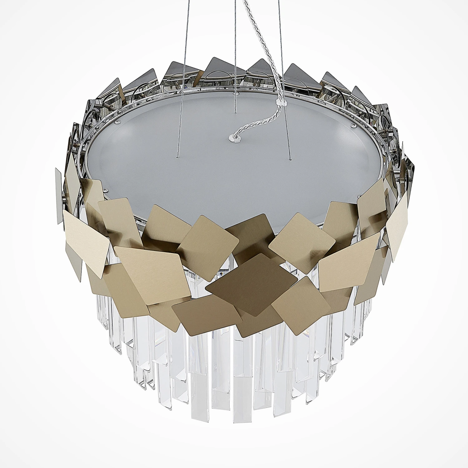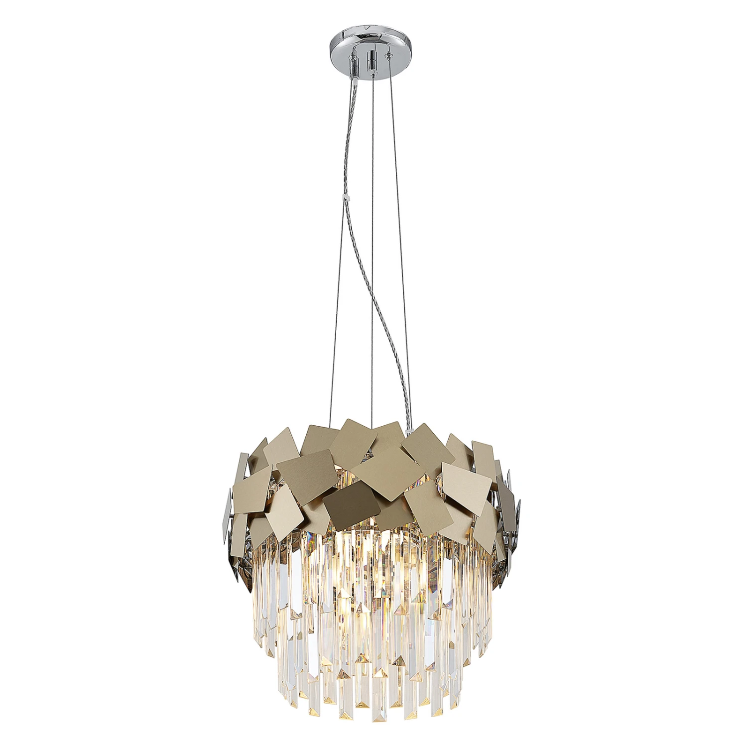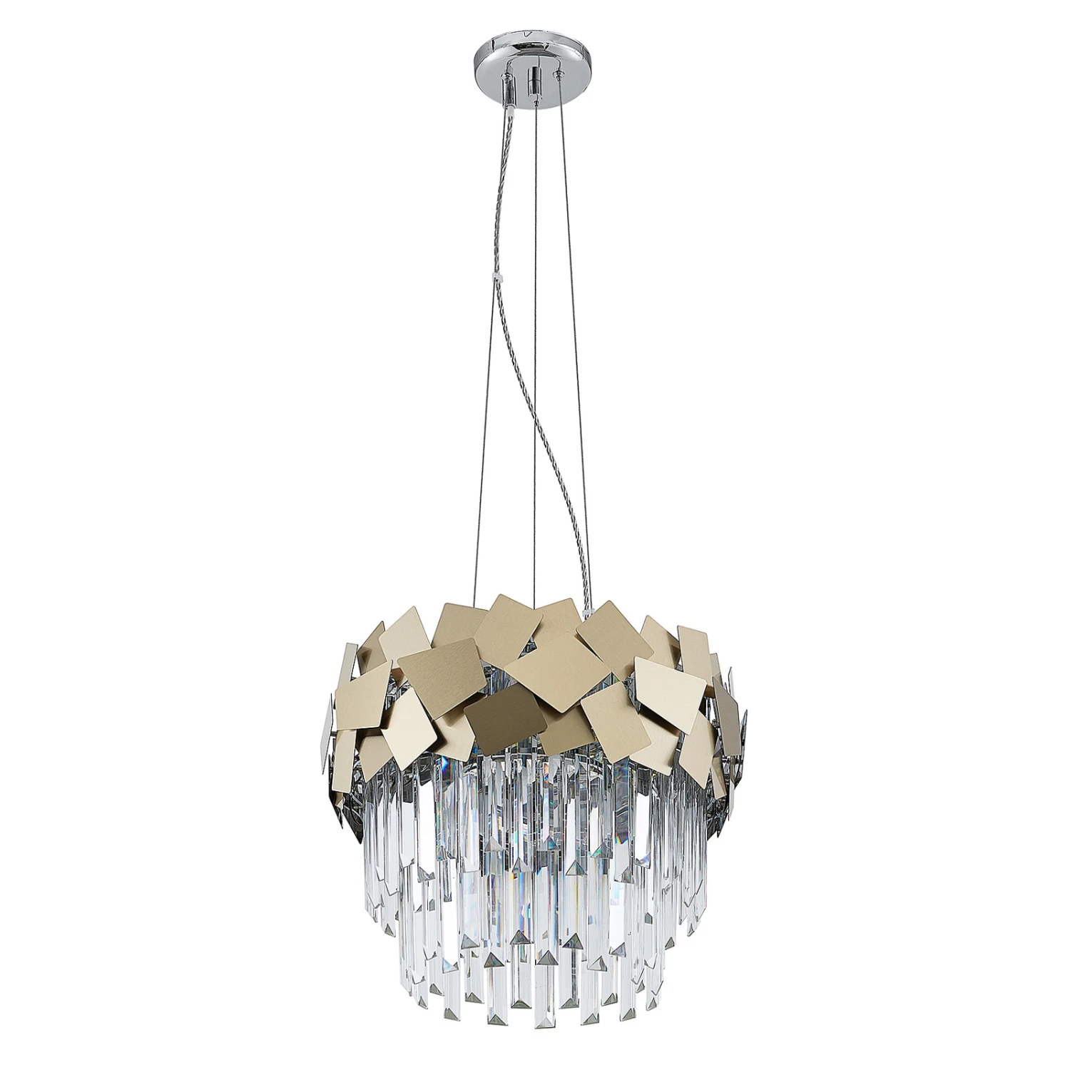 Diese Hängeleuchte präsentiert sich in einem besonderen Design, das dem Raum einen exklusiven Charakter verleiht. Die Basis des Leuchtenschirms wurde mit vielen Edelstahlplatten verarbeitet, die einen goldenen Oberflächenfinish bekommen haben. In der Mitte befinden sich insgesamt drei Ebenen, auf denen zahlreiche Elemente aus Kristall angebracht sind.
