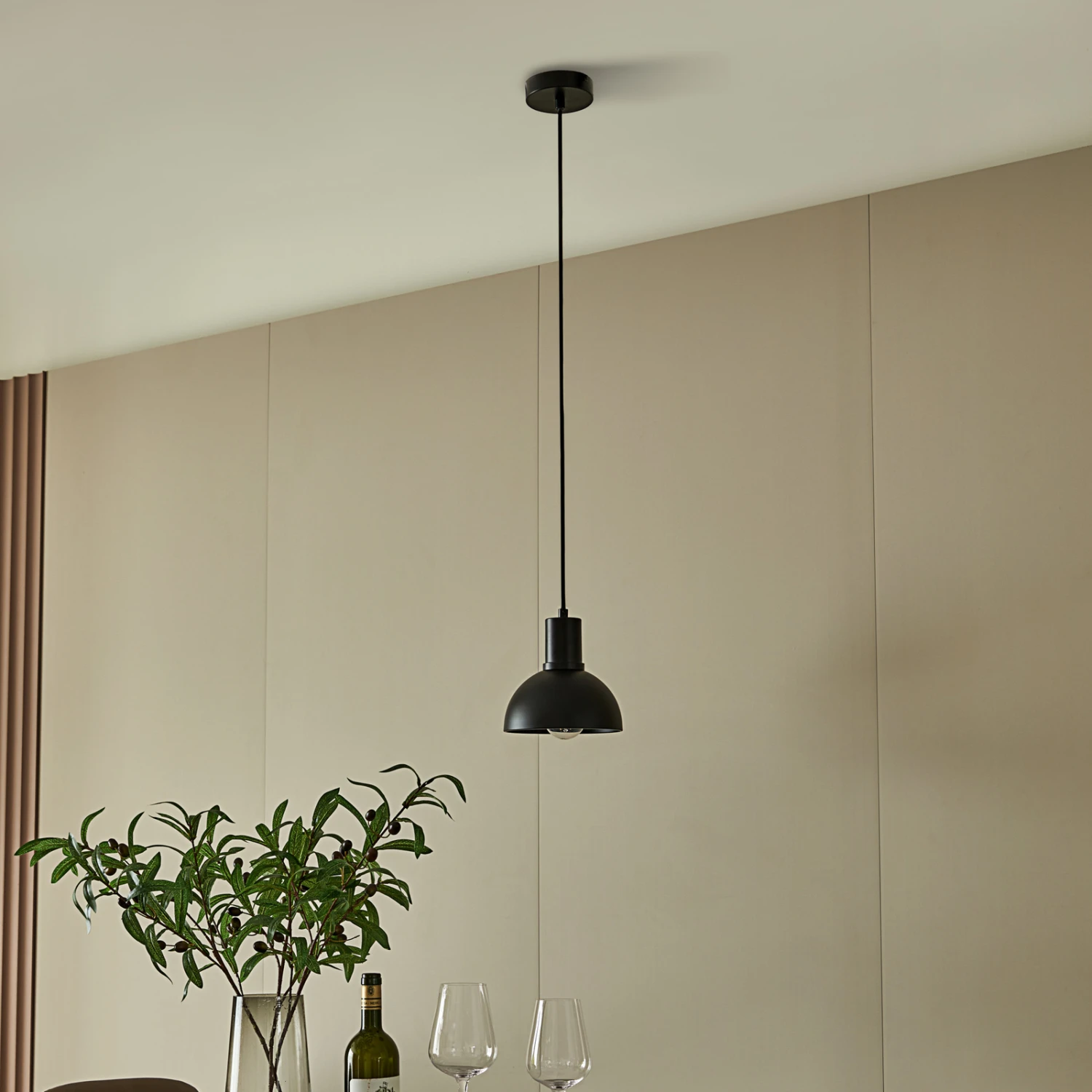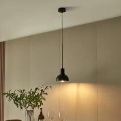 Mostrid besitzt eine besondere und vor allem klare Designsprache und ist ein exklusives Leuchtenobjekt für den Wohnbereich, das auch gut in jene Einrichtungen einziehen kann, die vom skandinavischen Look gekennzeichnet sind und auf stilvolle Klarheit setzen. Der gesamte Leuchtenkörper besteht aus Eisen mit einem matten und markanten Finish in Schwarz, wobei der Schirm rund ist und das Licht nur nach unten entlässt, da Metall bekanntermaßen zu den lichtundurchlässigen Materialien zählt. Daher kann man mit der Pendelleuchte besonders gut Tische und Tresen beleuchten.
